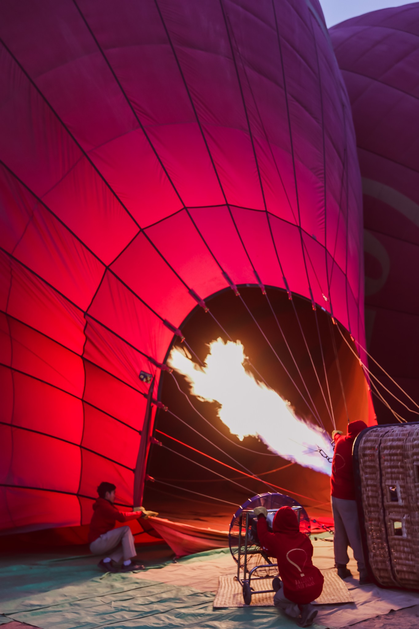 热气球没边有两个篮位,每个篮位可以做4个人,所以整个热气球加上飞行员一共可以坐17个人。开始时工作人员会用一个很大的鼓风机往热气球里充气,充的差不多的时候就会点火,让气球竖直起来,然后我们从两边爬到篮子里。然后Graham会慢慢再点火,调试气球。
