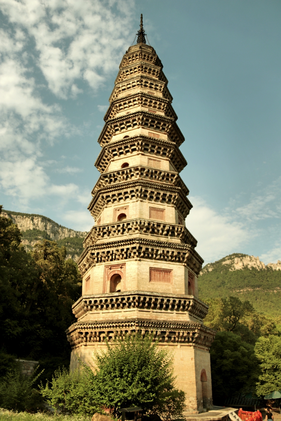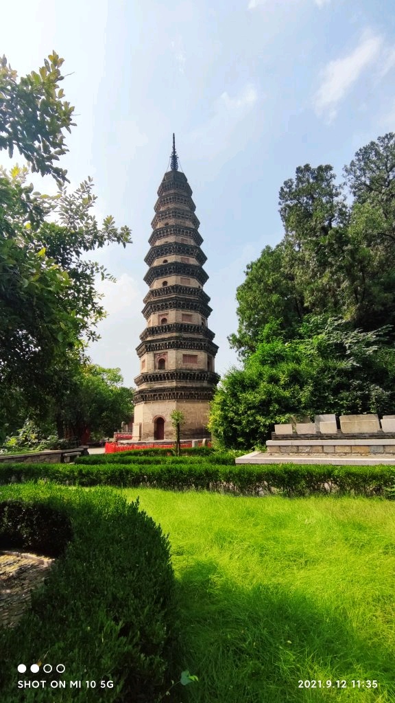辟支佛塔是灵岩寺的主要标志,挺立于千佛殿西北。塔高55.7米,底固长48米,为砖砌,可循级而上。塔座有"阴曹地府"酷刑场面浮雕,塔顶冠有铁刹。古朴的门窗、富有变化的塔檐和纤巧挺拔的塔身,使人感到庄严大方中不失玲珑奇巧。