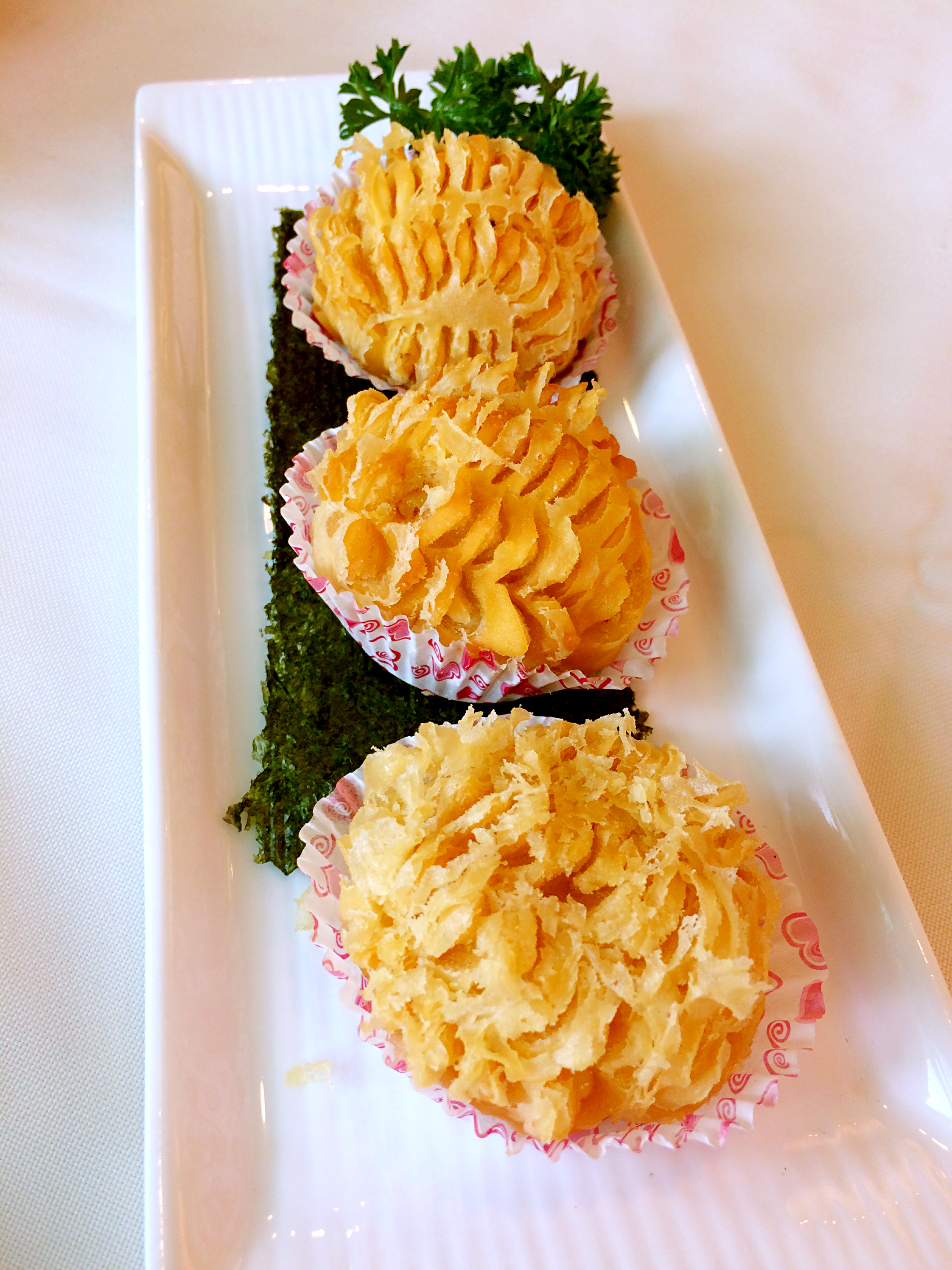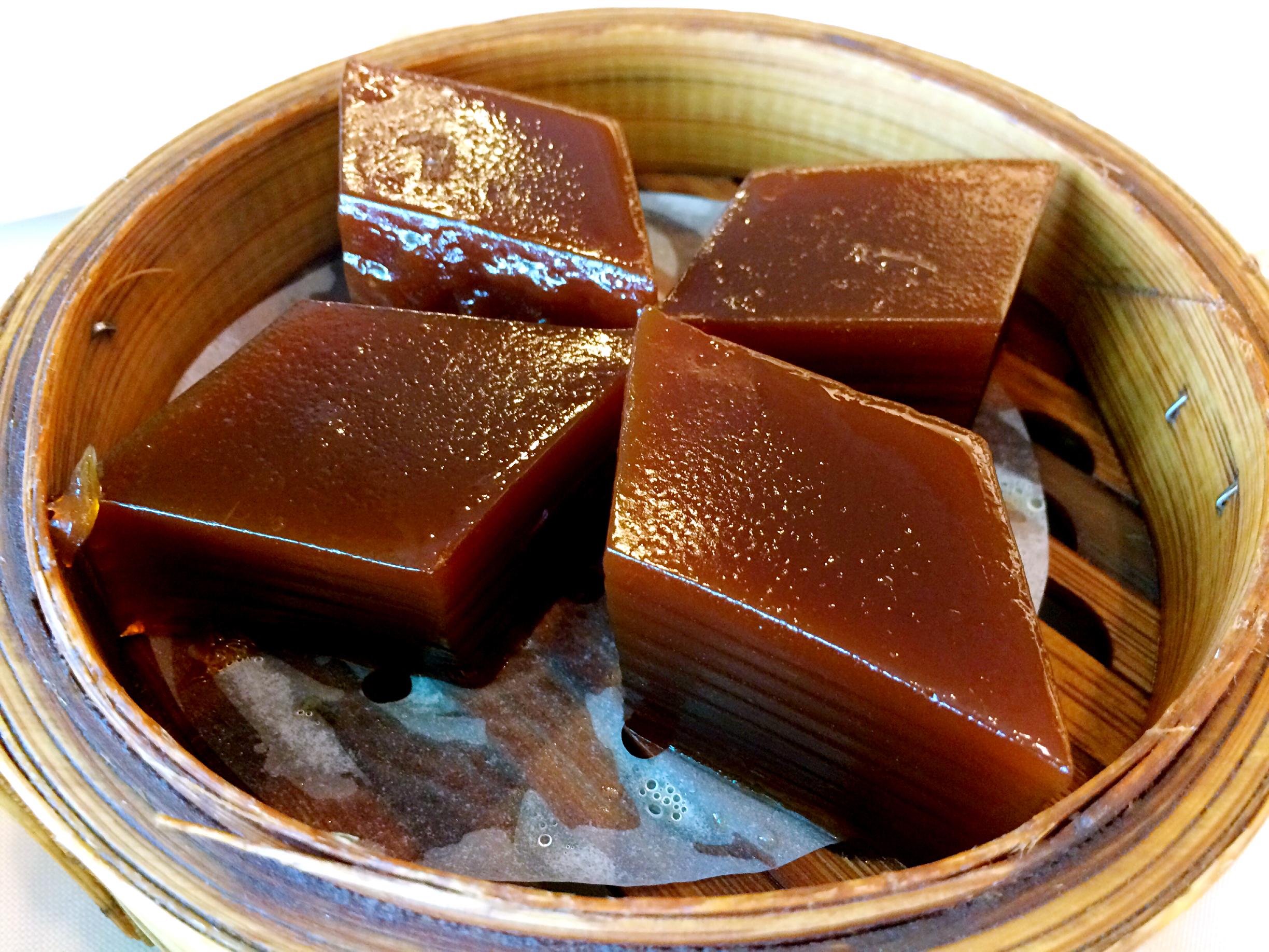 茶水点的寿眉。姜汁撞鲜奶是我最爱的甜品之一。牛奶的温润完美的保留了姜特有的香味,并分解了姜汁的辛辣。蓝莓酸奶挞,冰冰凉的小甜品。传统咸煎饼,酱豆腐味儿的油饼,哦不,油圈。百酱蒸凤爪,依然是我负责鸡爪,板栗先生负责花生豆。对于从不吃鸡爪子的板栗先生,我都无法跟他形容这道菜有多好吃,因为完全没有对比。