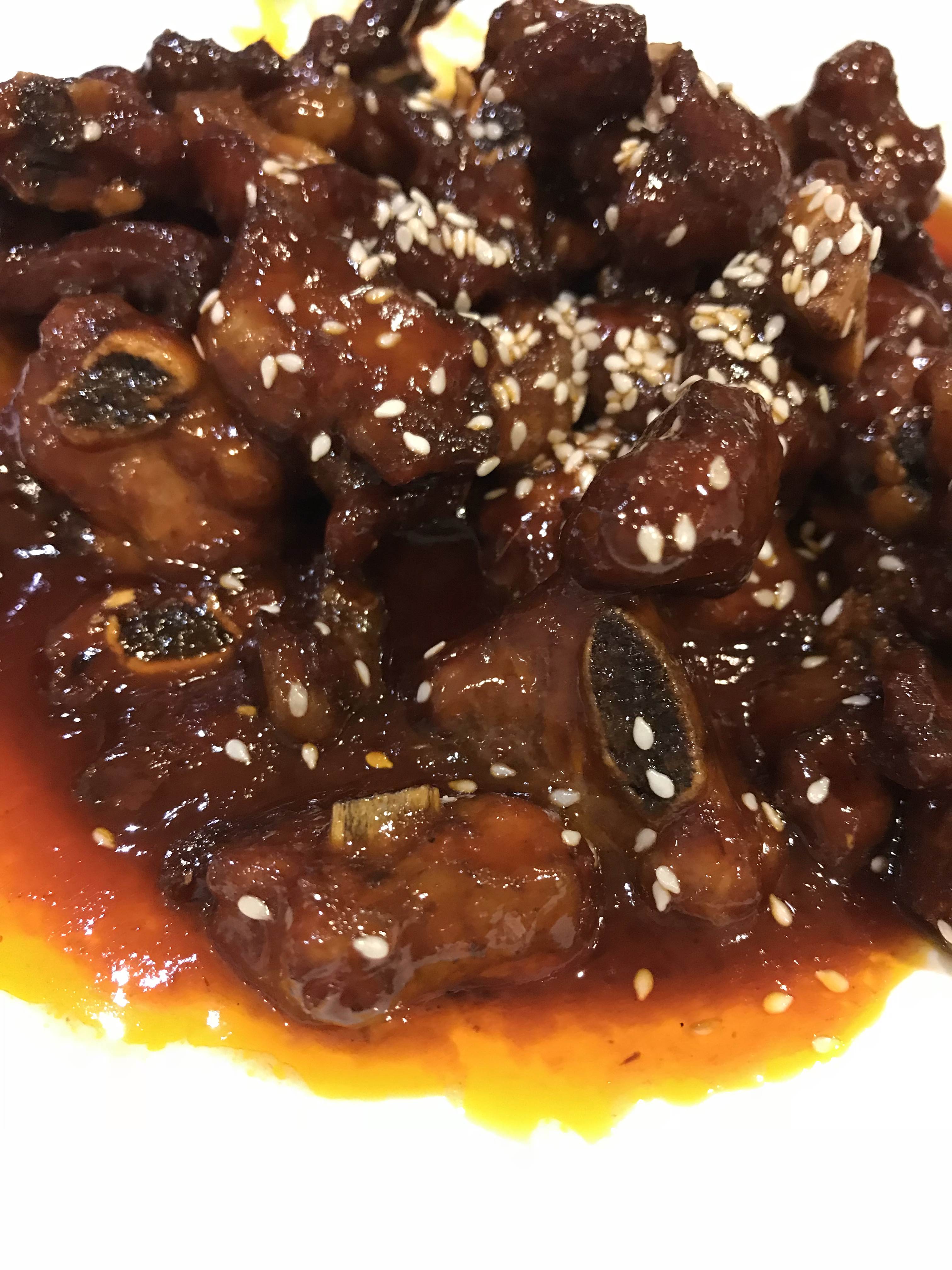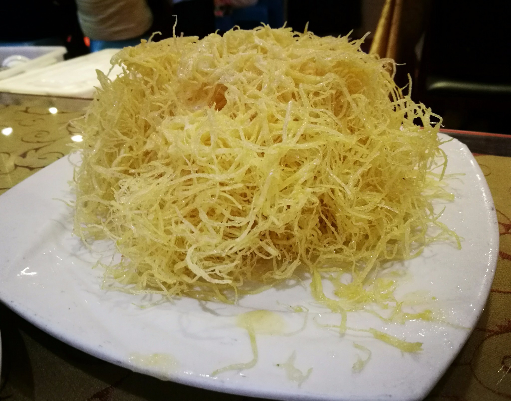 蛋黄洋芋丝:蓬松的摆在盘子上,好像一推塑料线条。炸的芋头丝,咸咸的。