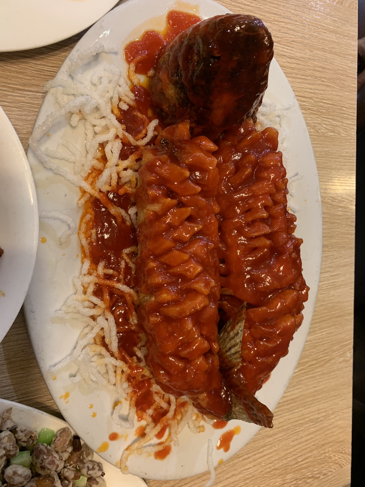 奔着老字号去的,我们一家三口点了四道菜,满意度最高的也就是那个什么红豆什么的那道菜了,松鼠鱼感觉鱼腥味大,离苏州的差远了,招牌饵块鸡,很一般,鸡肉真心不咋地……