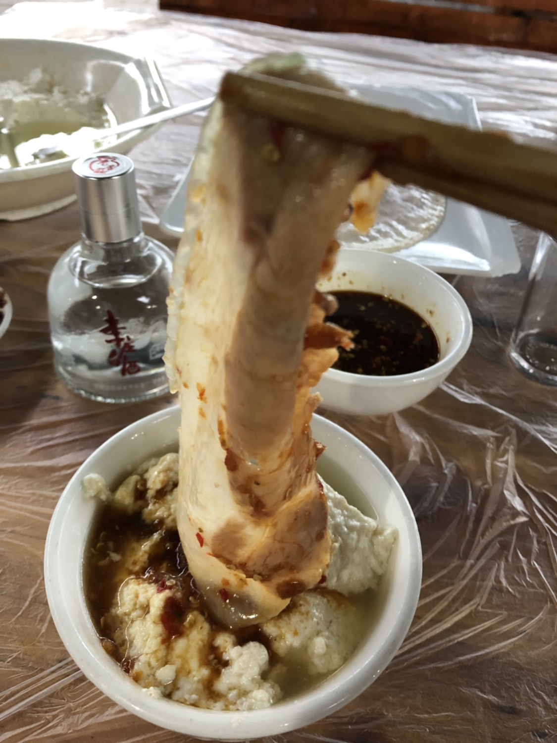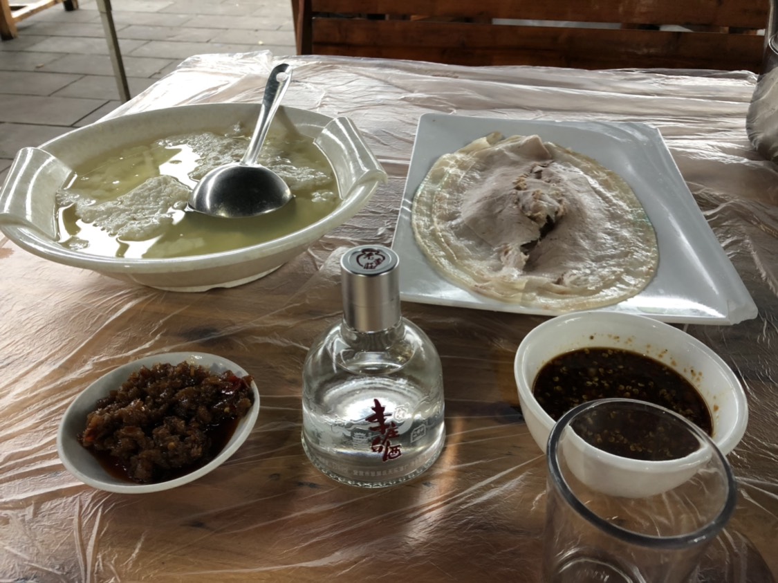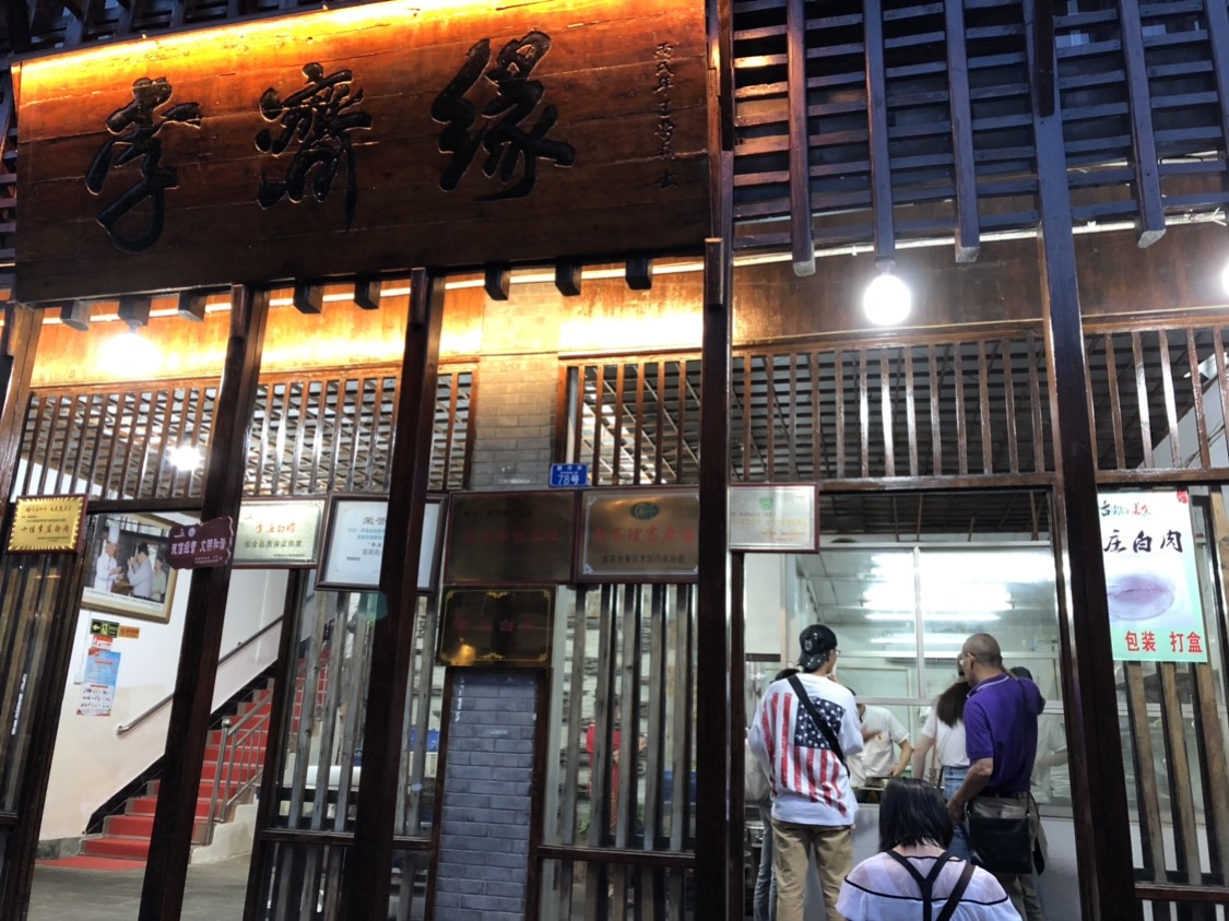 李庄古镇街上卖白肉的店很多,作为一名游客很难去评价哪一家好吃,店家也纷纷用“媒体报道”“与公众人物合影”甚至于“刀工展示”来招揽顾客。随意选了一家,买了一袋真空包装(保质期三天,当天吃的可以现切用外卖盒带走)的带回家中吃(40元,约有8两)。口味一般,吃多会腻,其实白肉做法大同小异,重点在于店家的蘸水配方会给白肉带来不一样的感觉,让人第一口吃肥肉不会那么腻。