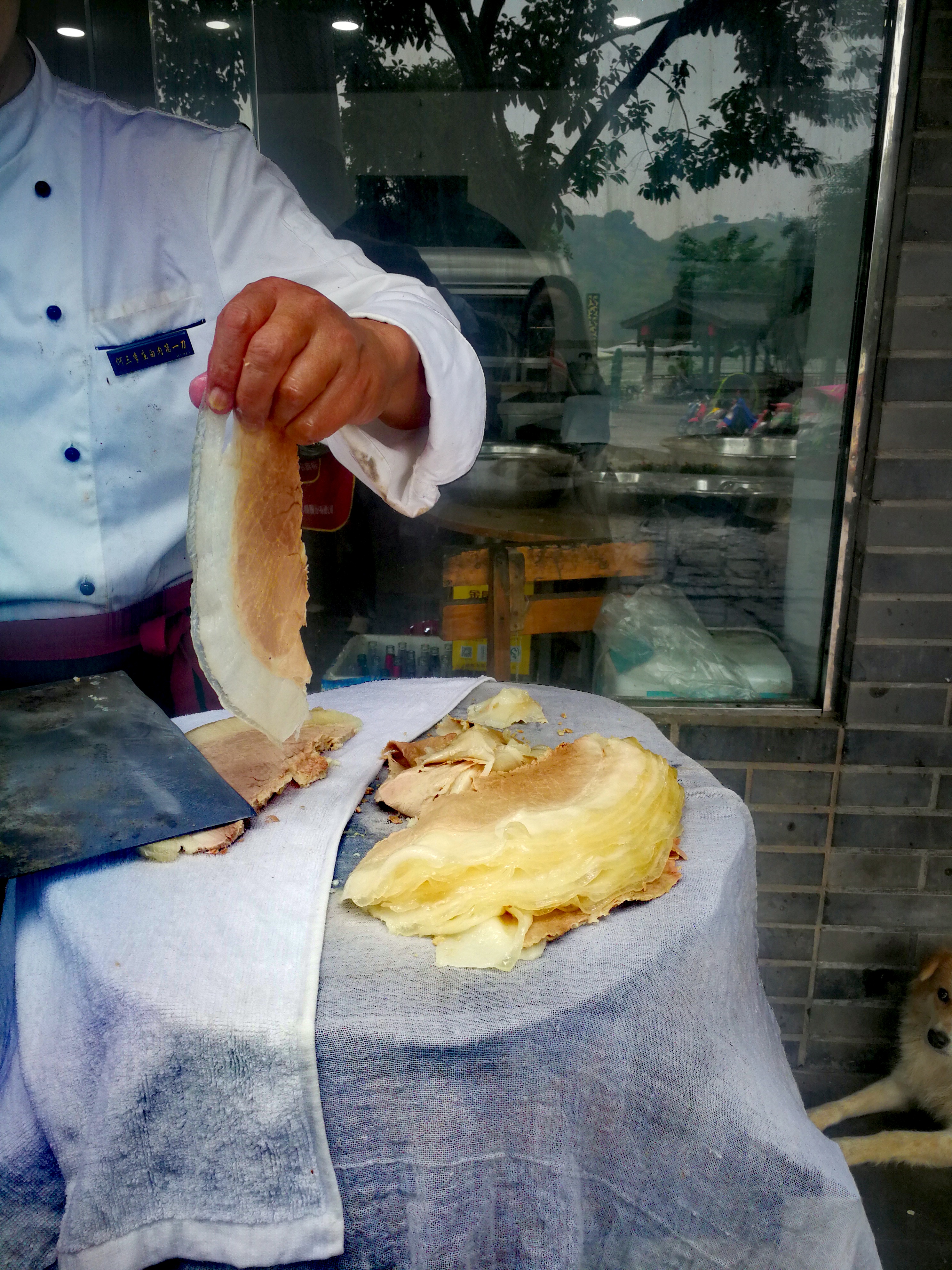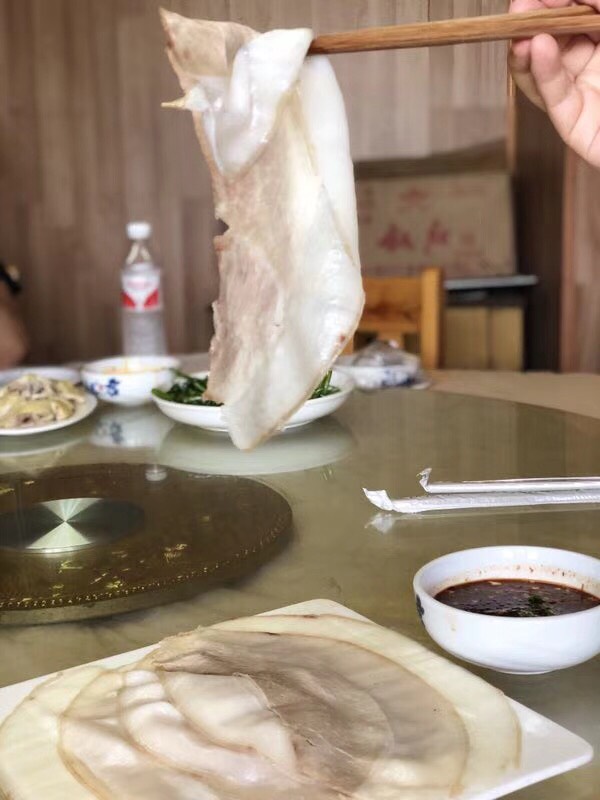 不知道这是哪家店哈,不过去李庄古镇吃还是挺不错的。李庄白肉很大片,也很薄,大小的话,把一张A4纸对折一下差不多