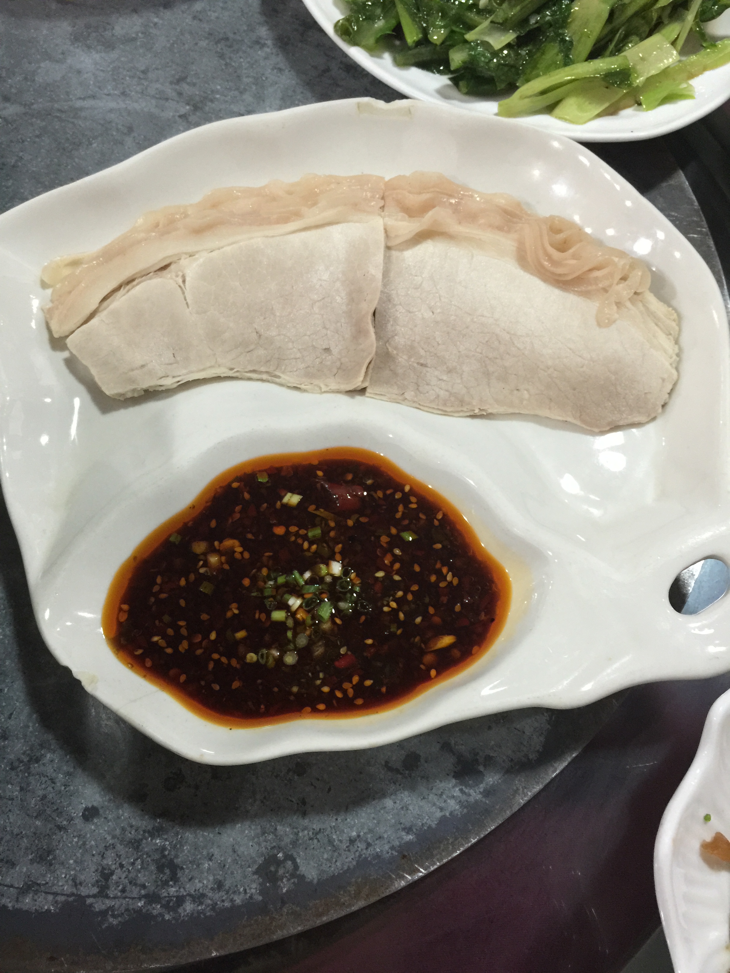 真是白肉,就是一大块肥瘦肉片成薄片罢了,必须蘸汁才行,一般般。