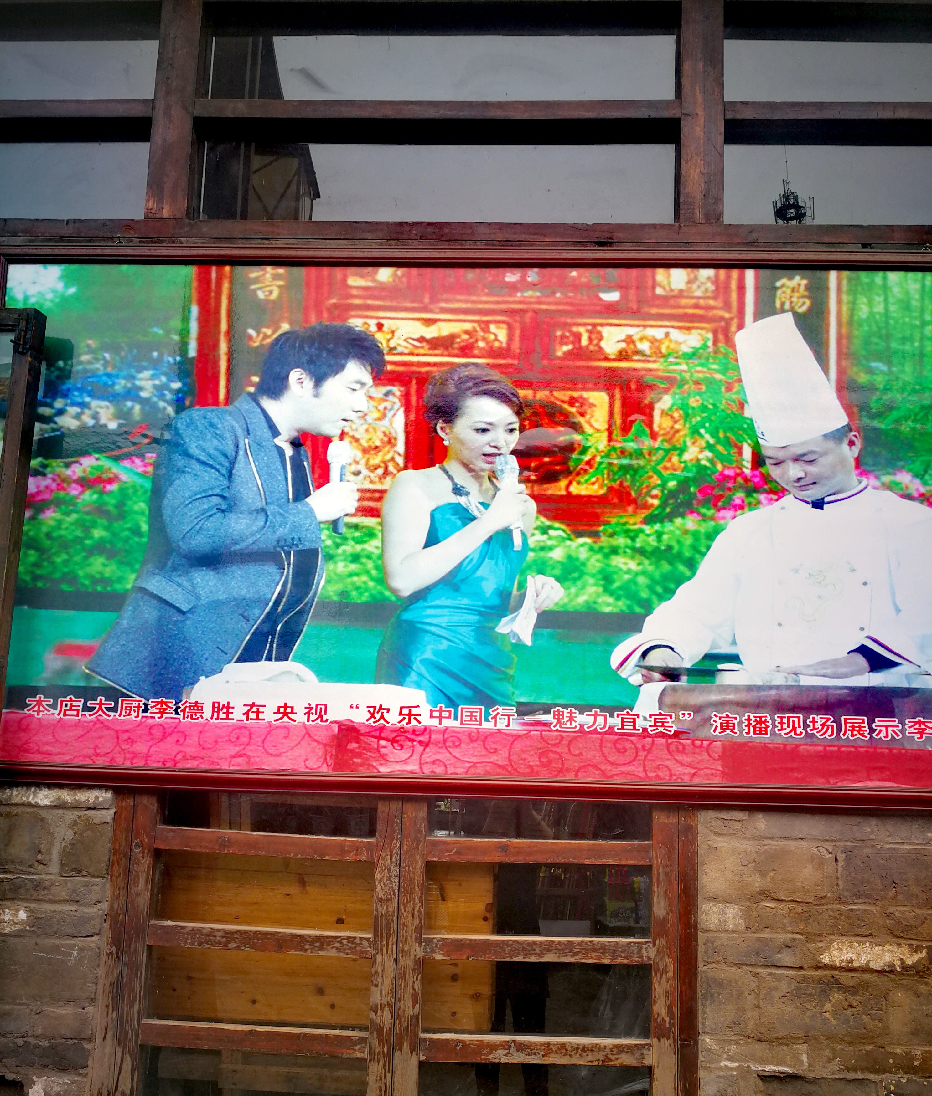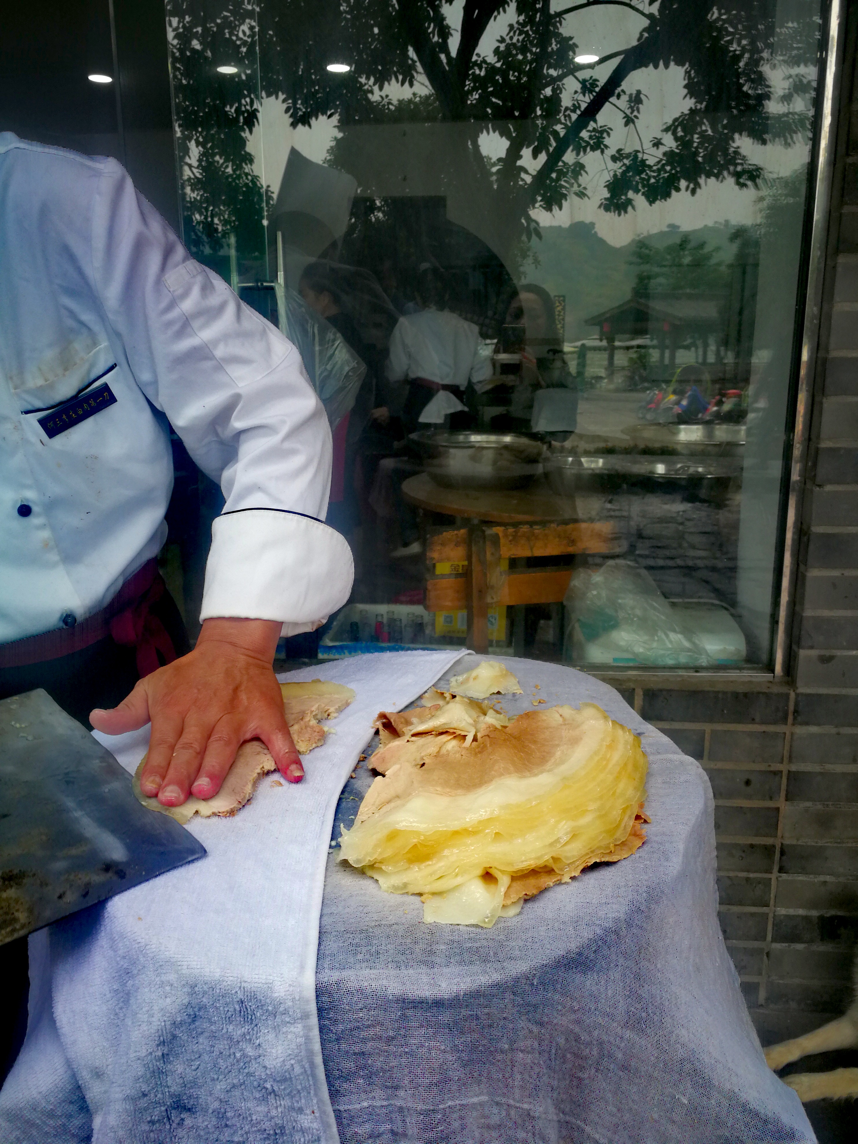 国庆假期最后一天来的李庄,吃的“李济源”饭店,老公说是以前来的时候吃过的。可我拍的照片却是“何三白肉”饭店的大厨师。白肉和家里做的“蒜泥白肉”味道差不多,只是厨师刀功了得。吃两块就够了吧。江边吃饭可以看看江景,不错!