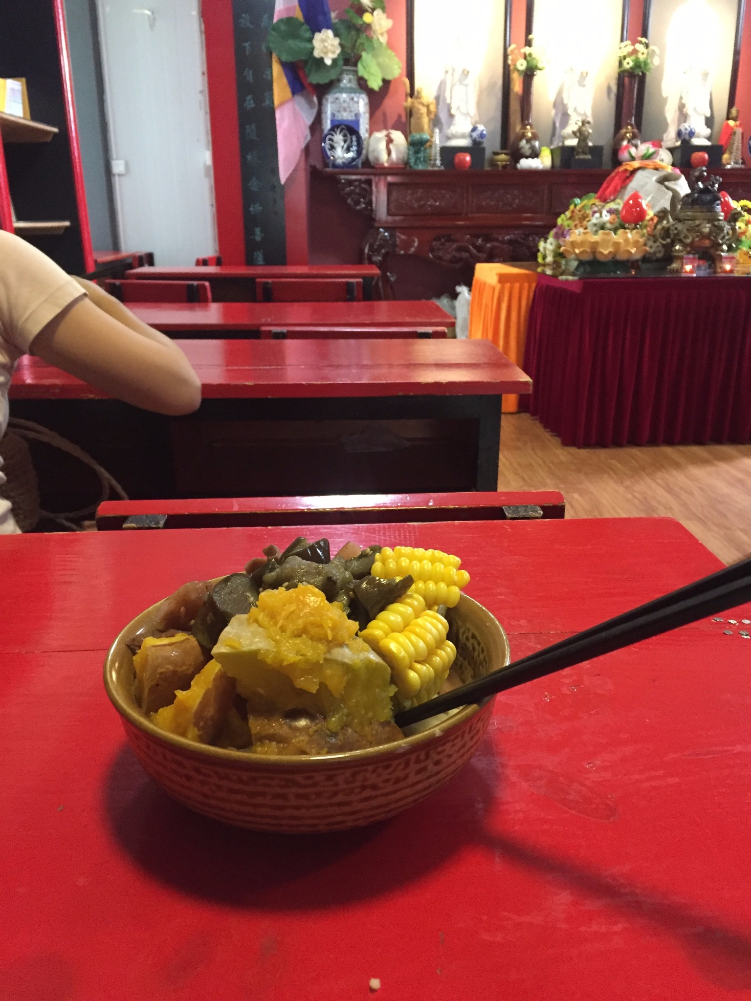 用“吃斋念佛”形容这顿中餐再合适不过,听着佛教音乐,吃着素食,不能说话,不能浪费,虔诚的心让我把南瓜皮都吃掉了,碗里不敢留一粒米,吃完需要自己把碗筷收拾好。
