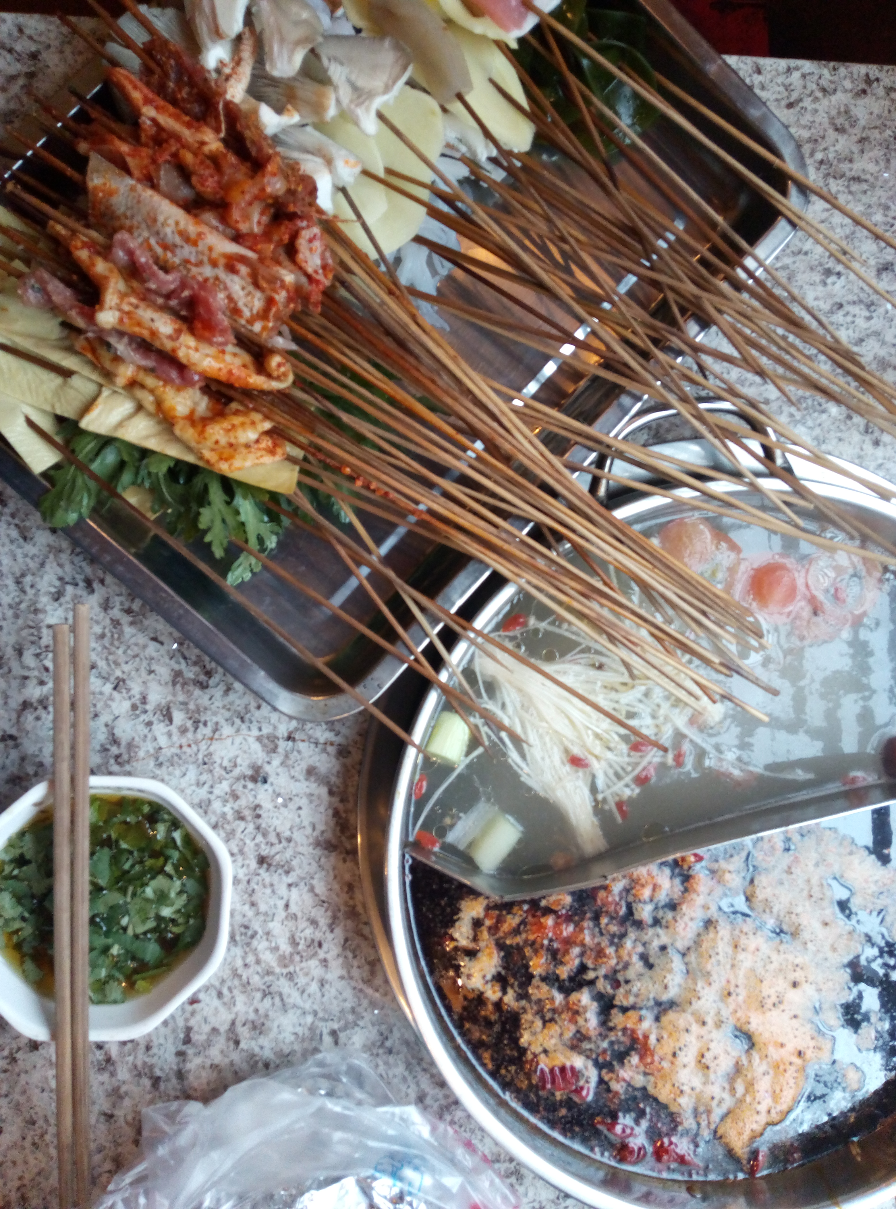 听说这家是真正的串串发源地,辣辣的锅底锅里串串在翻滚,发现我这个一点不能吃辣的人对这一点反应也没有,而对面那个对辣极其热爱的人反而辣的通红了脸。那就是只吃肉类不吃菜,我吃了一片大白菜我才体会到了什么是辣不欲生。
