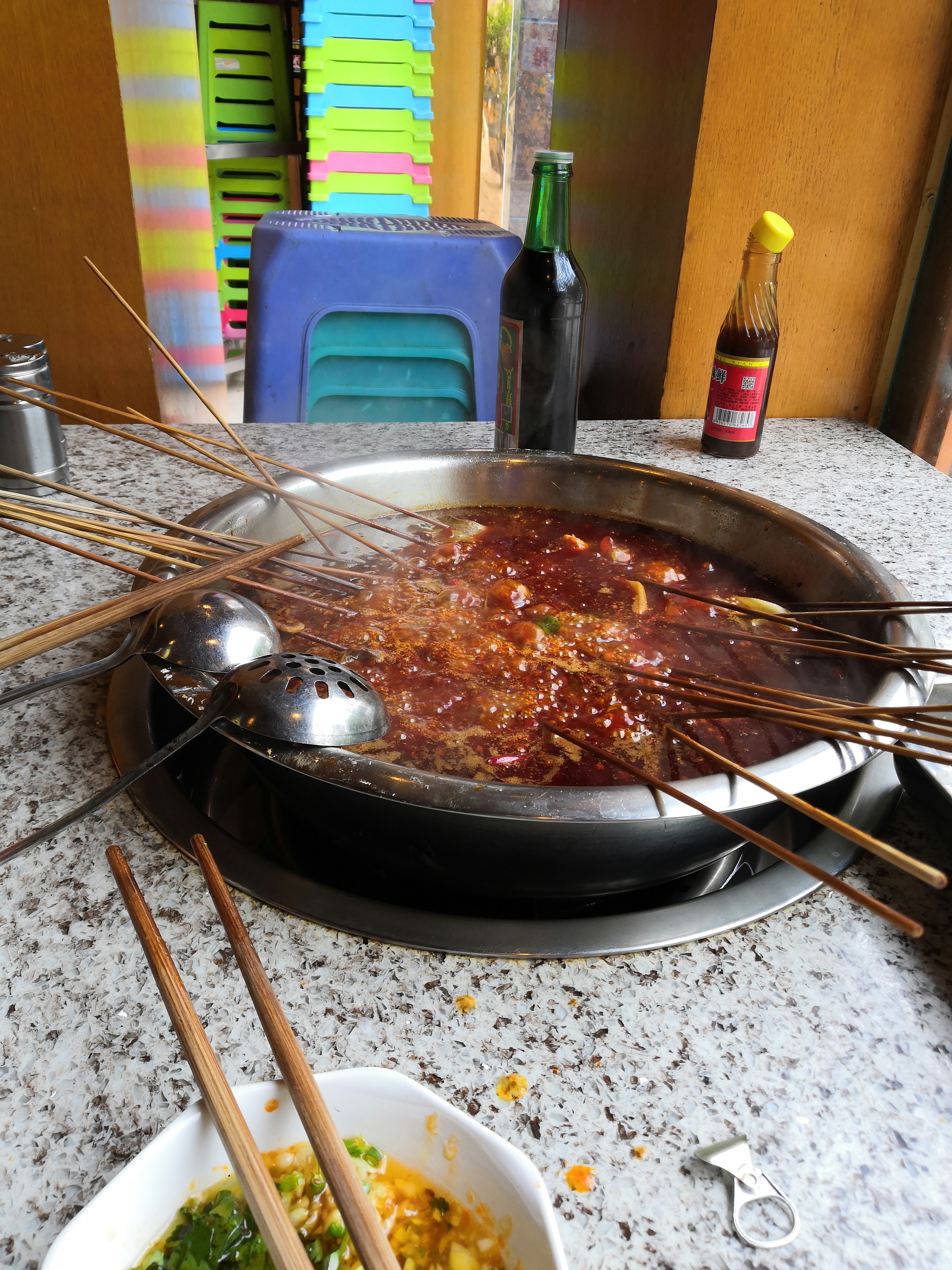 听说这家是真正的串串发源地,辣辣的锅底锅里串串在翻滚,