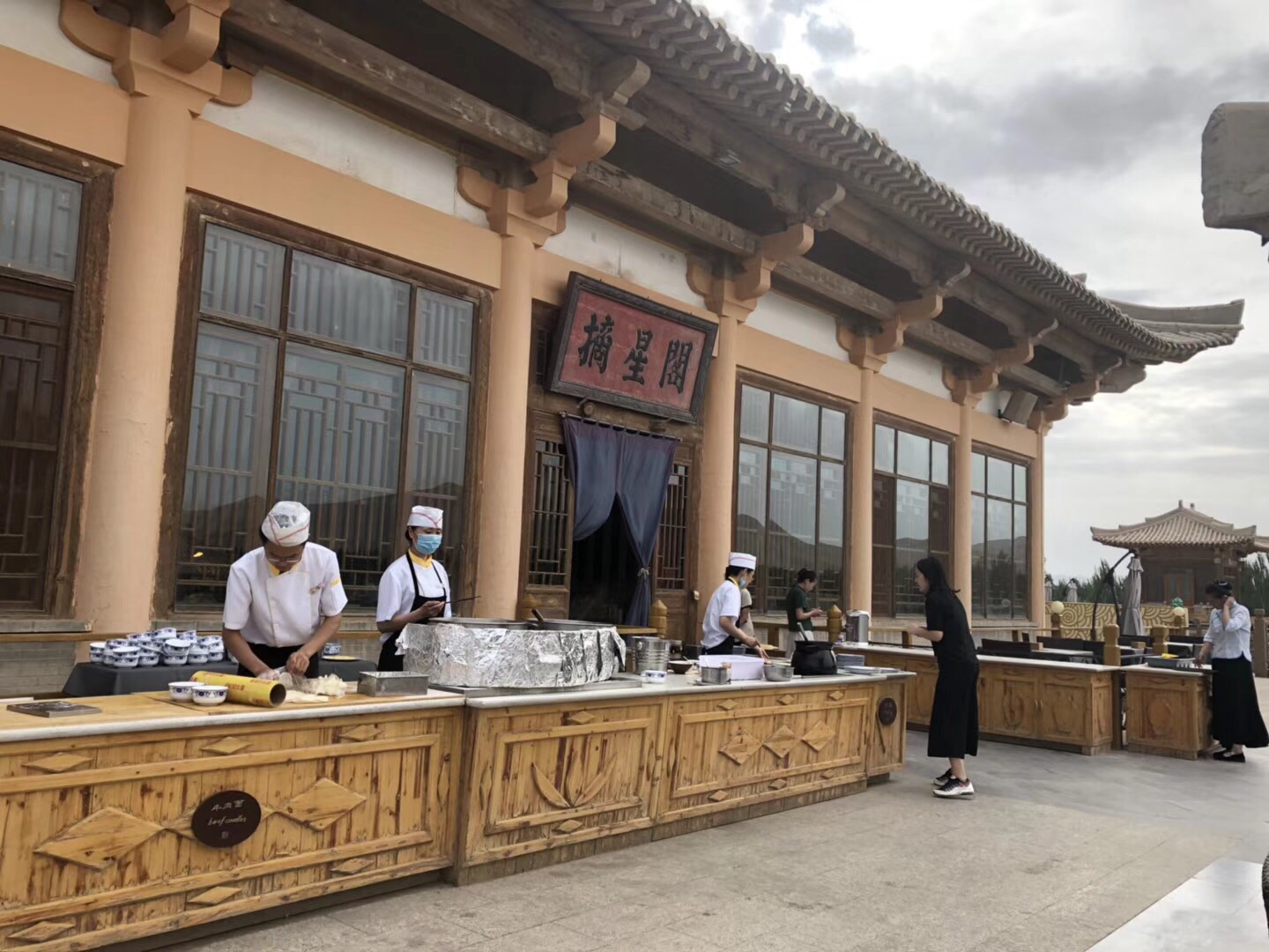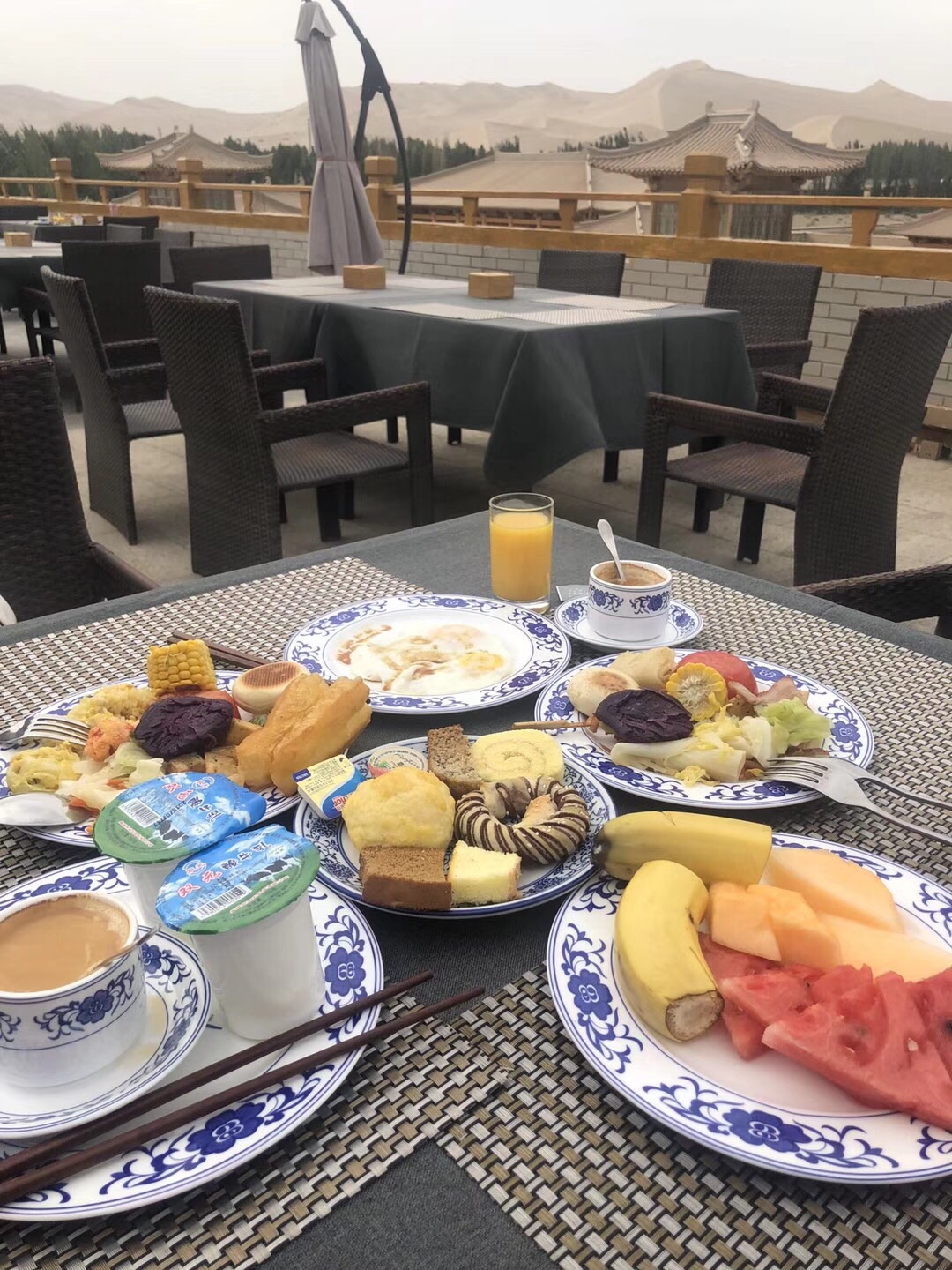 位于敦煌山庄顶楼的摘星阁位置非常的棒,白天可以看到远处的鸣沙山,连绵不断。而到了夜晚景象就完全不一样了,沙漠中的星空格外的美丽,真的是所谓的漫天小星星,我只找出了北斗七星,想必还有很多其他的星座吧。餐厅是以西餐为主,服务很棒,酒店早餐也在这里。