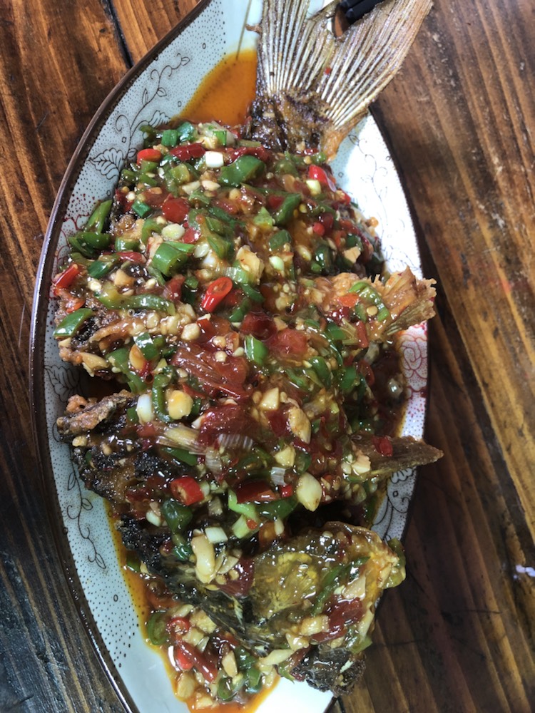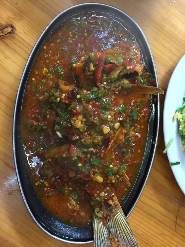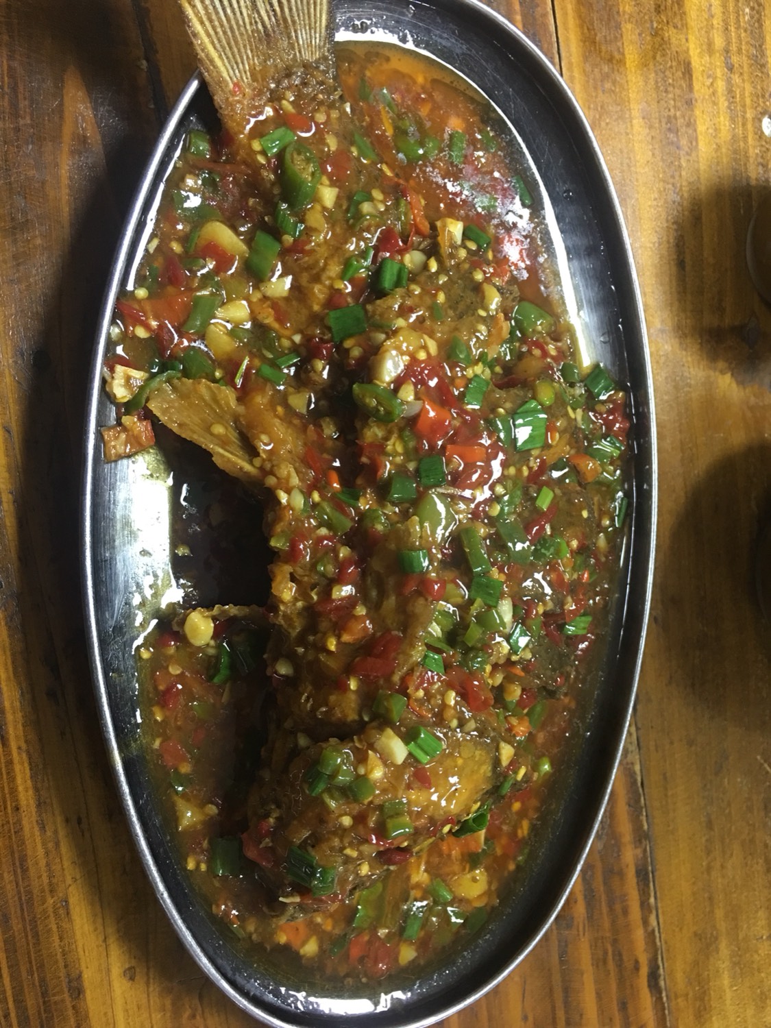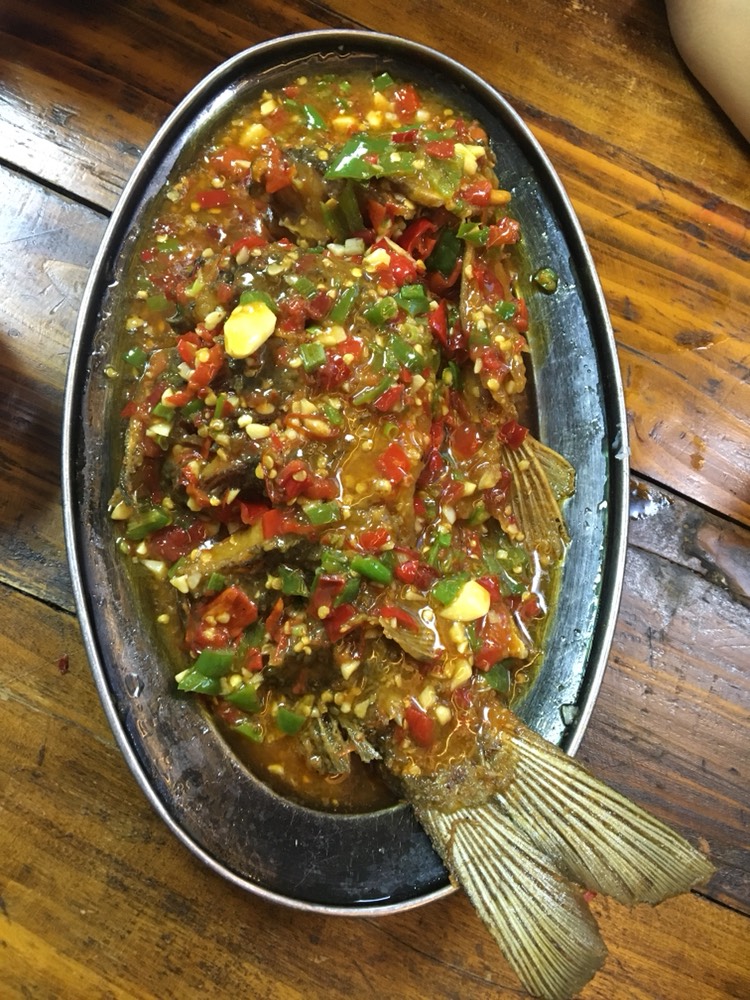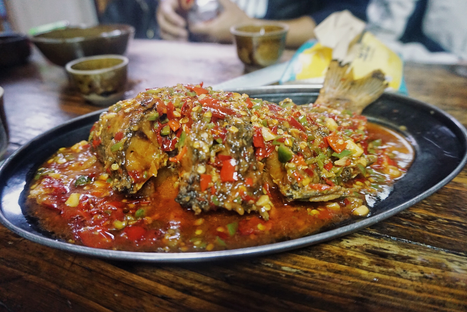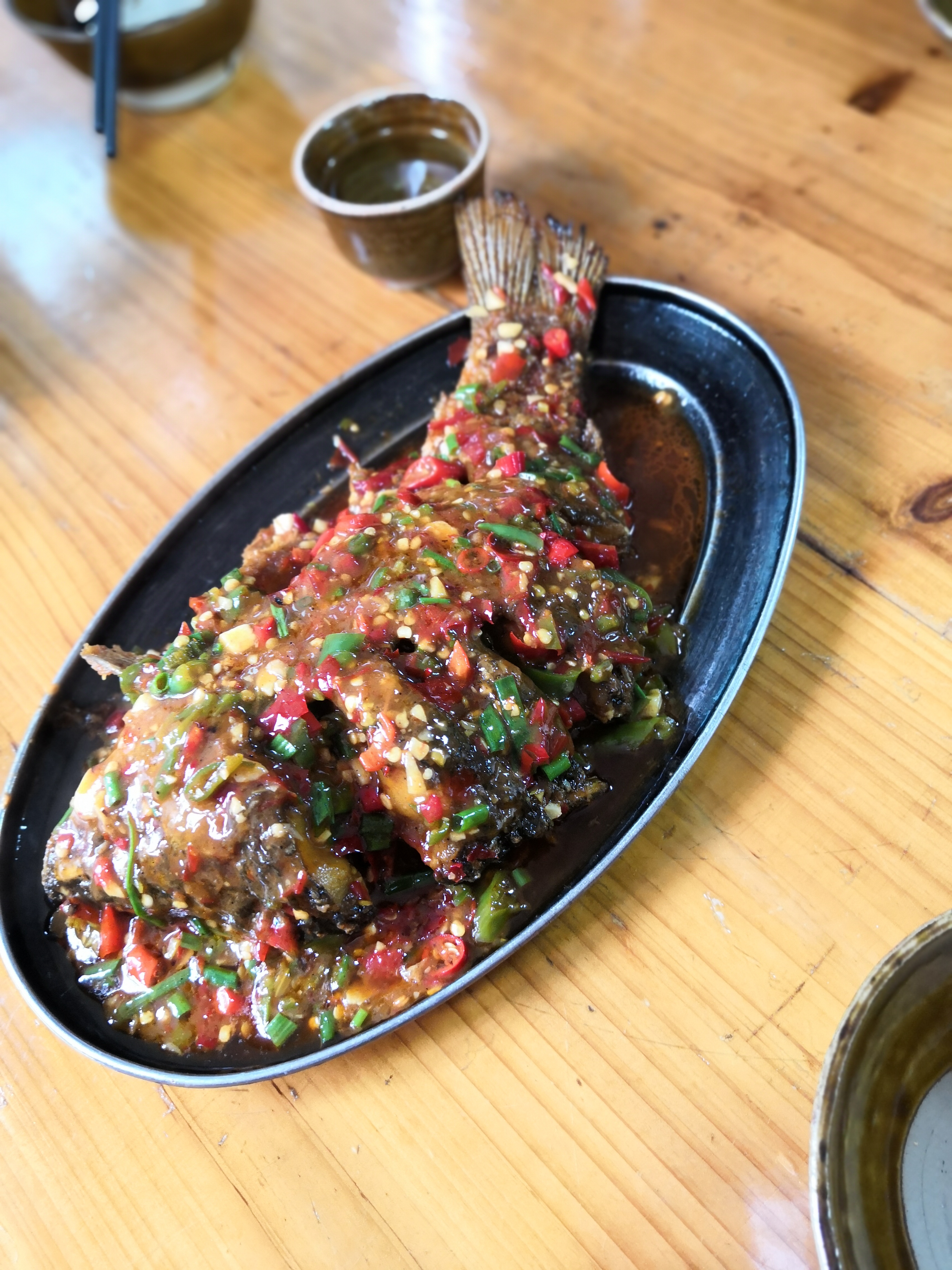 到苗寨真的很推荐去尝尝,糟辣鱼特别好吃,店的位置有点不好找(上海女人旁边巷子进去果蔬超市对面小巷子)但吃的非常值得,两个人,一个糟辣鱼,一个蕨菜腊肉,一个西红柿炒鸡蛋,100块钱,特别划算,老板老板娘人都好好