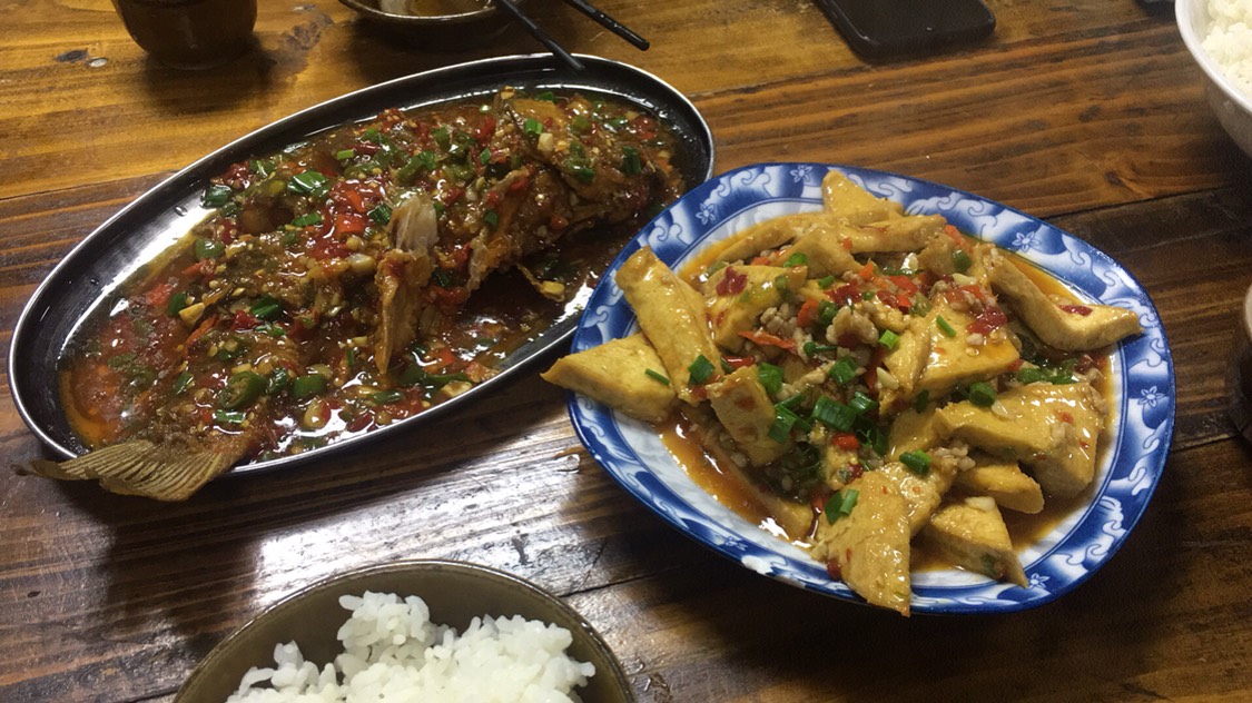 不在主街,在一条小巷子里,网上能搜到,是夫妻俩开的,老板娘笑嘻嘻的招呼客人,老板只顾在后厨忙着炒菜。去的时候店里还没有人,所以上菜超快,招牌菜糟辣鱼、蕨菜炒腊肉、苗家豆腐等,每个都超好吃,一个雷都没有