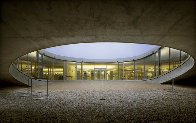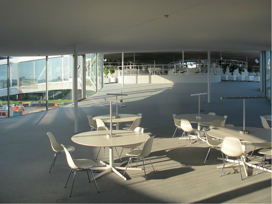 波浪型的地面赋予建筑灵活开放的平面,流动的空间通过14个不同尺寸的结构体量来控制和限定,并形成一系列圆形的外部天井。天井由玻璃围合,作为开放的交流空间,为室内外提供了有效的联系。在建筑内部较高的区域,人们不仅可以看到学校的景色,而且可以欣赏到壮观的日内瓦湖和阿尔卑斯山的美景。