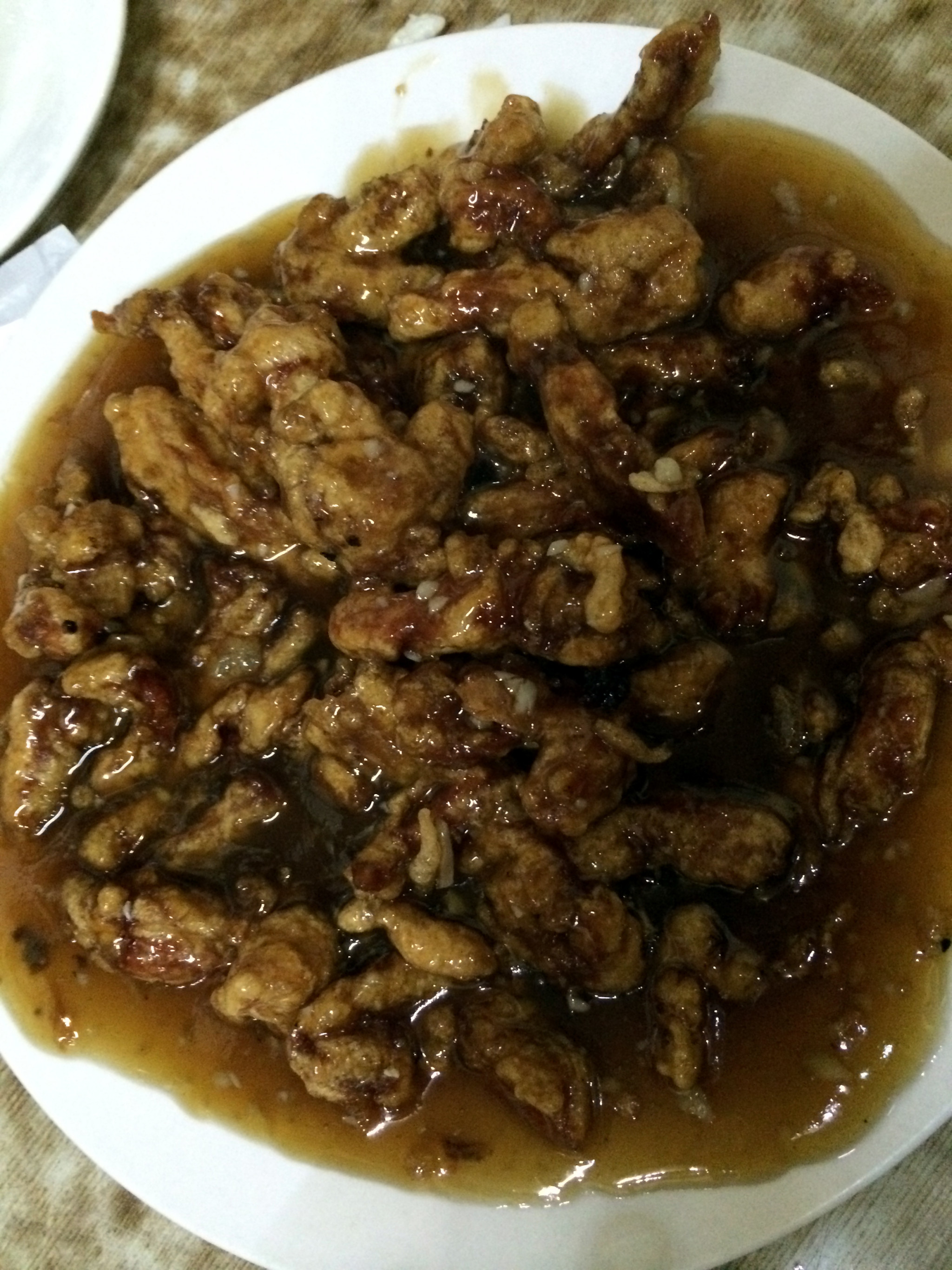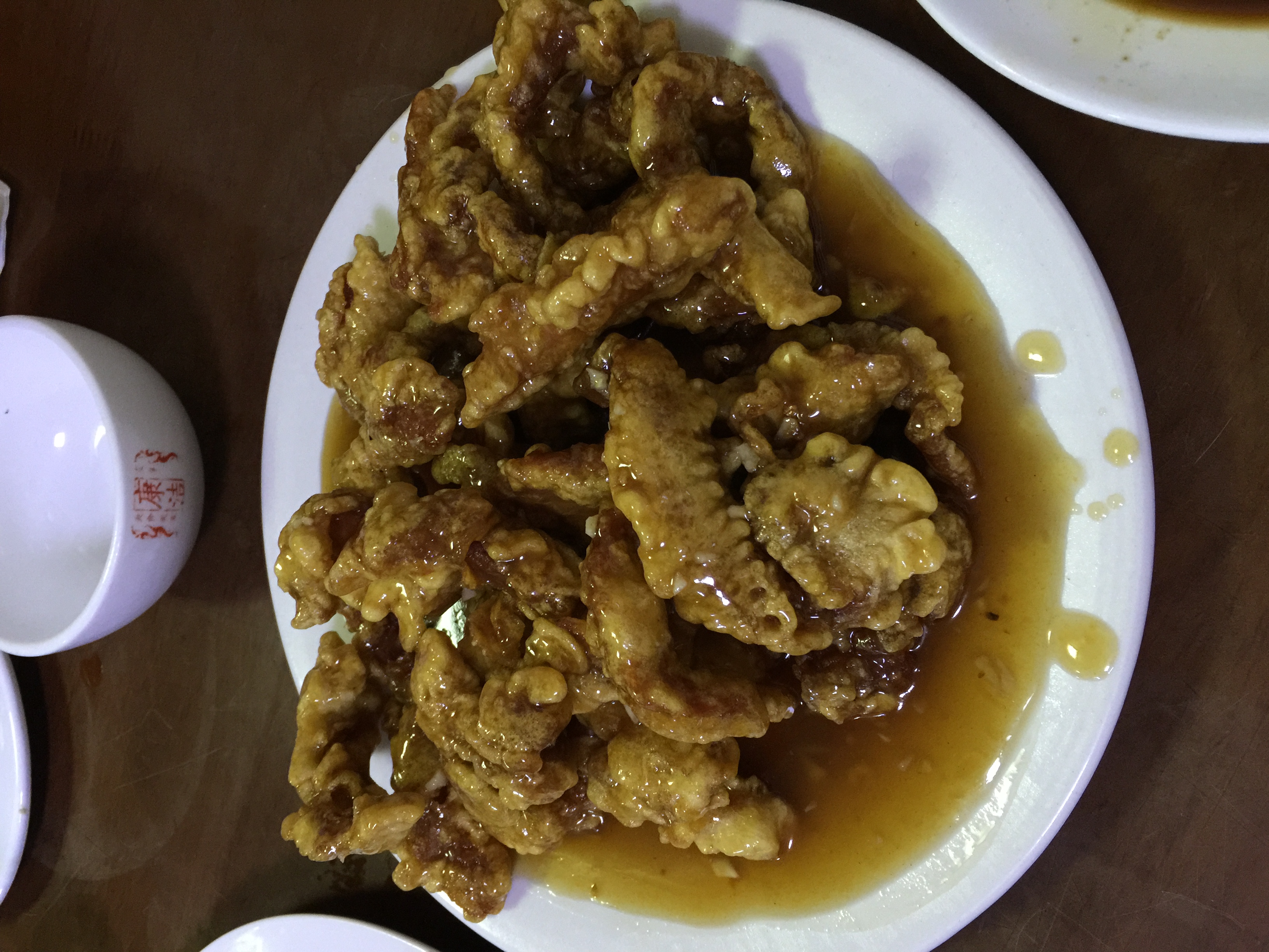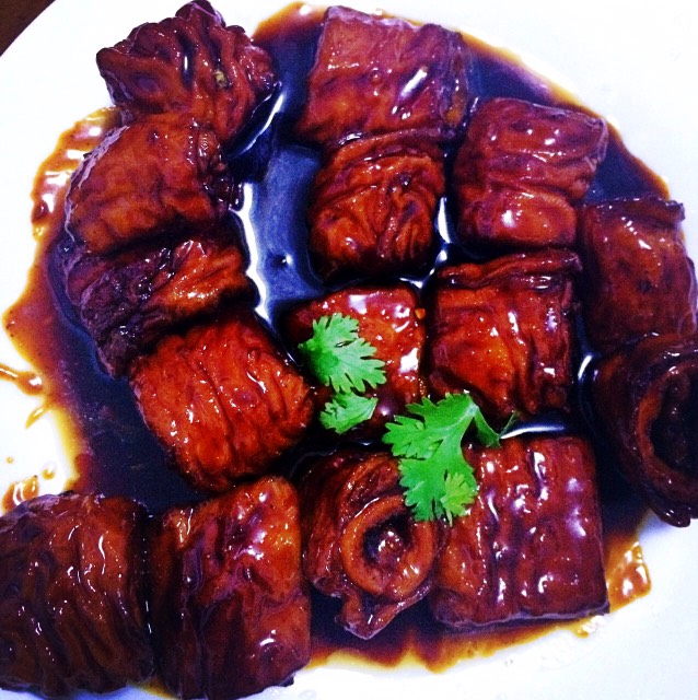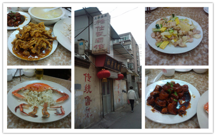 看到了已经褪了色的招牌,果然是个不起眼的小店。但据说这里的掌勺人是鲁菜的第几代传人,鲁菜正宗。小小的屋子只有五六张桌,皆坐满了人。和毕业后一直未见的超拥抱,与敏寒暄,开始点菜:九转大肠、芙蓉全蟹、糖醋里脊、奶汤白菜,全是这里的招牌菜。九转大肠有肠子特有的味道,又裹着糖色,甜甜得略有点淡淡的苦,一点也不腻人;糖醋里脊真的是外焦里嫩,上面淋的汁酸甜可口;芙蓉全蟹外观很有特色,镶着三个红点点的蟹壳,菜是蟹肉裹着鸡蛋,味道倒没有觉得特鲜香。