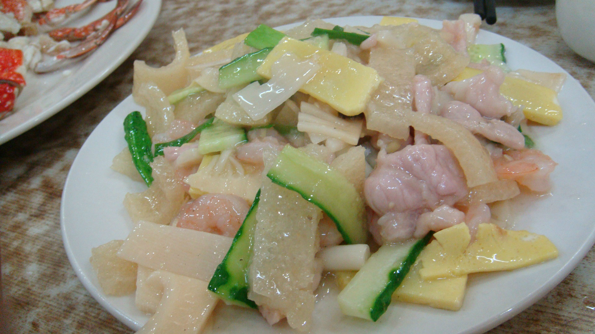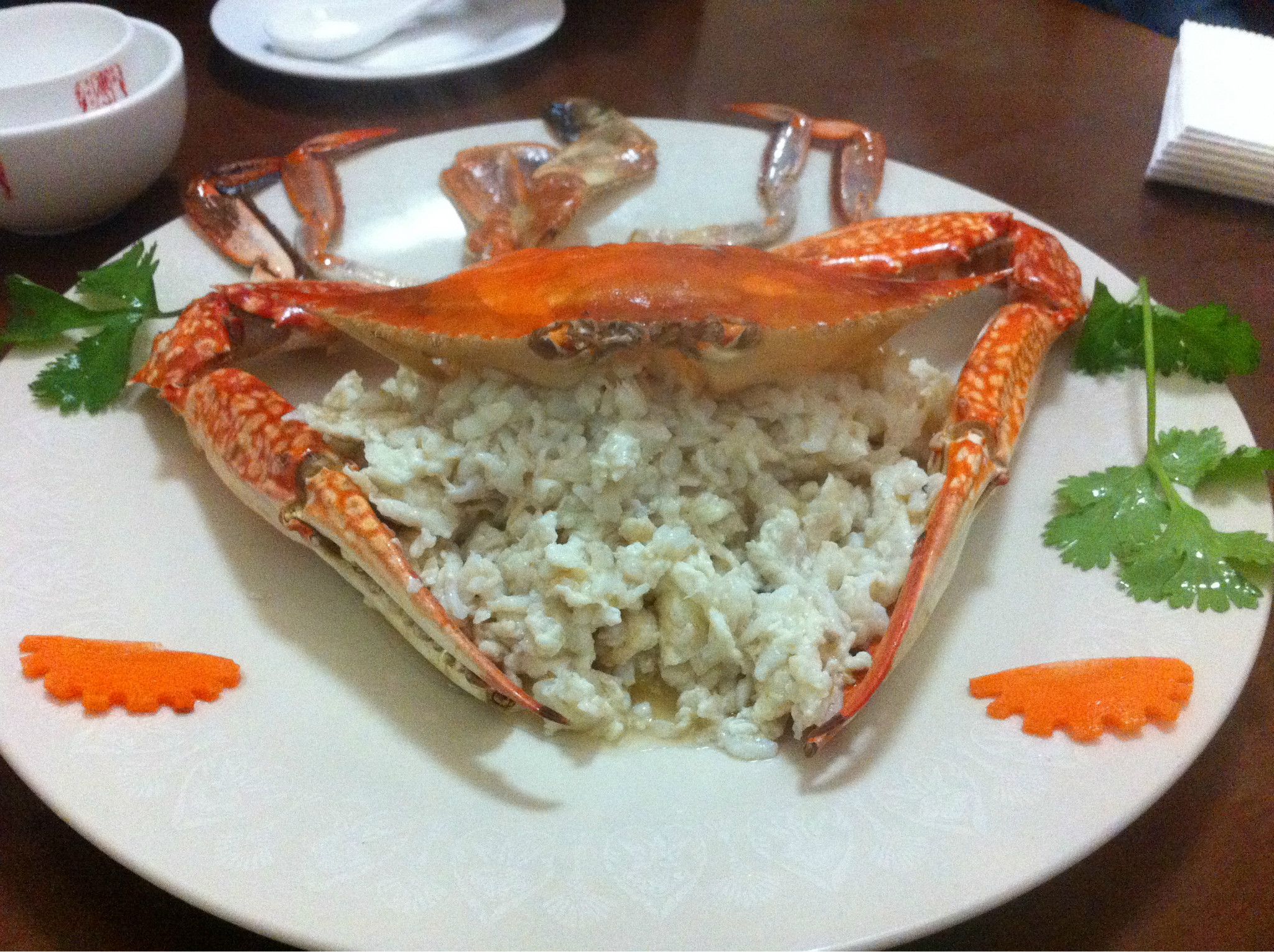 九转大肠看颜色应该是咸带着酸甜口的预设放入嘴中,结果入口除了大肠滑腻腻的口感和同预期里的酸甜味对上味蕾之外,竟然品到了一丝微苦。本以为是不是炒的过了点儿,回来后仔细查了下,原来九转大肠,应该算是鲁菜里真正的五味调和的典范了,正宗的九转大肠,除了咸、甜、酸做主味,还有一丝丝隐隐的辣以及就应该带着点苦!可惜吃的时候孤陋寡闻,还评价这家不够地道。葱烧海参和它也异曲同工,看到一只螃蟹壳“护住”白花花的一大盘可别惊讶,并不都是它的肉哦,其实是鸡蛋白炒蟹肉,蟹肉碎在清香的蛋白里,要仔细吃才可以吃出来,不过鸡蛋白经与蟹肉一炒,鲜度立马多了三个加号。滑炒里脊丝看起来卖相清淡,其实却很讲功夫
