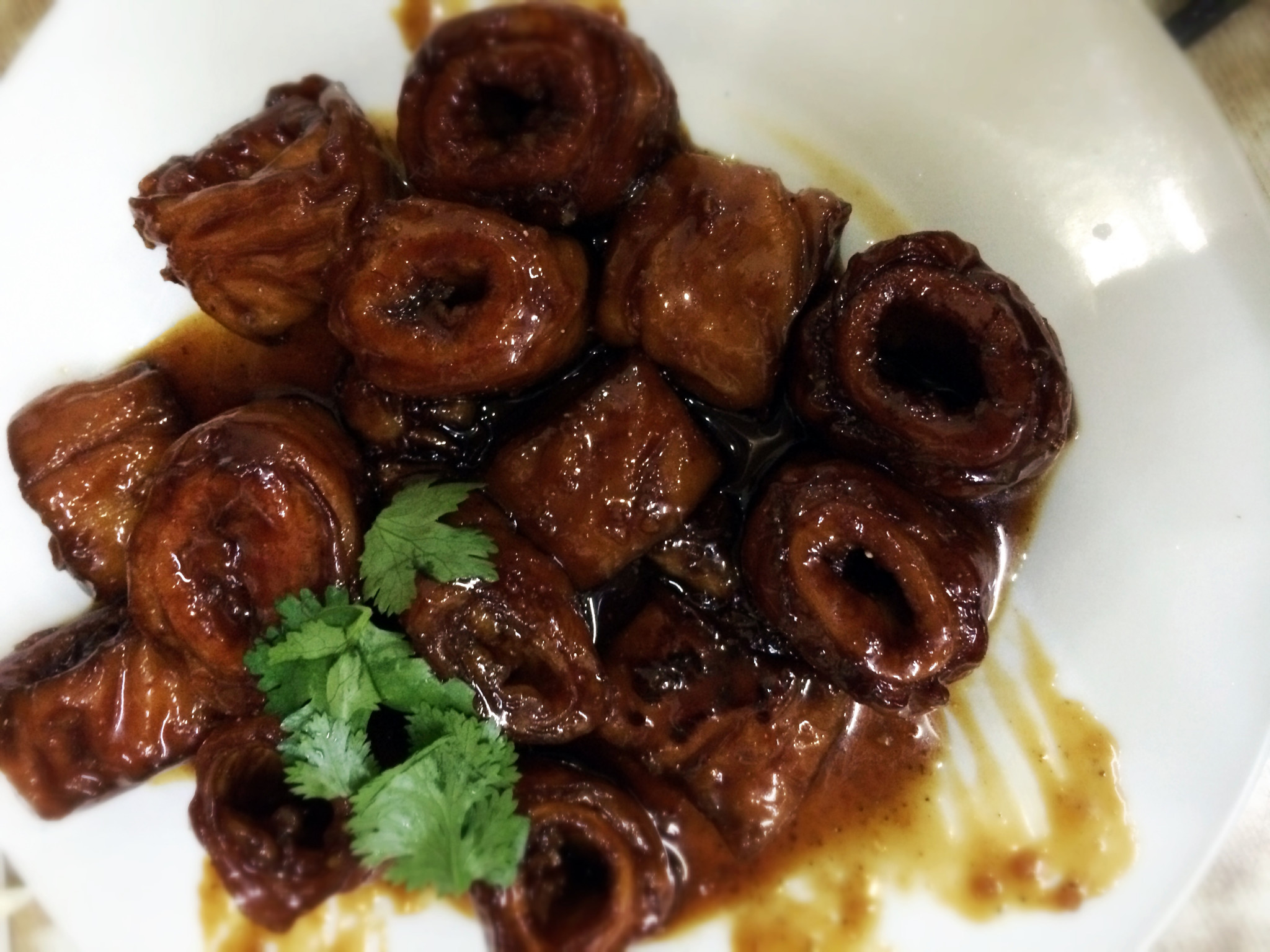 雅仕聚坐落在山大中心校区附近的一条隐蔽的小巷里,和金陵轩鲁菜馆是邻居,本着深巷尽头必出美味的原则,这家也是在寻吃清单里必去的馆子。门脸非常小的一家店,平房连着平房,里面暗暗的一间套一间,座位还是不少的,但即使如此,饭点时坐的满满当当,据说有时候还要提前预约,菜单上尽是鲁菜的传统各色,坐定点菜,手写版,鲁菜扛把子之一九转大肠走起,另外又尝试了芙蓉全蟹、滑炒里脊丝和奶汤花菜。九转大肠看颜色应该是咸带着酸甜口的预设放入嘴中,结果入口除了大肠滑腻腻的口感和同预期里的酸甜味对上味蕾之外,竟然品到了一丝微苦。本以为是不是炒的过了点儿,回来后仔细查了下,原来九转大肠,应该算是鲁菜里真正的五味调和的典范了,正宗的九转大肠,除了咸、甜、酸做主味,还有一丝丝隐隐的辣以及就应该带着点苦!可惜吃的时候孤陋寡闻,还评价这家不够地道。葱烧海参和它也异曲同工,看到一只螃蟹壳“护住”白花花的一大盘可别惊讶,并不都是它的肉哦,其实是鸡蛋白炒蟹肉,蟹肉碎在清香的蛋白里,要仔细吃才可以吃出来,不过鸡蛋白经与蟹肉一炒,鲜度立马多了三个加号。滑炒里脊丝看起来卖相清淡,其实却很讲功夫吃起来当然既不是面香也不是油香,而是肉的鲜香。另一道奶汤花菜,依然是奶汤打底,内容上从排骨换成素菜,能品出奶汤本身的浓醇鲜香。