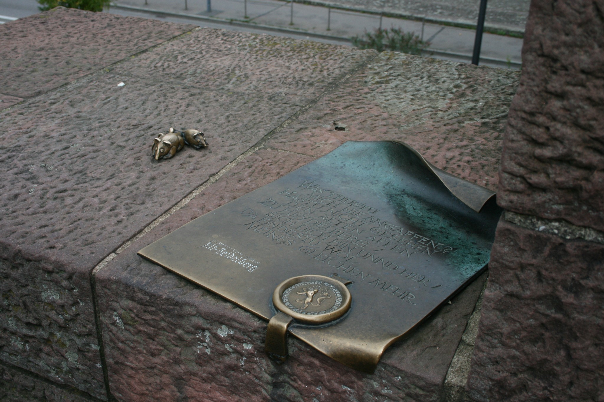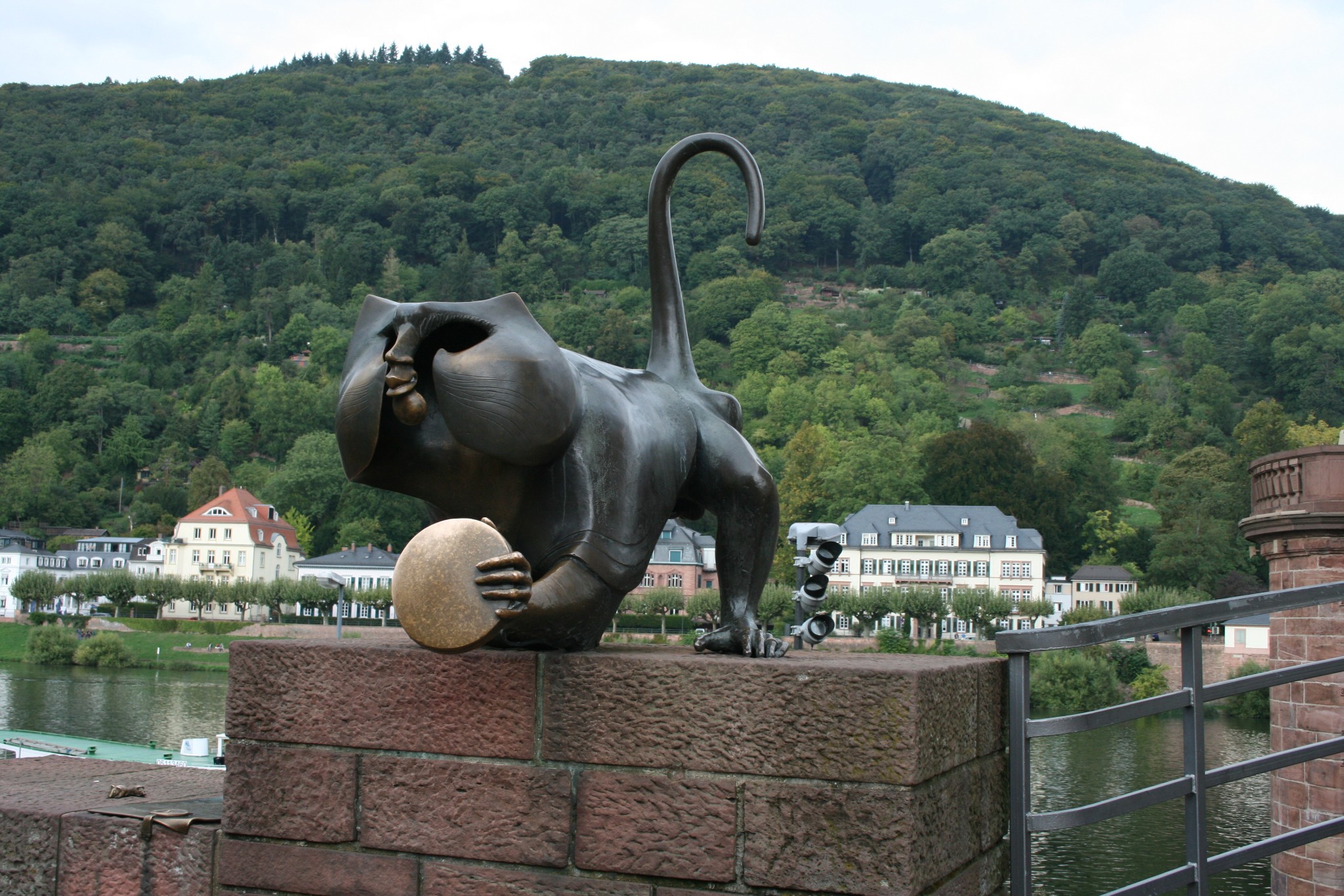 · 桥猴就在老桥的桥基处,猴子手持一面镜子,另一只手的手指向返回海德堡的方向,周围环绕着许多老鼠。传说触摸镜子可以获得财富,握过猴子手指的人将来会重回海德堡,而老鼠则有多子多福的寓意。