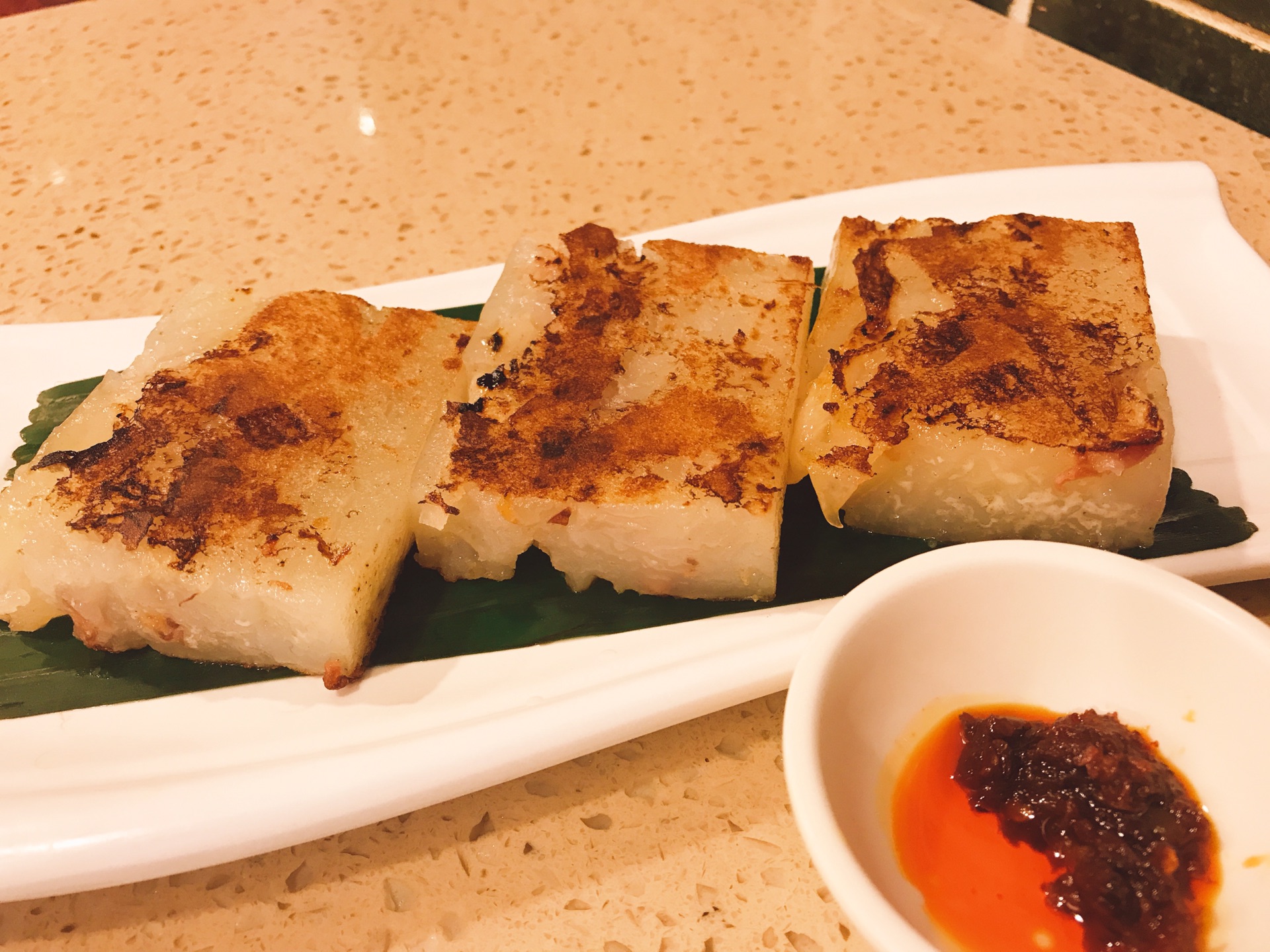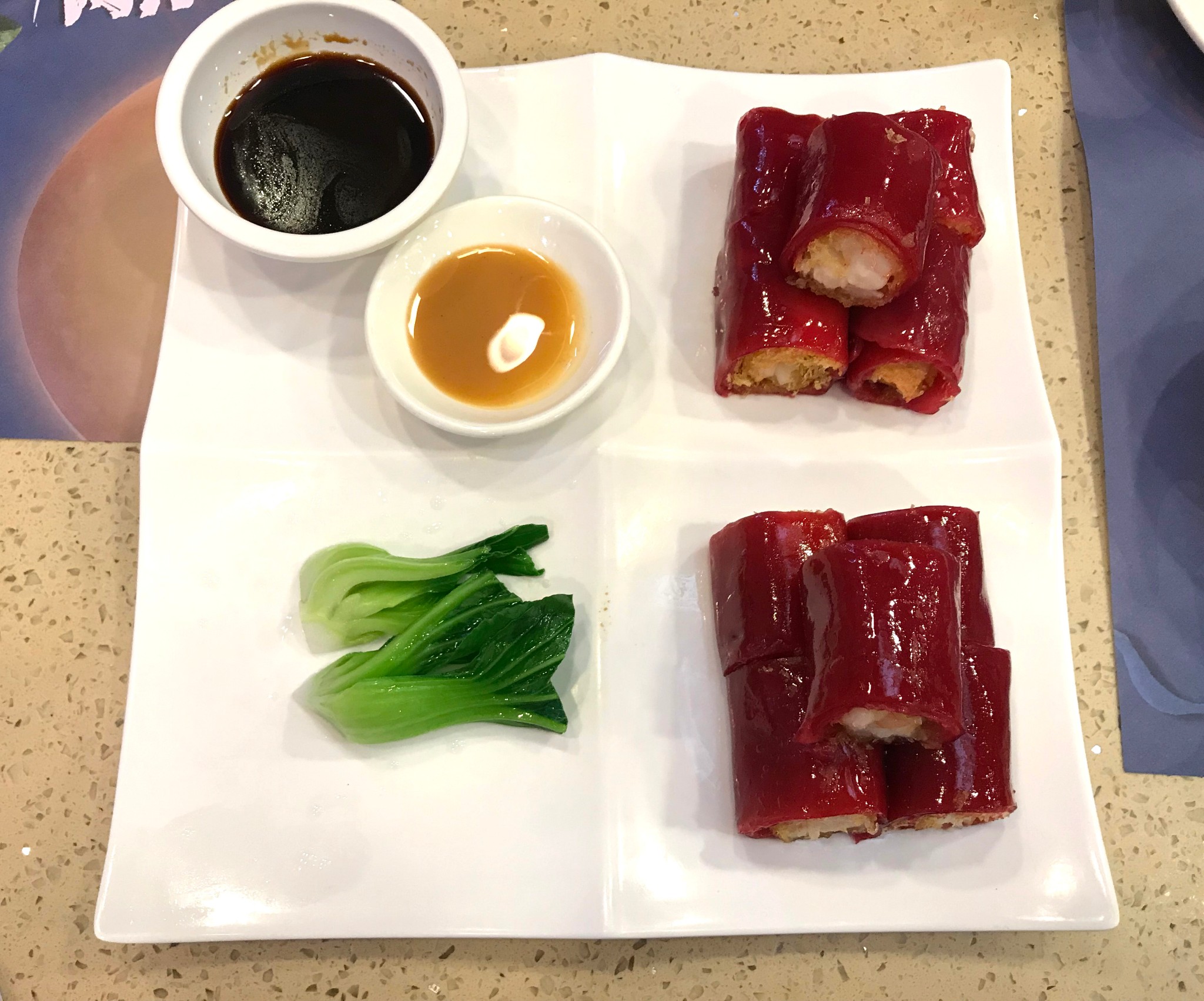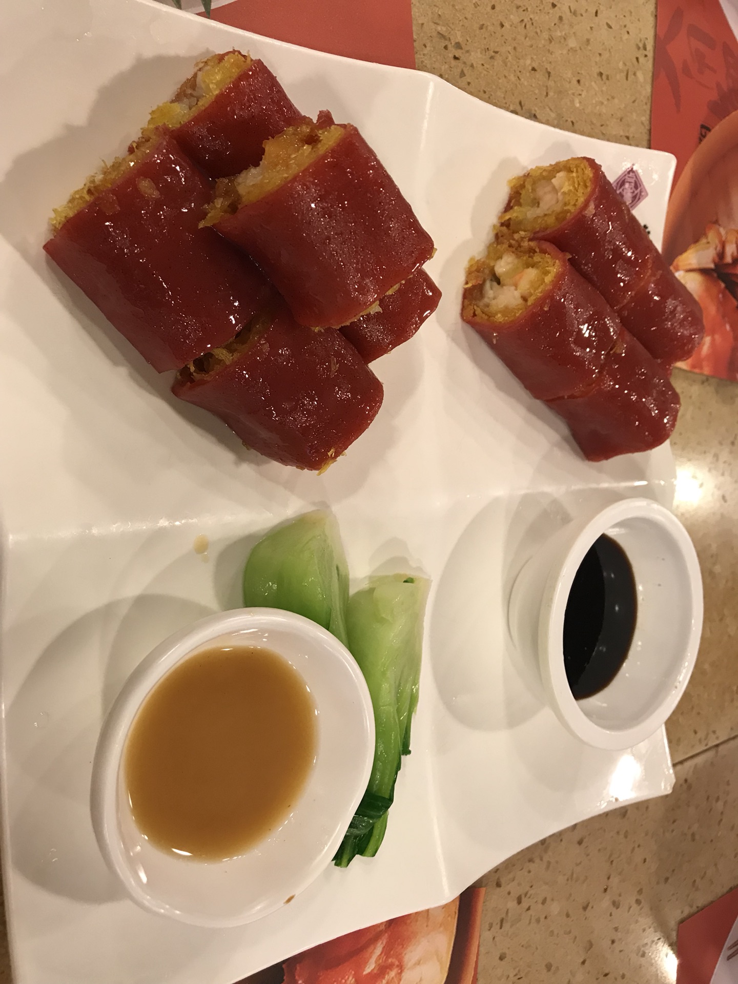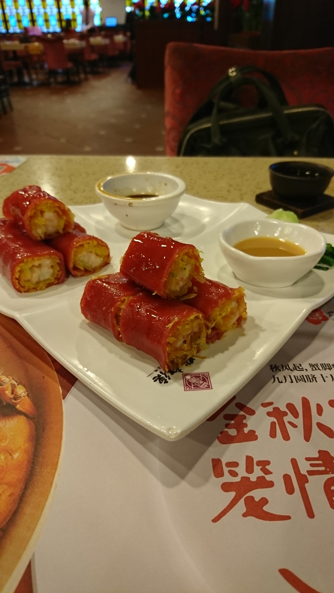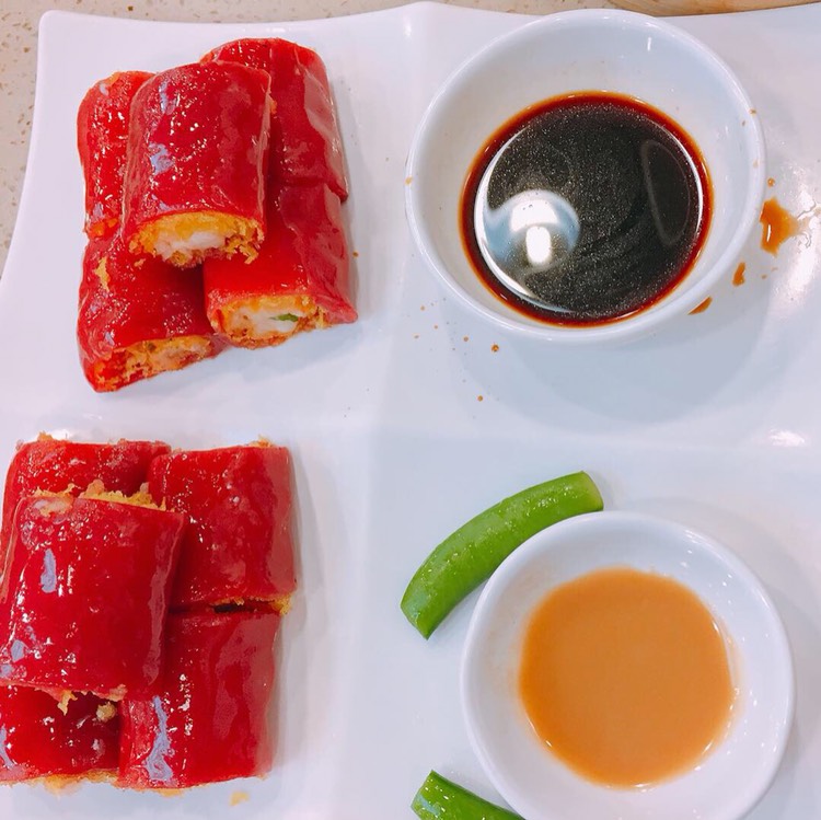 什么是红米?我也不知道。这个几乎是每桌必点的东西,里面都是虾,红米肠和虾之间还有一层炸的东西,有两种酱,我也没尝出来黄色的是什么酱,我还是比较喜欢蘸酱油。一份一共十个,因为有油炸的部分,吃到后面会有些许腻。