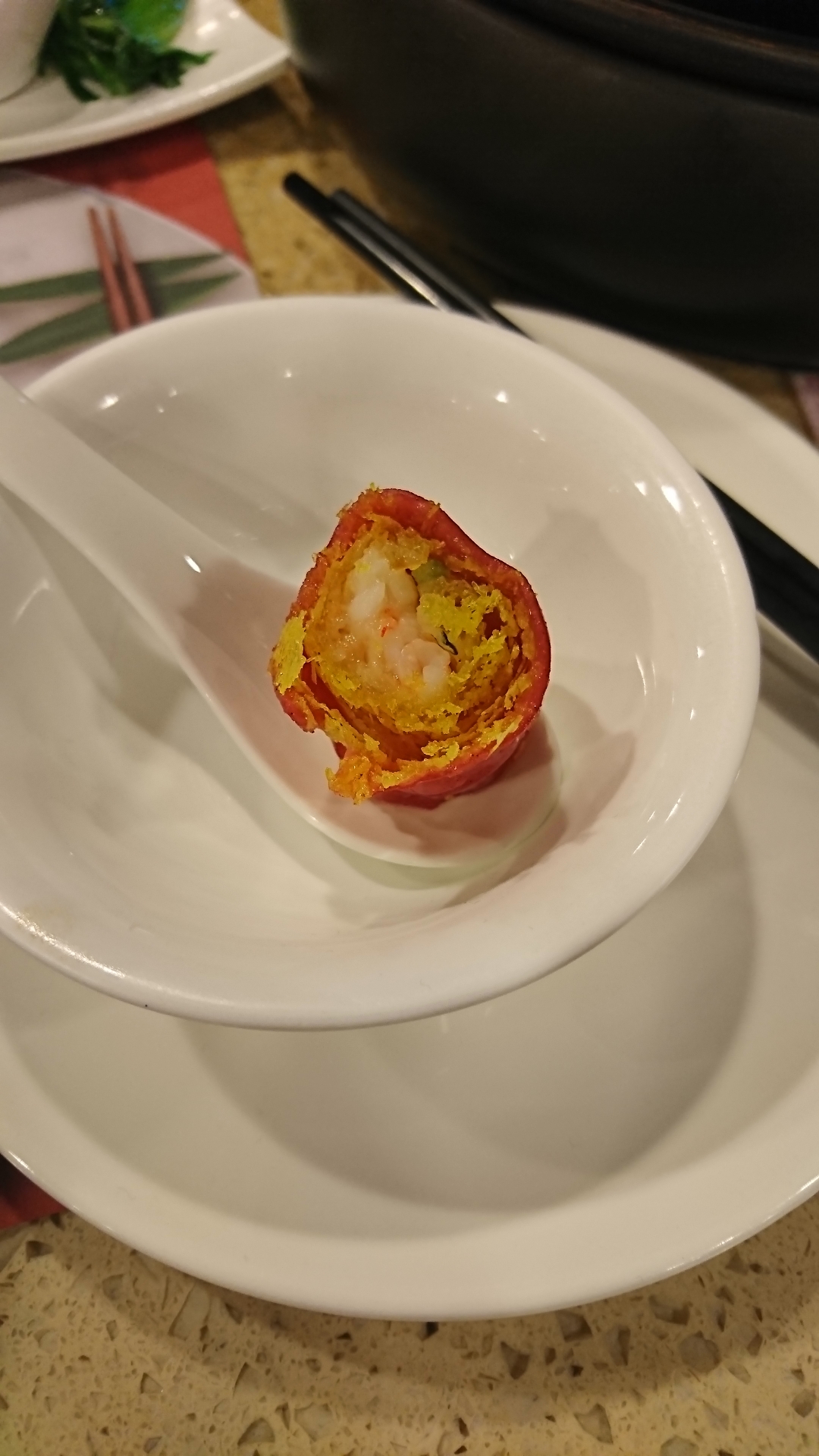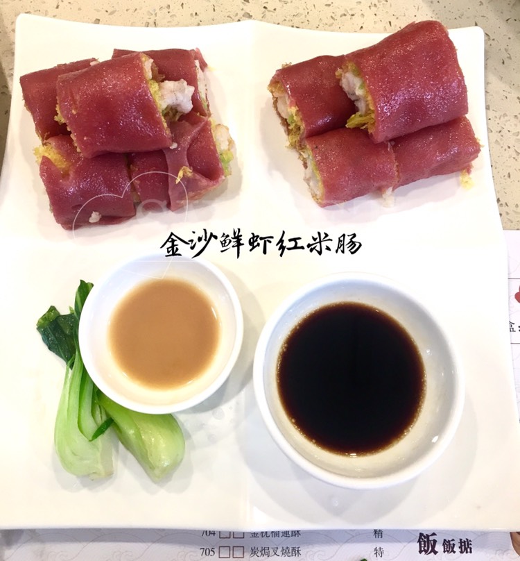 红米肠 虽然叫红米肠,但实际就像“肠粉”一样,并没有真正的“肠”,而是类似肠粉,用的也是粉皮,中间金沙脆脆的,最里面是鲜虾。虾子很嫩且多,金沙酥脆,加上粉皮,一口下去,口感层次相当丰富了。