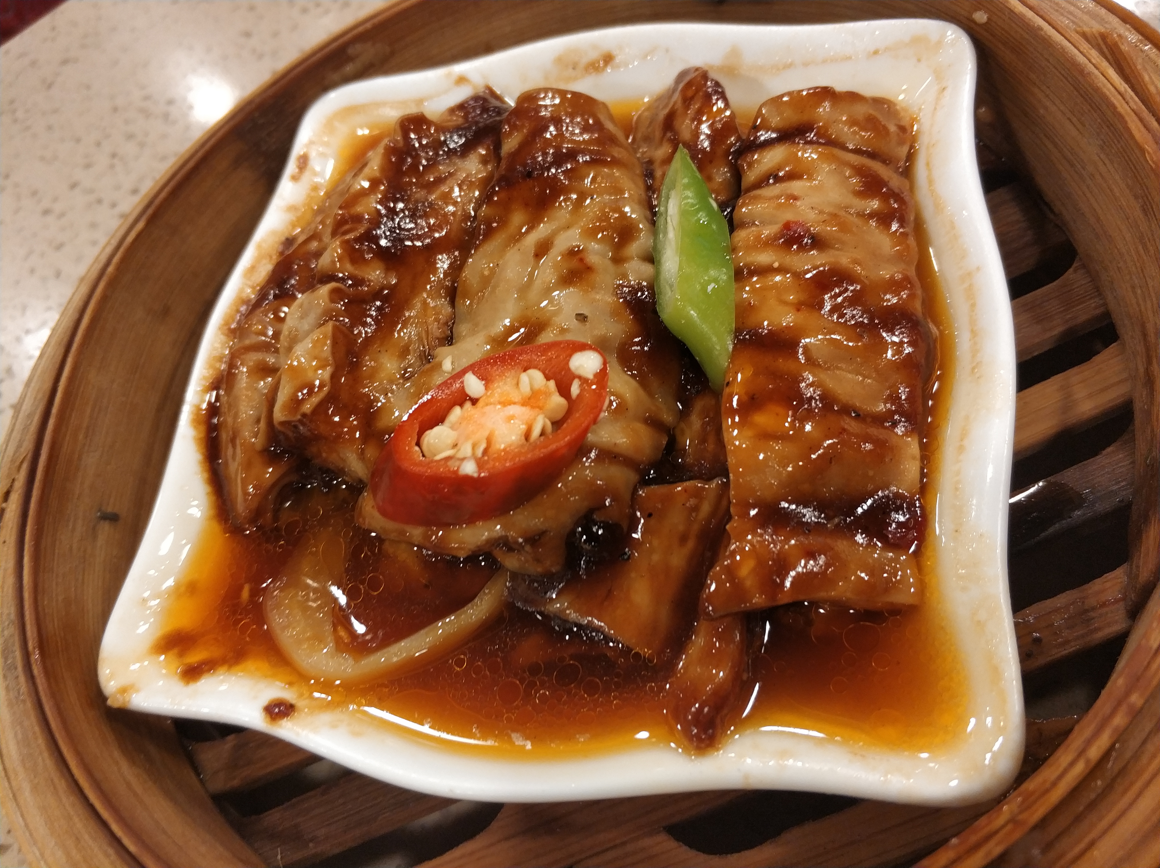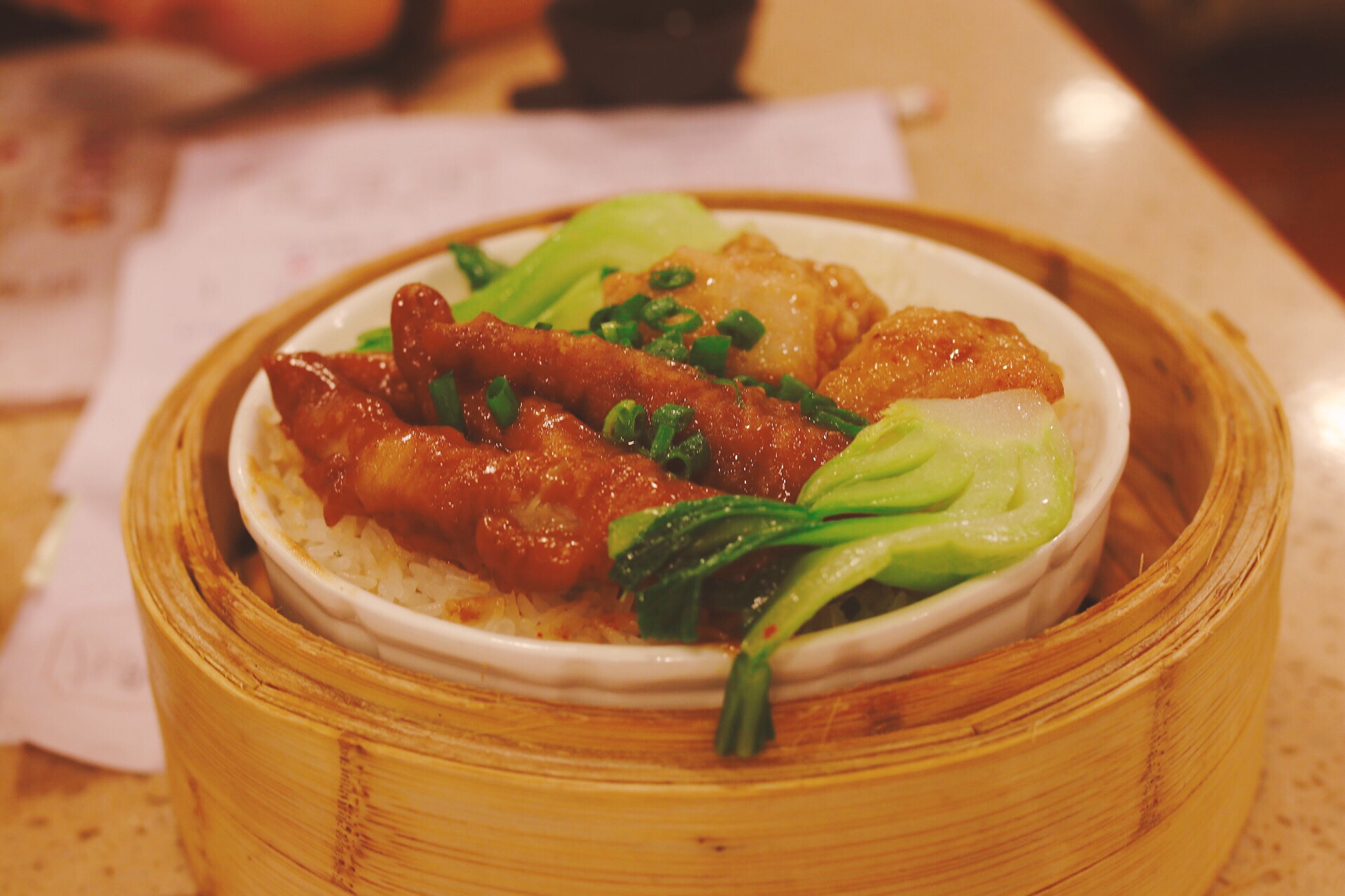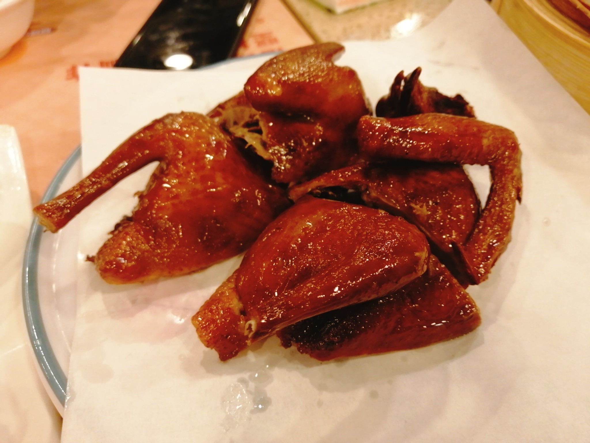 凤爪 点都德的凤爪真的太好吃了!软糯得当,一呡即化,不会像四川这边卤味的凤爪那么咸,粤式的略带甜味,但绝对不是那种令人发腻的甜,而是恰到好处地起到提味的作用。整个凤爪从皮到筋都蒸得很软了,咬起来毫不费劲。