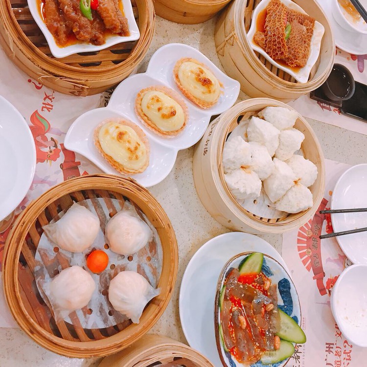据说是外地人必吃的茶点,到店里果然满满的都是人人人人人。建议可以先取号在附近逛逛,手机上时刻关注排队进度,等号码快到的时候再回来。虾饺肯定是必点,虾饺里包裹着一整个虾仁,虾肉饱满有弹性。松化鸡蛋挞,外皮酥脆,内馅香滑可口。艇仔粥很大一份,油条咸香,花生酥脆,还有蛋皮、香菜等等,非常丰富。茶具很别致,看着就赏心悦目。想点红米肠但是已经售罄了,只能等下次有机会来广州再打卡了。人均:50元推荐:虾饺、红米肠、蛋挞、蒸排骨、艇仔粥、豉汁凤爪