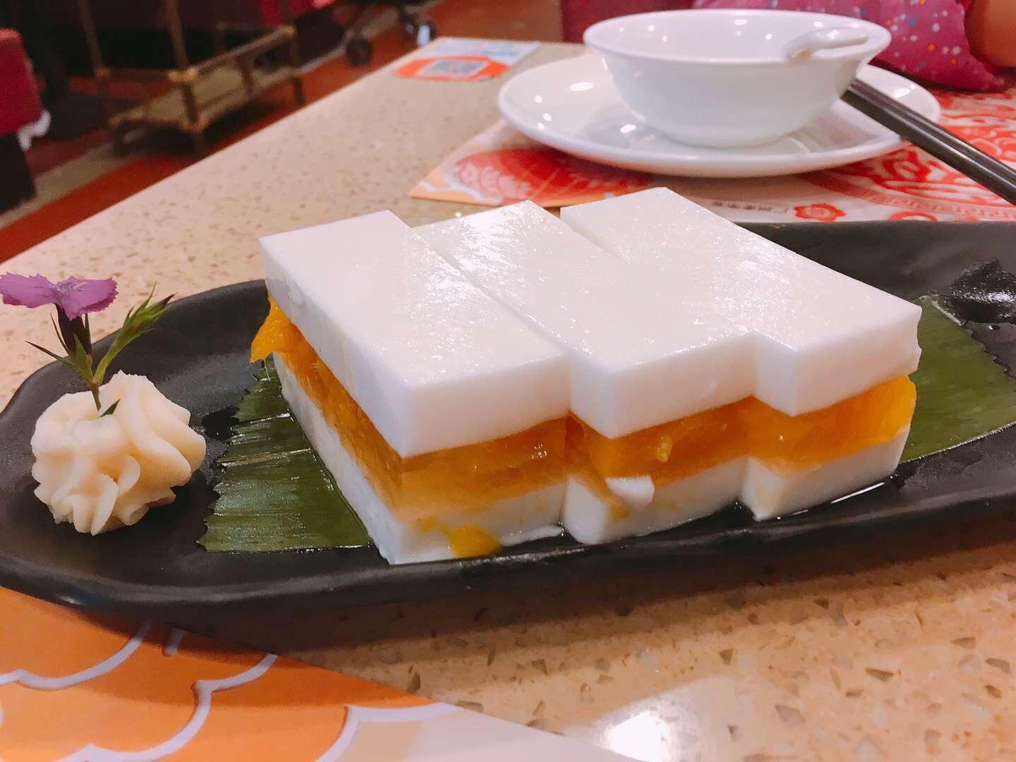 香芒夹心椰汁糕 大概是本店最热门的甜点。椰汁糕香浓爽滑,最让我意外的是里面夹的芒果,竟然是鲜芒果果肉。之后发现广州这边甜点里的芒果都是用的鲜芒果。这点真的很赞。芒果香甜,与椰汁搭配起来,十分解腻。