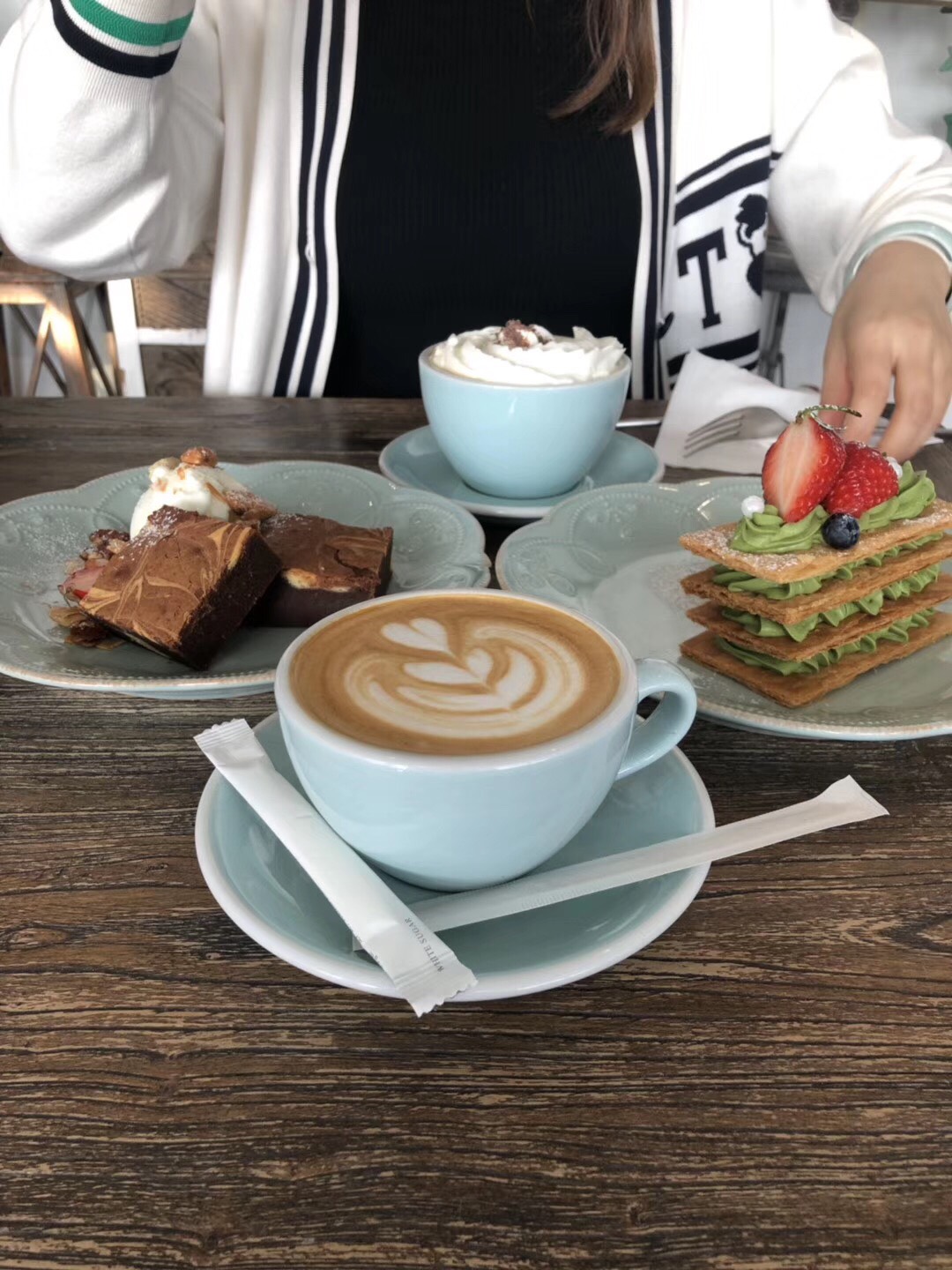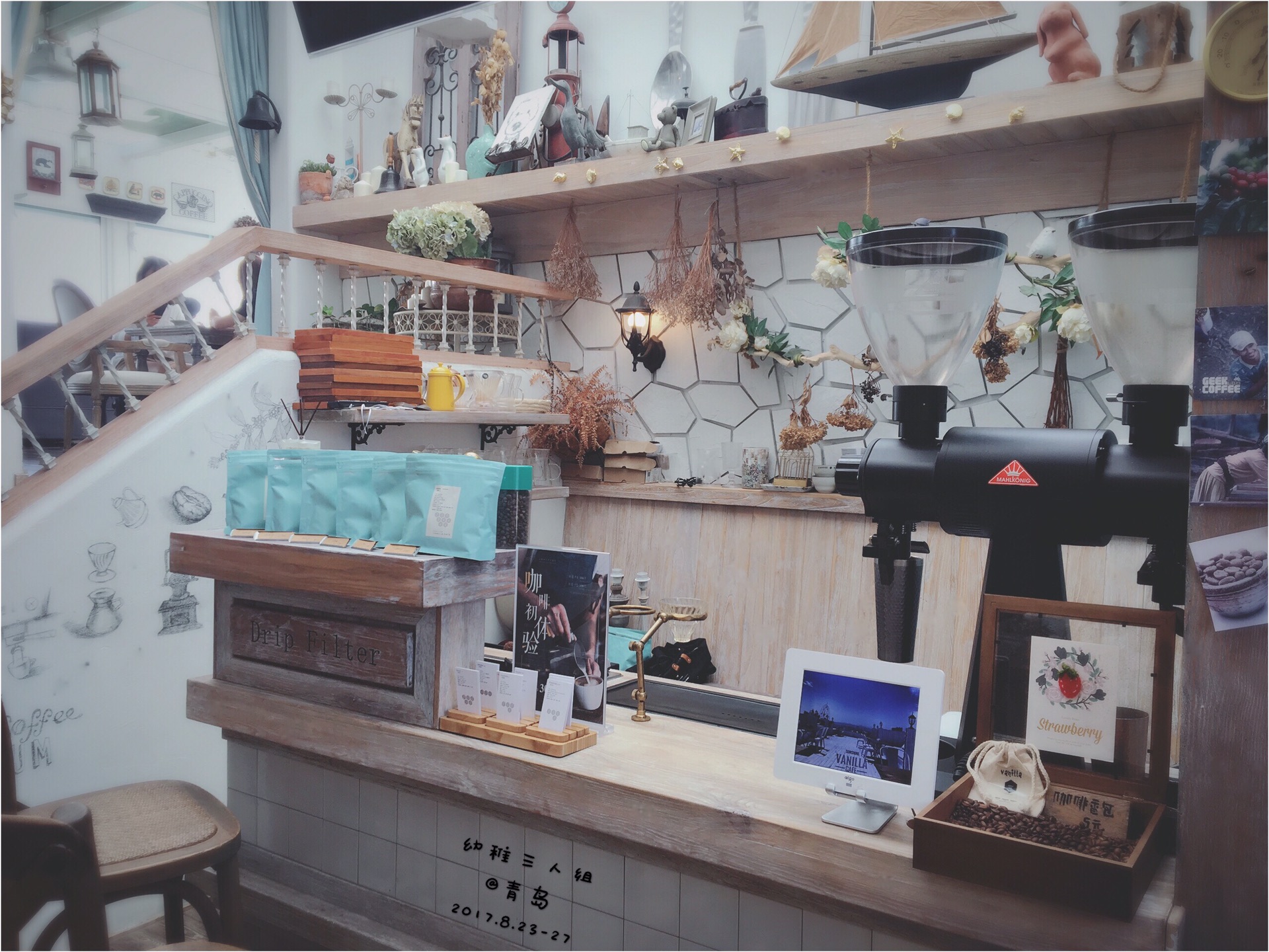 这是大众点评上排行榜第一的咖啡厅,在海边,占了地理位置的便宜,外观不起眼,找了好久。甜品和咖啡价格略贵,我点了拿破仑和提拉米苏,以及一杯咖啡+一杯花茶=220元左右哟!服务员给我说抹茶拿破仑有点苦哟,温馨提示但是我还是很好奇点了,果然,谁叫这个是招牌,我妈妈果然吃不来。还是应该点芝士蛋糕。抹茶拿铁要多吃几口就能吃出填的回味。所以不是谁都能驾驭。因为靠近海边,所以拍照确实很好看,真的就是为了拍照来这里打卡。店内装修也很小清新,很多摆设,特别文艺,拍照很好看。还有一个露天二楼,成为了拍照圣地。不过当天突然下雨楼上没人去。不过这雨最多下了3分钟就停了。青岛其实很多有特色的咖啡店,我选了这家最网红的,希望你喜欢。旺季的时候去还要排队拿号等座位。我们去的时候还好,但是靠窗的座位完全靠抢,谁走了立马滚过去占位才行。服务员也很有经验,马上给你换座位,这种行为估计见怪不怪。