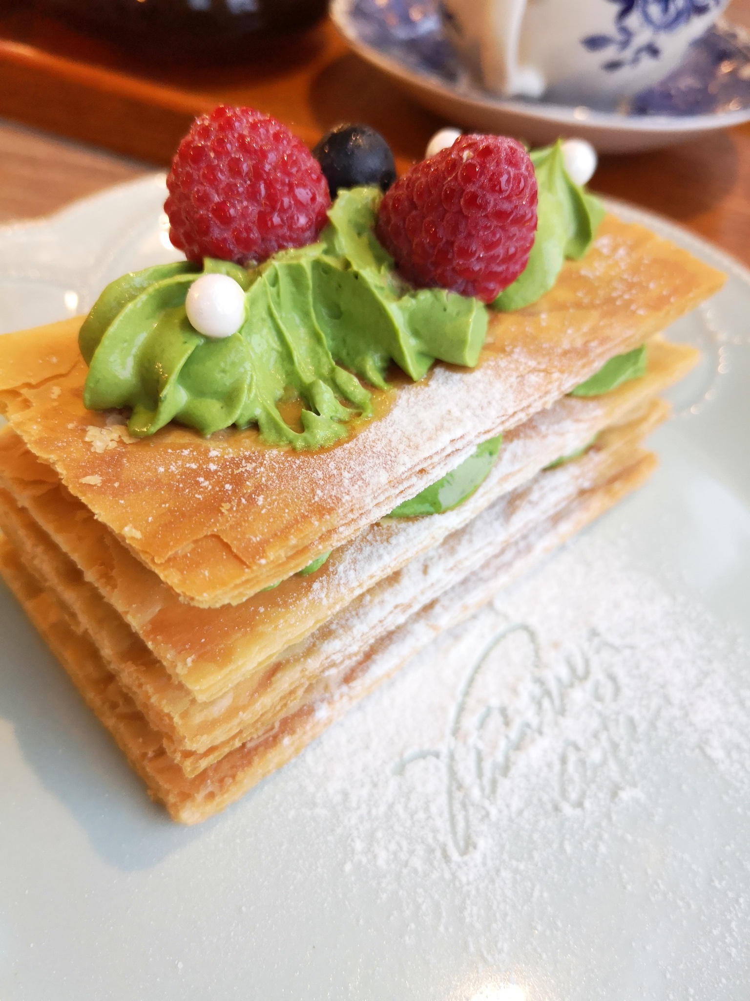 这是大众点评上排行榜第一的咖啡厅,在海边,占了地理位置的便宜,外观不起眼,找了好久。甜品和咖啡价格略贵,我点了拿破仑和提拉米苏,以及一杯咖啡+一杯花茶=220元左右哟!服务员给我说抹茶拿破仑有点苦哟,温馨提示但是我还是很好奇点了,果然,谁叫这个是招牌,我妈妈果然吃不来。还是应该点芝士蛋糕。抹茶拿铁要多吃几口就能吃出填的回味。所以不是谁都能驾驭。