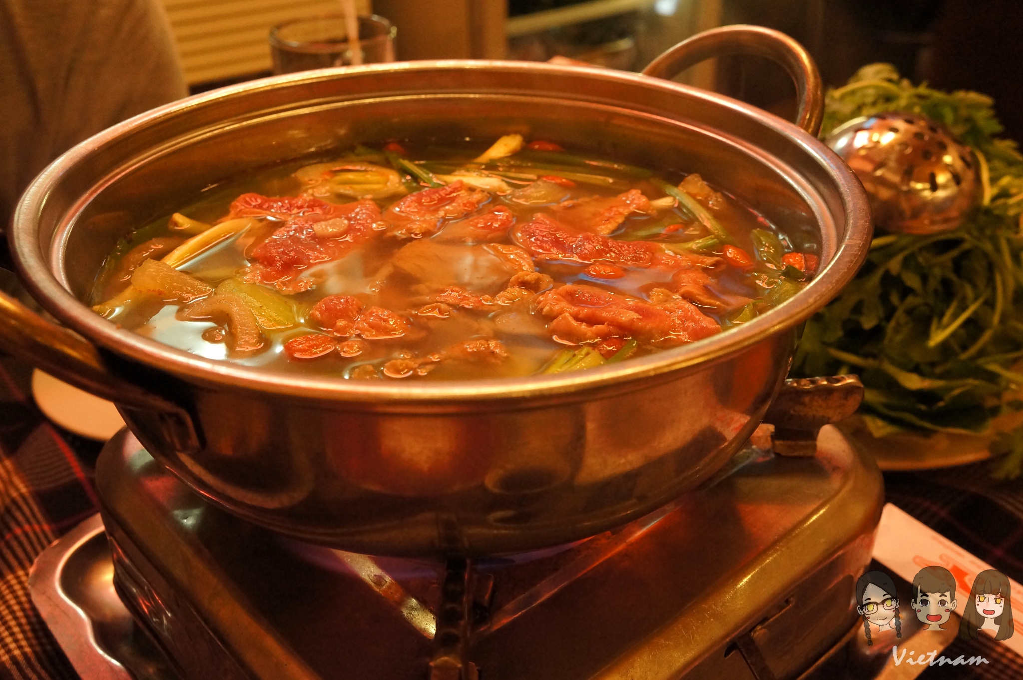 走着走着终于到我们的目的地了,NHAT LY主要是本地人,没见几个外国人,我们其实都不饿,毕竟前面吃了两盘薯条啊!所以我们就随便点了两个菜,就着火锅,三个吃货的心情瞬间上天了~