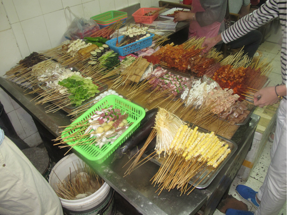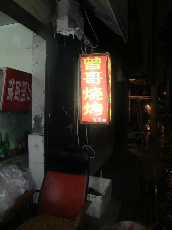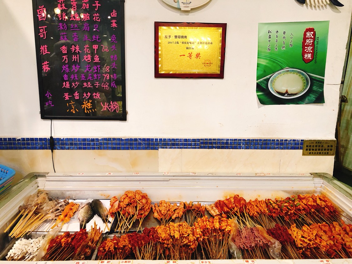 这就是典型的成都苍蝇馆,有个小到可以忽略的招牌,烤串味道非常好,旁边的面馆卖的肥肠面也非常美味