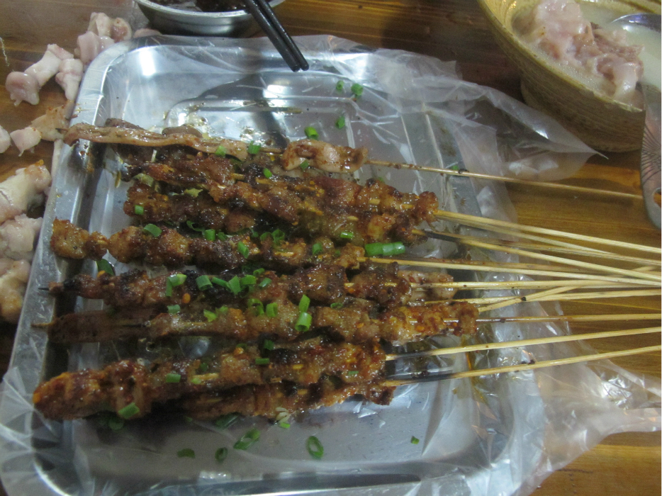 川音附近的苍蝇馆子,味道巴适,这里招牌是五花肉,腰花和玉米。仔细看照片的话可以看见这里的玉米都是一粒一粒穿在一串上的,做的非常细致,已经很少有饭馆可以这么细心的做一道菜了。这里的味道不是那种北京常见的光放辣椒面和孜然的新疆风味,而是之前已经腌制好的肉直接去烤,简单的调味再撒上葱花,巴适的很。结果最后一天晚上又没忍住打包带回去吃了。位置就在九眼桥附近,七天的对面。人均20-30