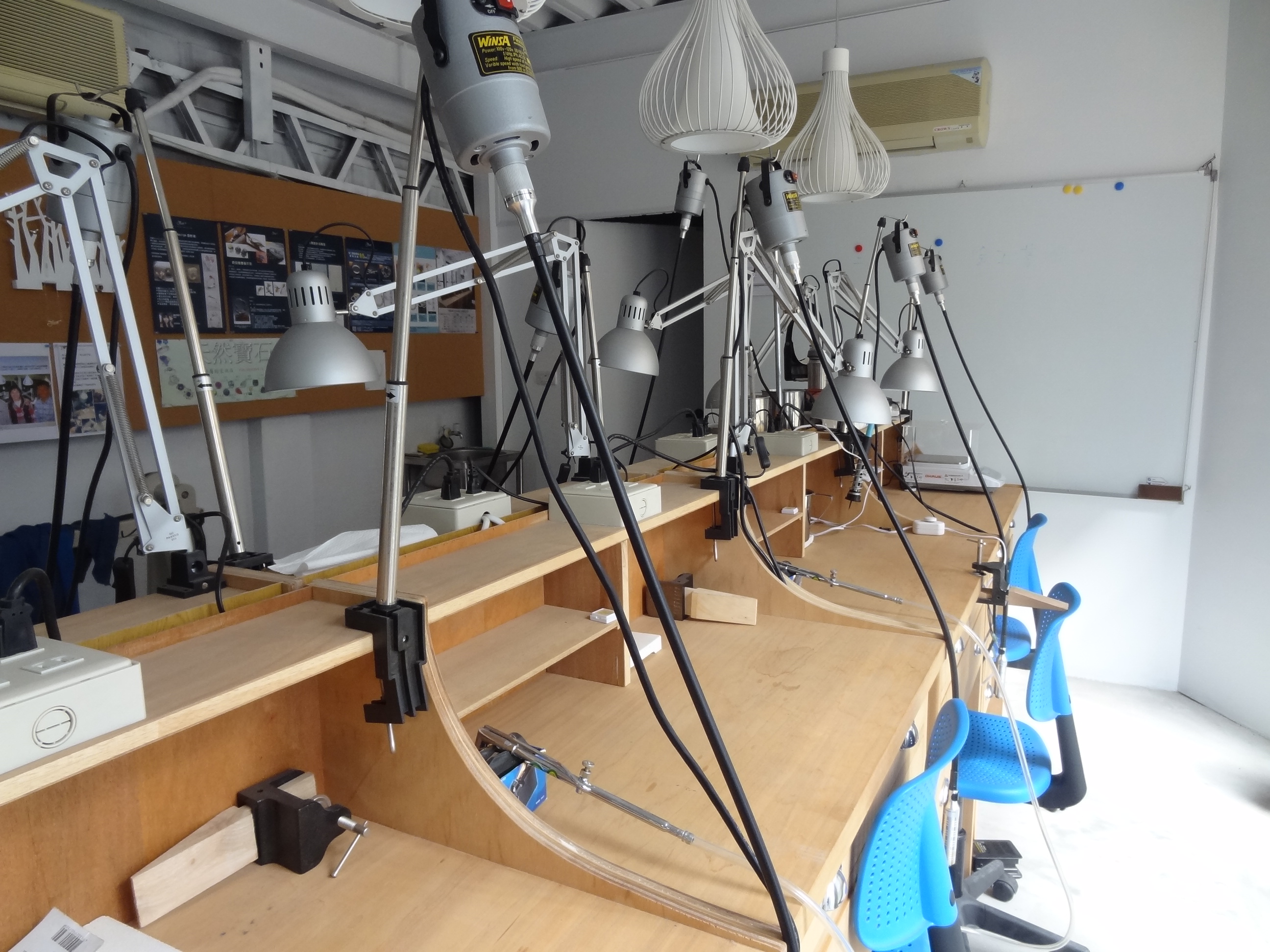裡面有很多桌子...擺滿了各式各樣的工具~好新奇(是見識太淺?!)感覺只要坐在那裏就很專業的樣子!店家向我們展示DIY的銀飾作品!有項鍊,手環和戒指...師傅已經在上面幫我們畫好線了...接下來拿著鋸弓就可以開始動工啦!別小看這鋸弓...這可是要用對力氣才能夠完美的使用它呢!最後要將戒指磨的亮亮的並且要再稍微做定型!別小看磨光的這個動作 ...這可是一件不容易的事要拿捏好力道,而且還要均勻地讓每個地方都能夠磨到喔!為此我可是花費了不少心思....結果技術太差最後戒指還是交回到師傅手上-.-覺得從最初未切割的銀塊到完成戒指的每項過程都能夠親自參與....做出來的成品格外值得紀念,也很有成就感!而不是像一般只是讓你將半成品裝飾成漂亮的成品感覺就假假的好空虛電話:04-2320-6080地址: 台中市西區精誠四街15號2F