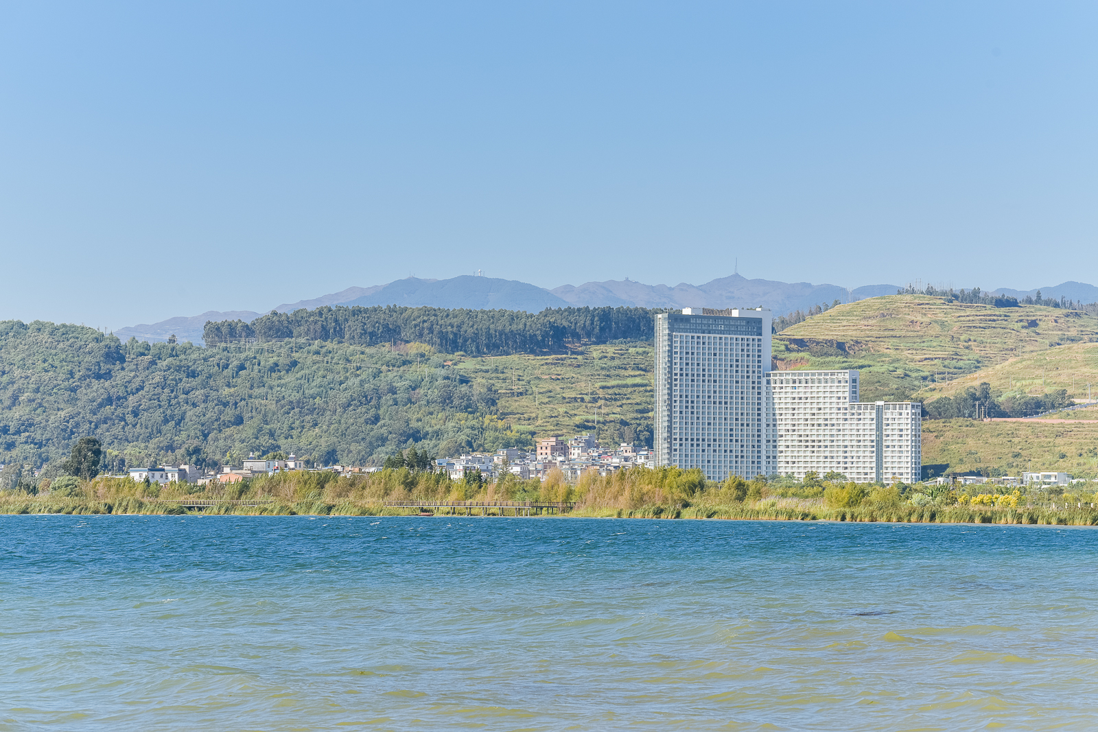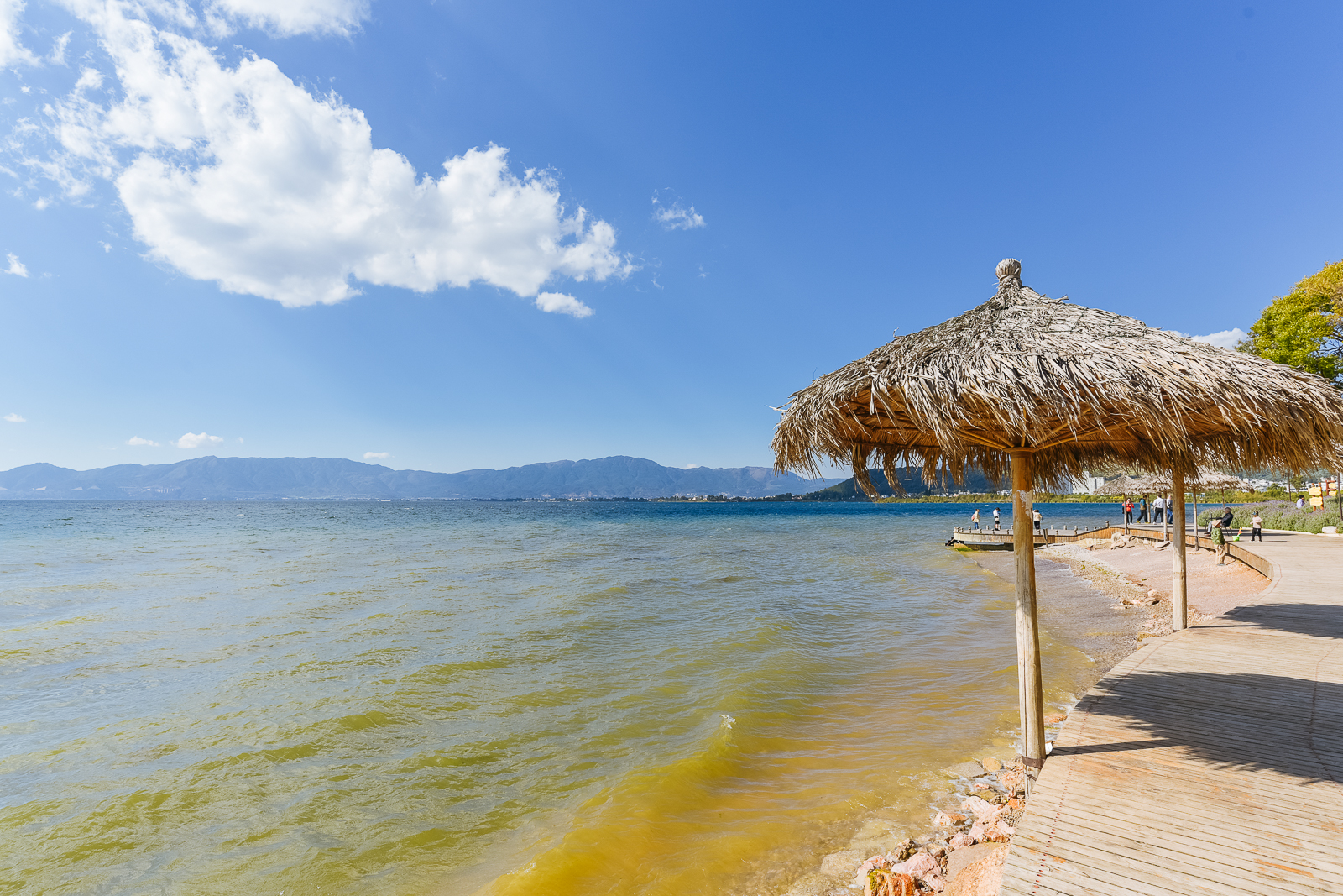 公园内还有一大片人造沙滩,沙很细很白,踩上去很舒服。由于地处抚仙湖东北端,这里还是看日落的好地方。