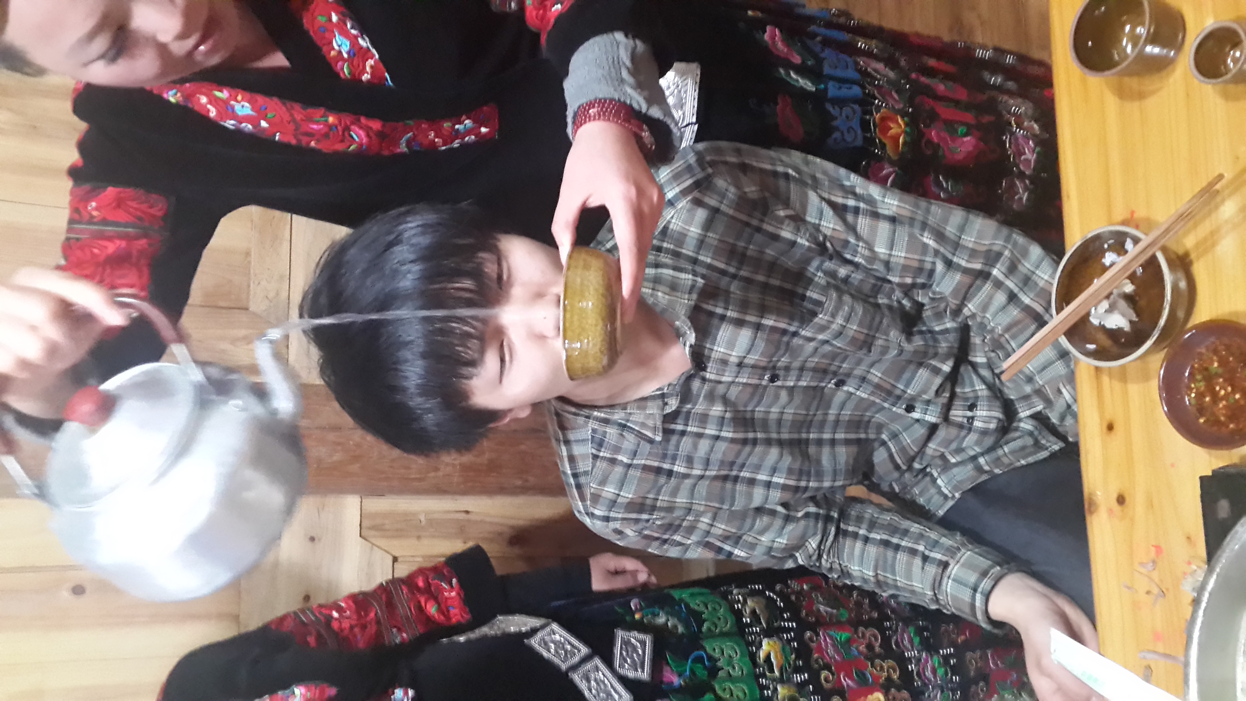 第一次到西江,到了客栈以后就和客栈老板打听传说中的苗家长桌宴,结果就被推荐到了这一家,半信半疑的来了之后,真的大吃一惊,真的很有当地少数名族特色,进店的时候还有拦门酒,还给挂了红色的鸡蛋,真的感觉很新鲜。长桌宴大概人均40左右,菜叶还不错,当地的特色菜基本都包含在里面了,所以很满意,关键就店里面的气氛真的很热情,大家看看我的图片就知道了。所以真心知道推荐,价格又不贵。