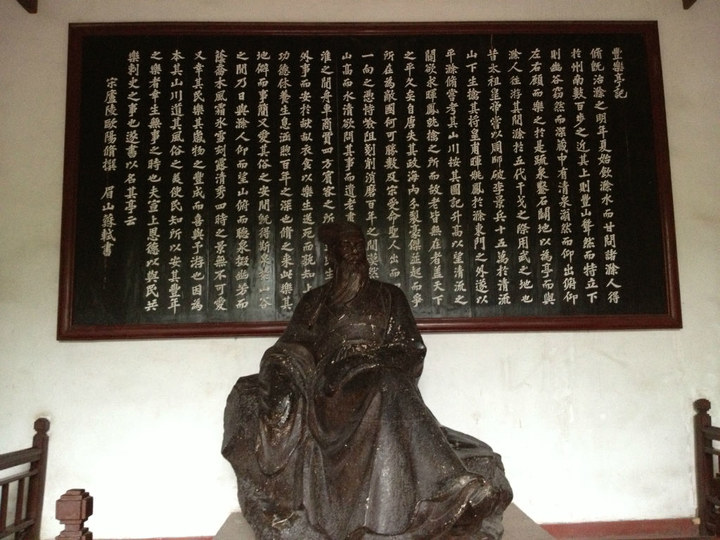 东坡楼坐东北向西南,为歇山式单体木质两重楼房。门额横匾“东坡楼”三字是黄庭坚手书而成,楼堂正中的东坡坐像,楼两侧壁上,有清代以来石刻碑记10余篇。楼前为洗墨池,池中游鱼背脊乌黑,相传为苏东坡在此洗砚墨水所染。