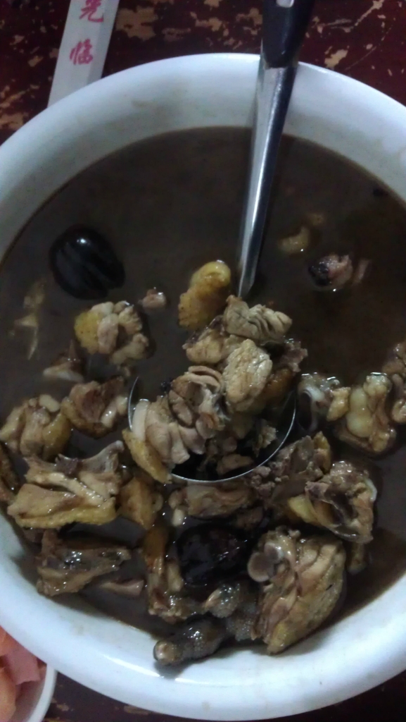 出门找了一家做傈僳族饮食的小饭店,点了一个地方特色菜:漆油鸡。红烧鸡大家都不陌生,但加入一种原料叫做“漆油”就会让人陌生很多。漆油是用树籽打出的油,凝固点很高,常温下就会凝固成块。一般做工业原料用,也可以食用,但必须趁热吃,有时候吃后嘴上会凝固一层薄薄的油脂。老板说鸡汤越黑,味道越好!