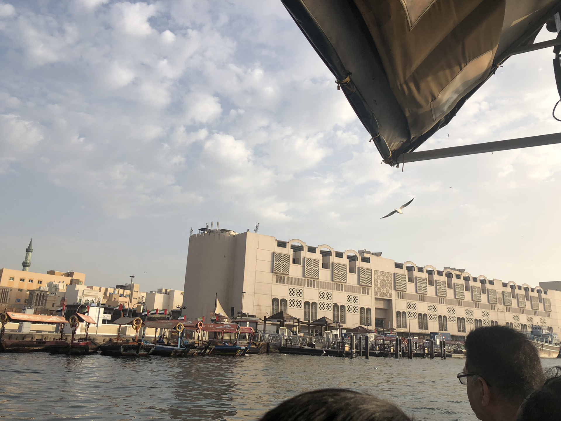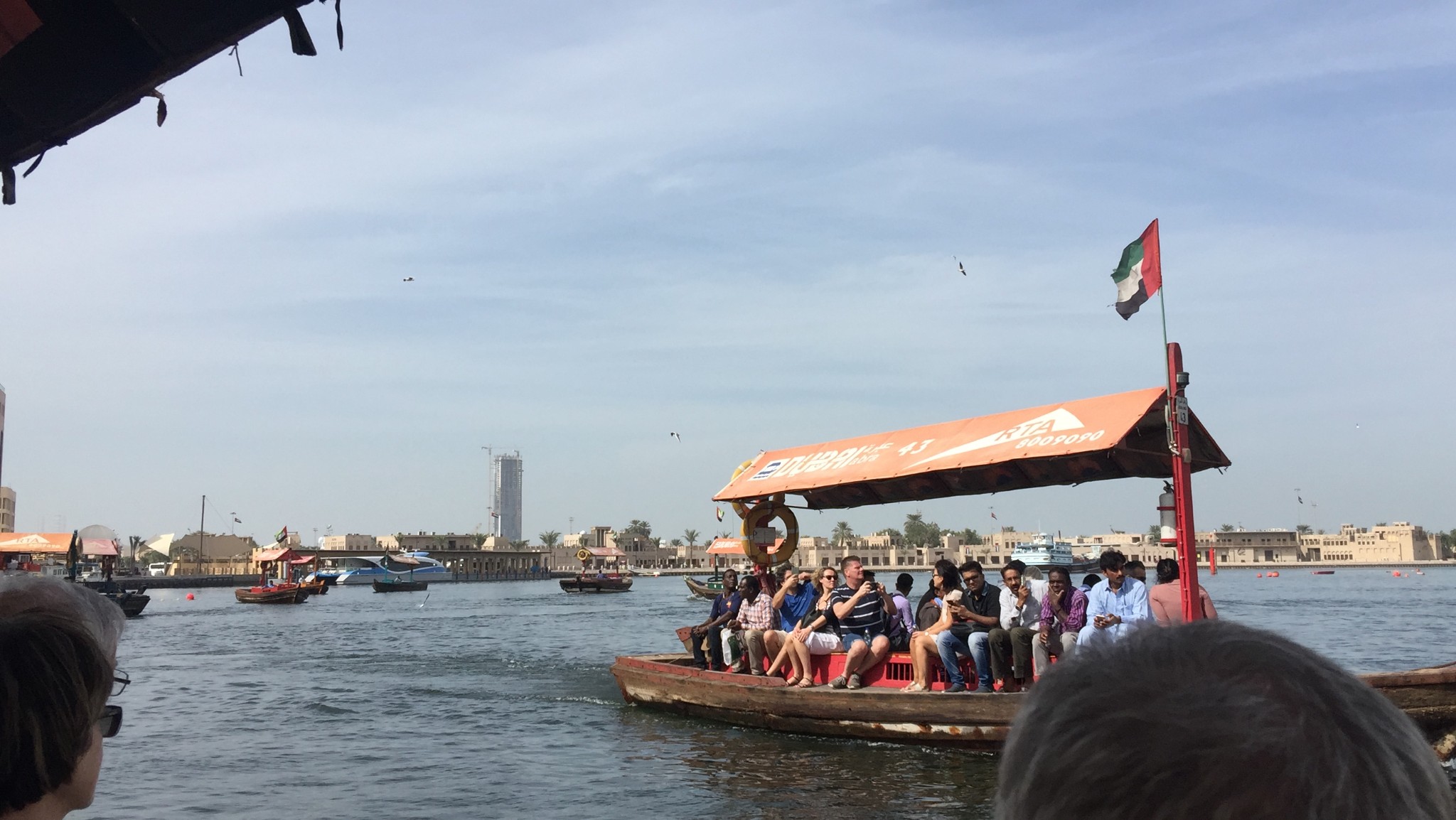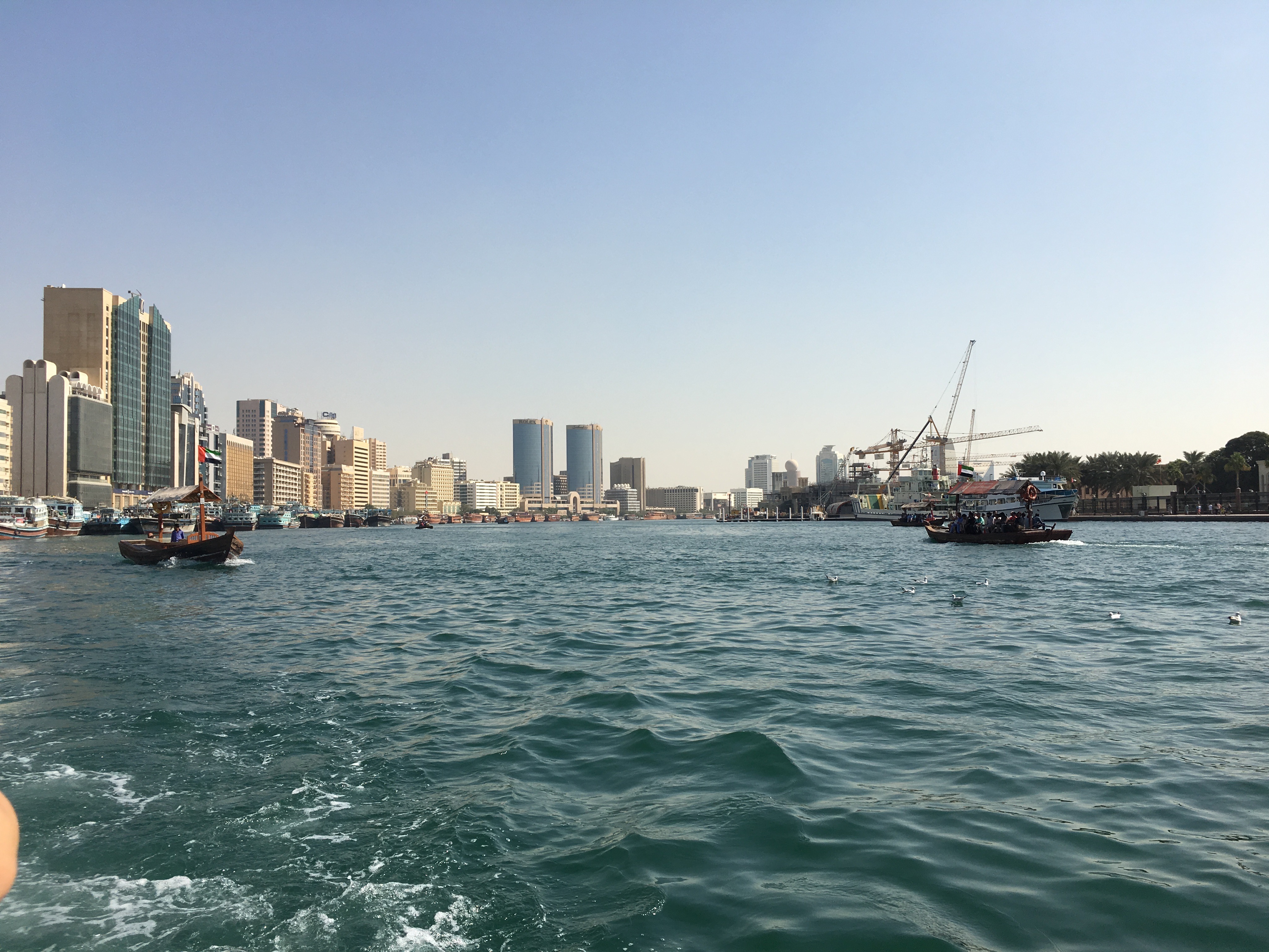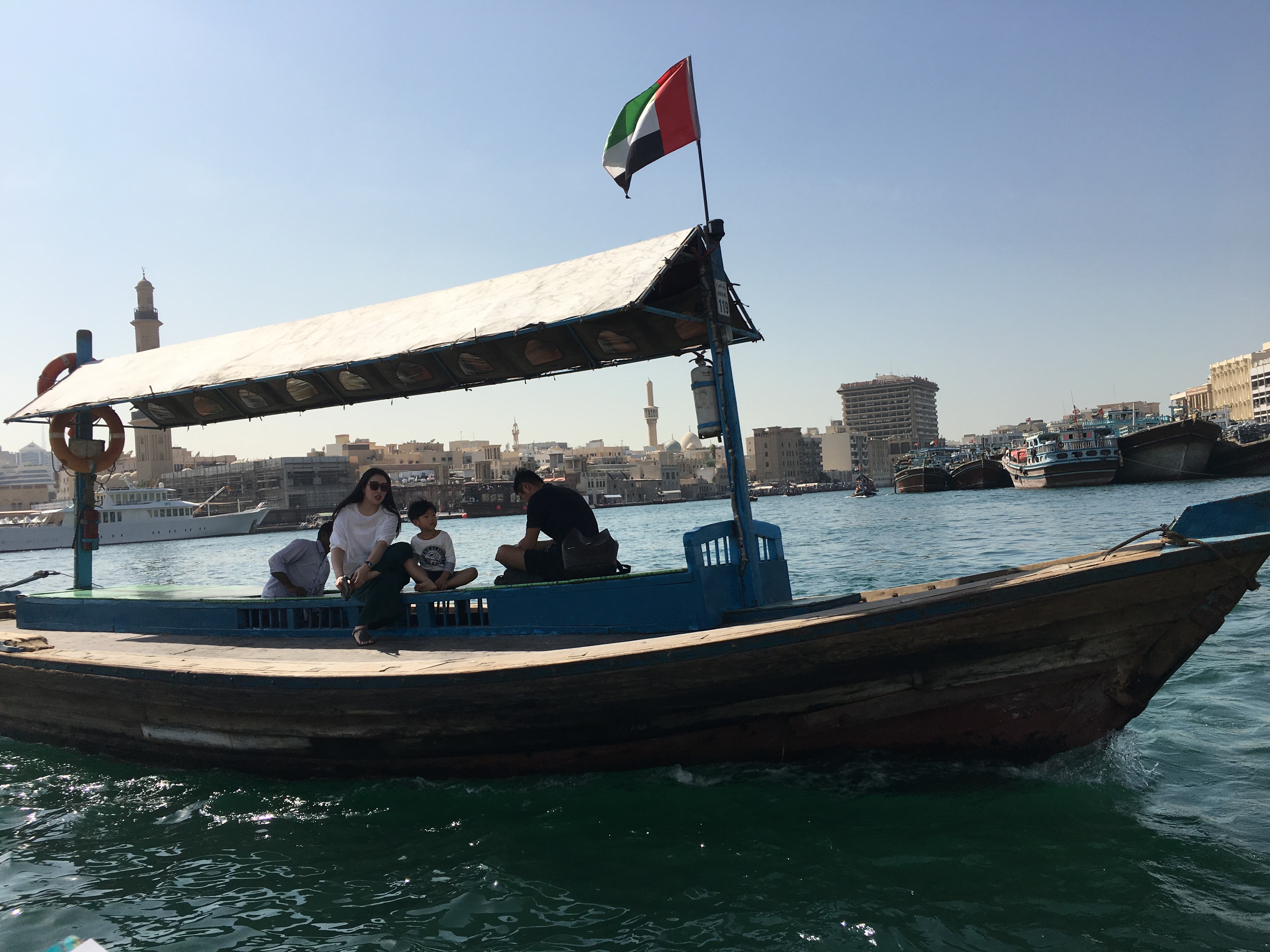 乘坐迪拜湾上的阿布拉船(Abra)穿越迪拜湾,其实就是当地人的轮渡,船费1AED/人,孩子们免费,记得准备好零钱。迪拜河的水非常之清,还有海鸟在河上飞。