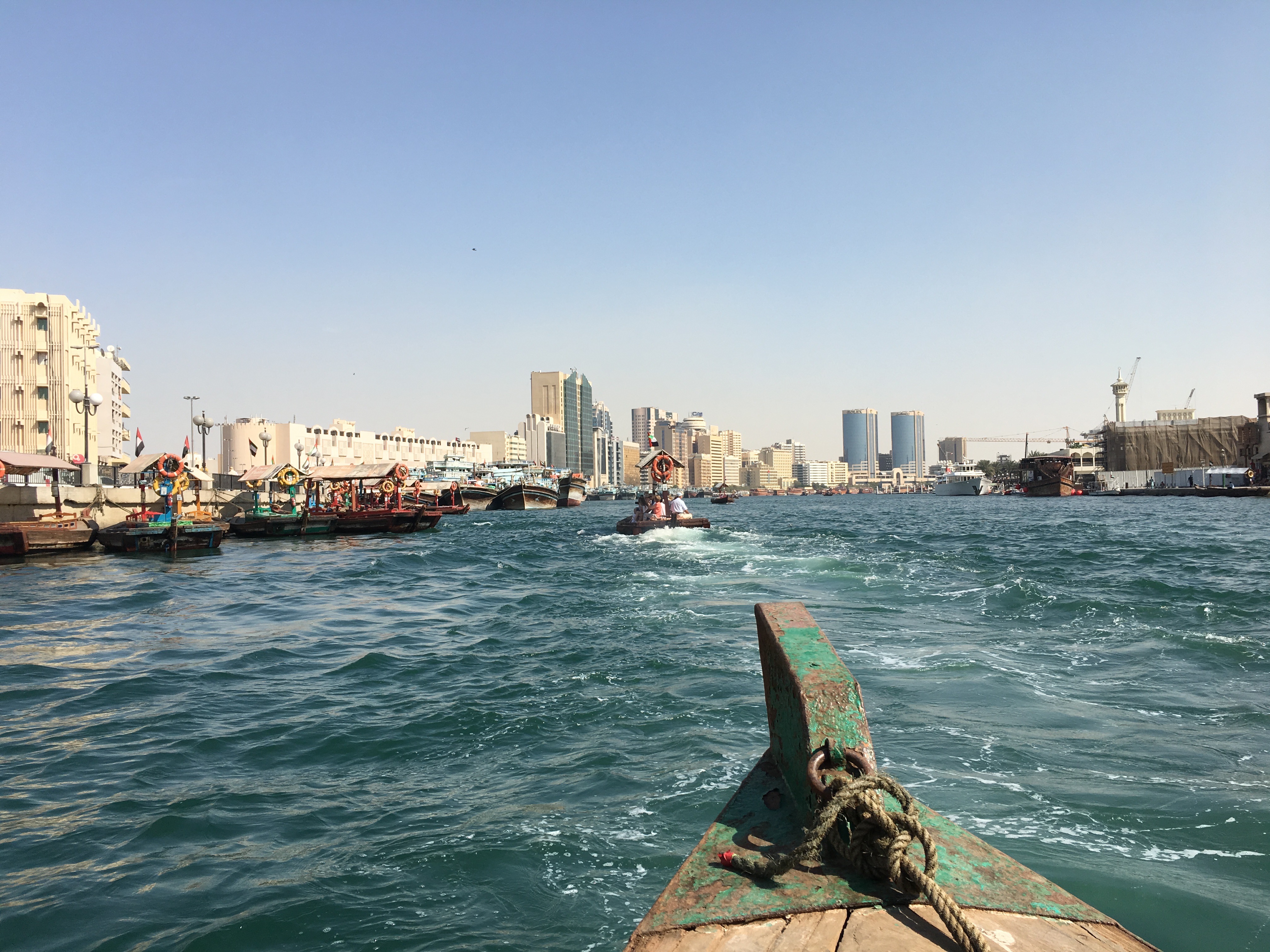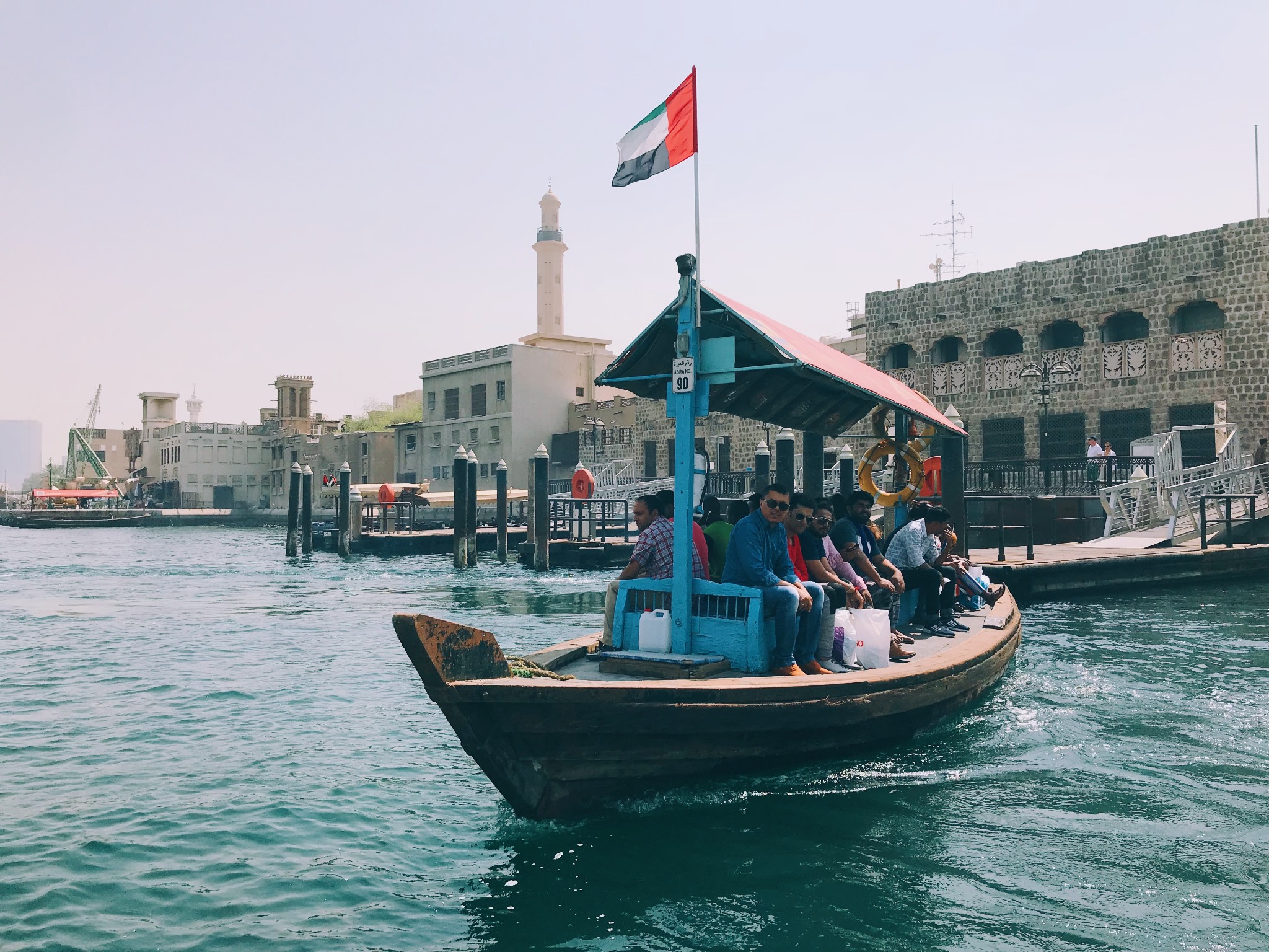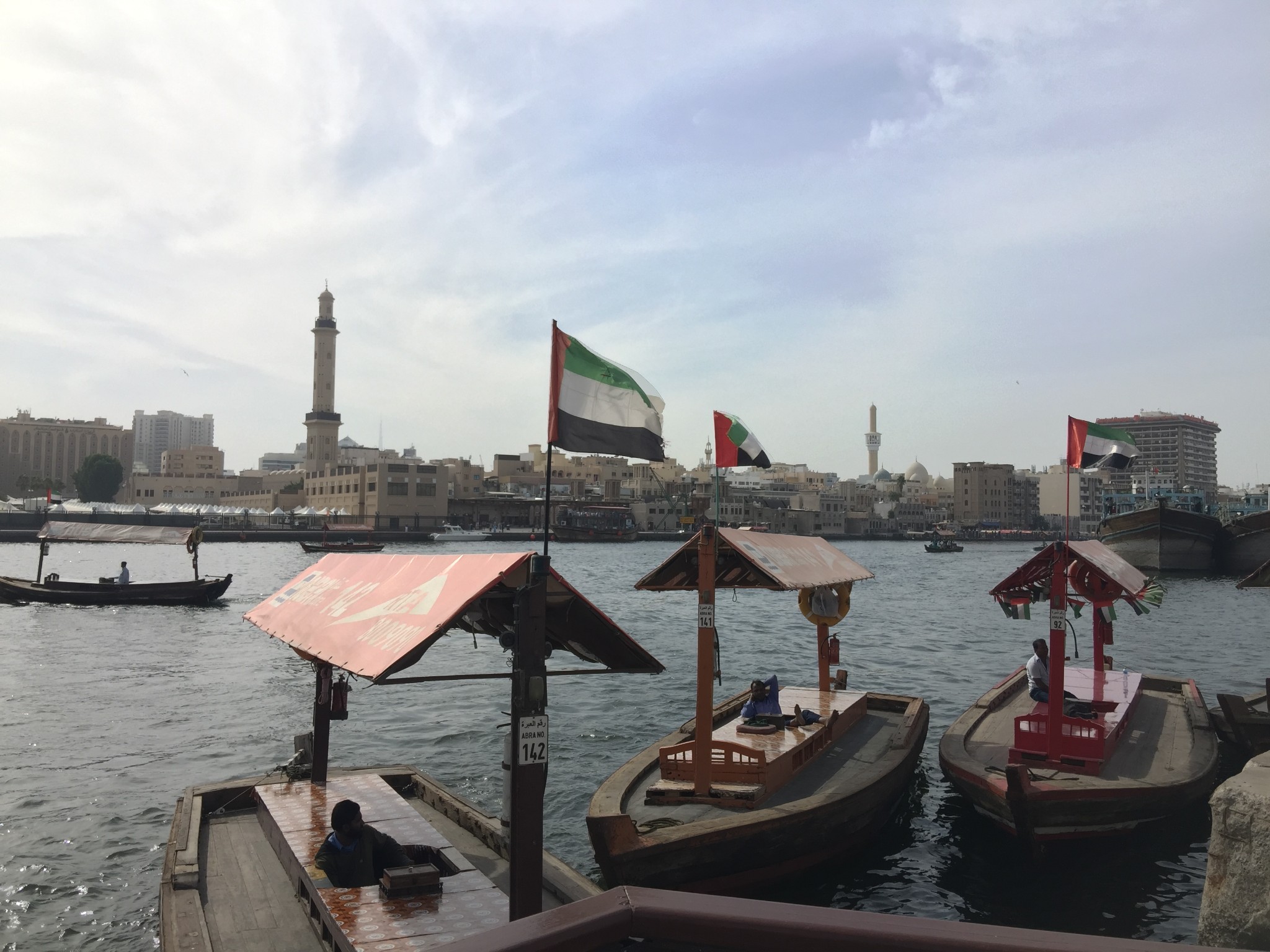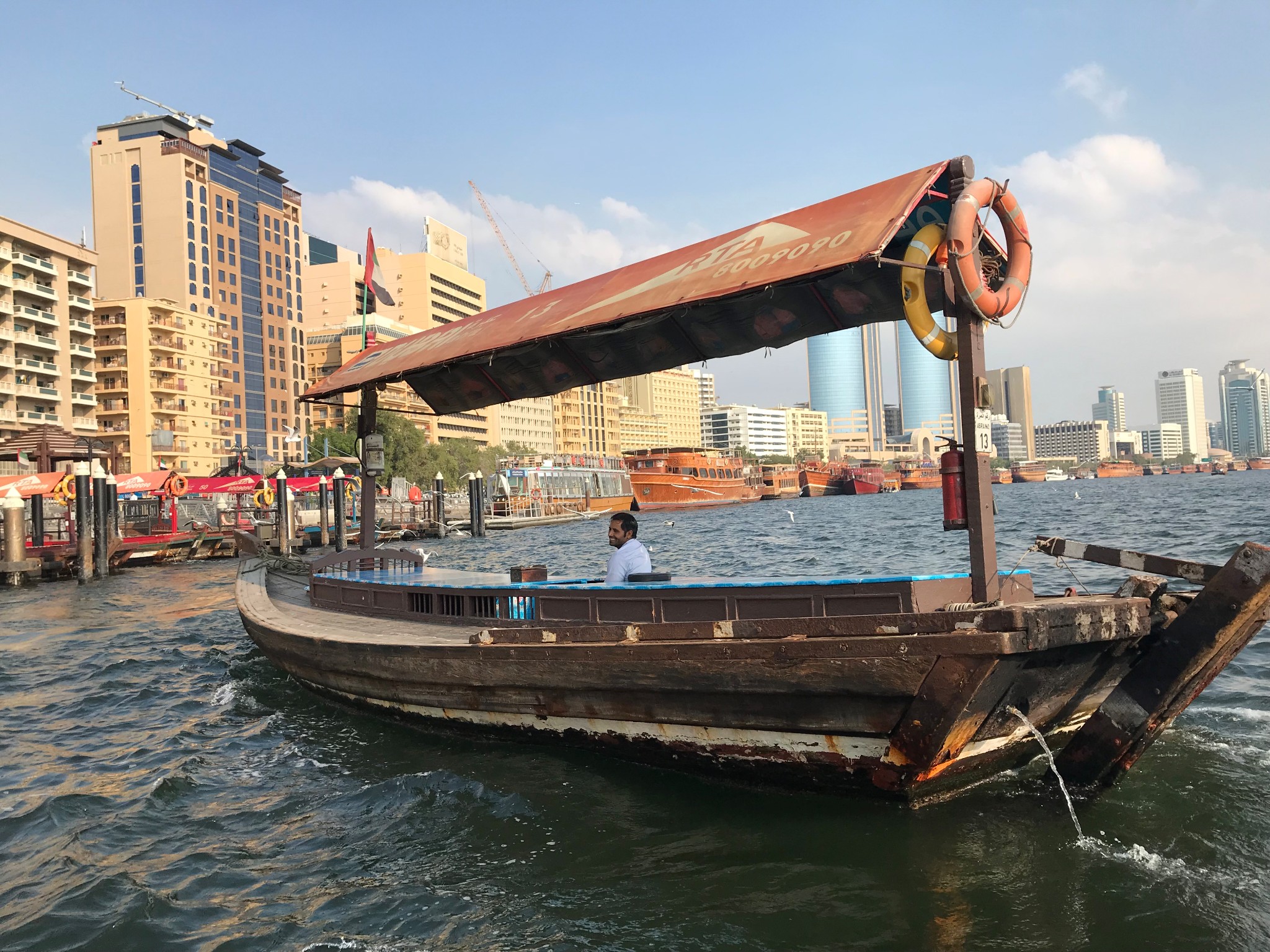 乘坐迪拜湾上的阿布拉船(Abra)穿越迪拜湾,其实就是当地人的轮渡,船费1AED/人,孩子们免费,记得准备好零钱。迪拜河的水非常之清,还有海鸟在河上飞。