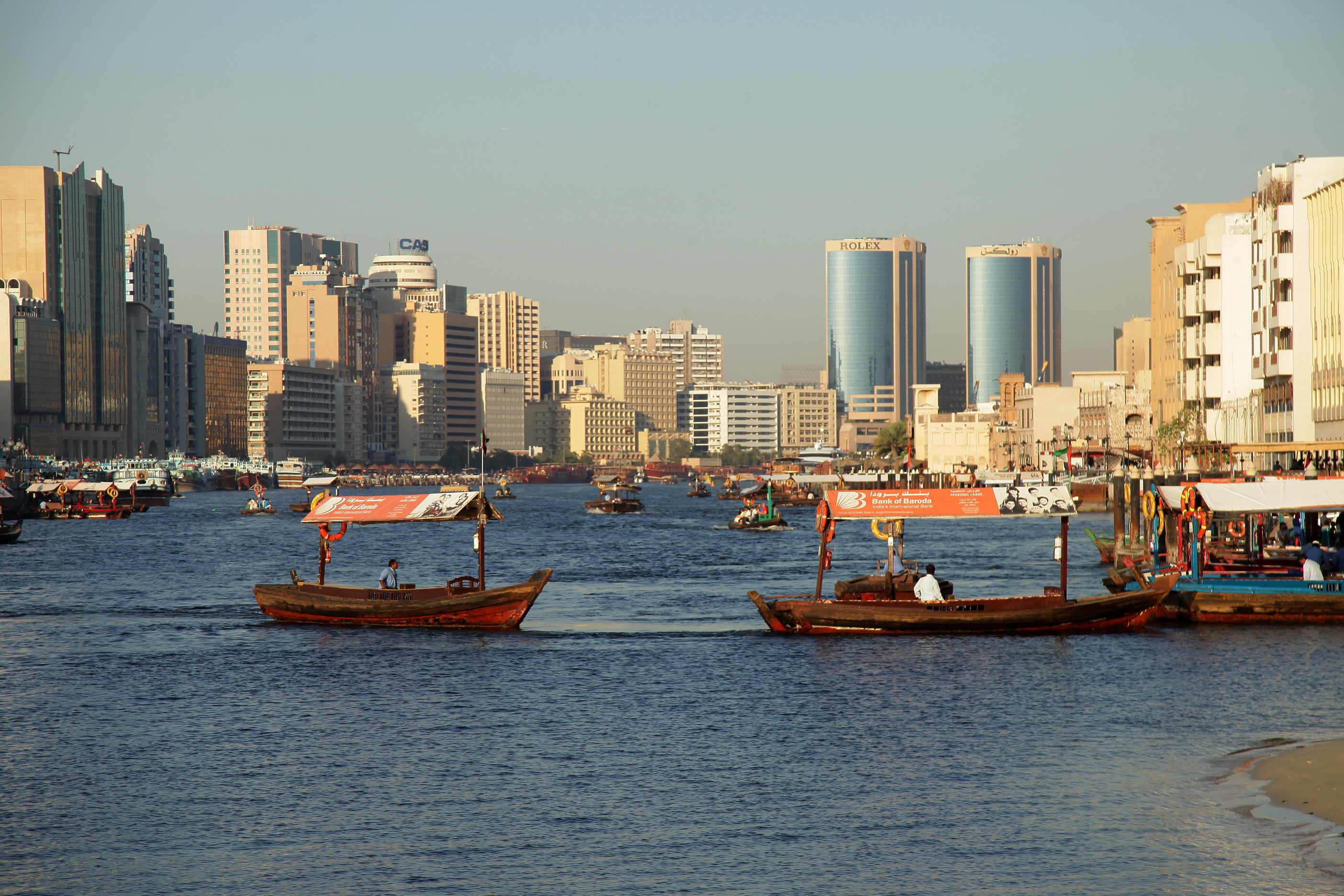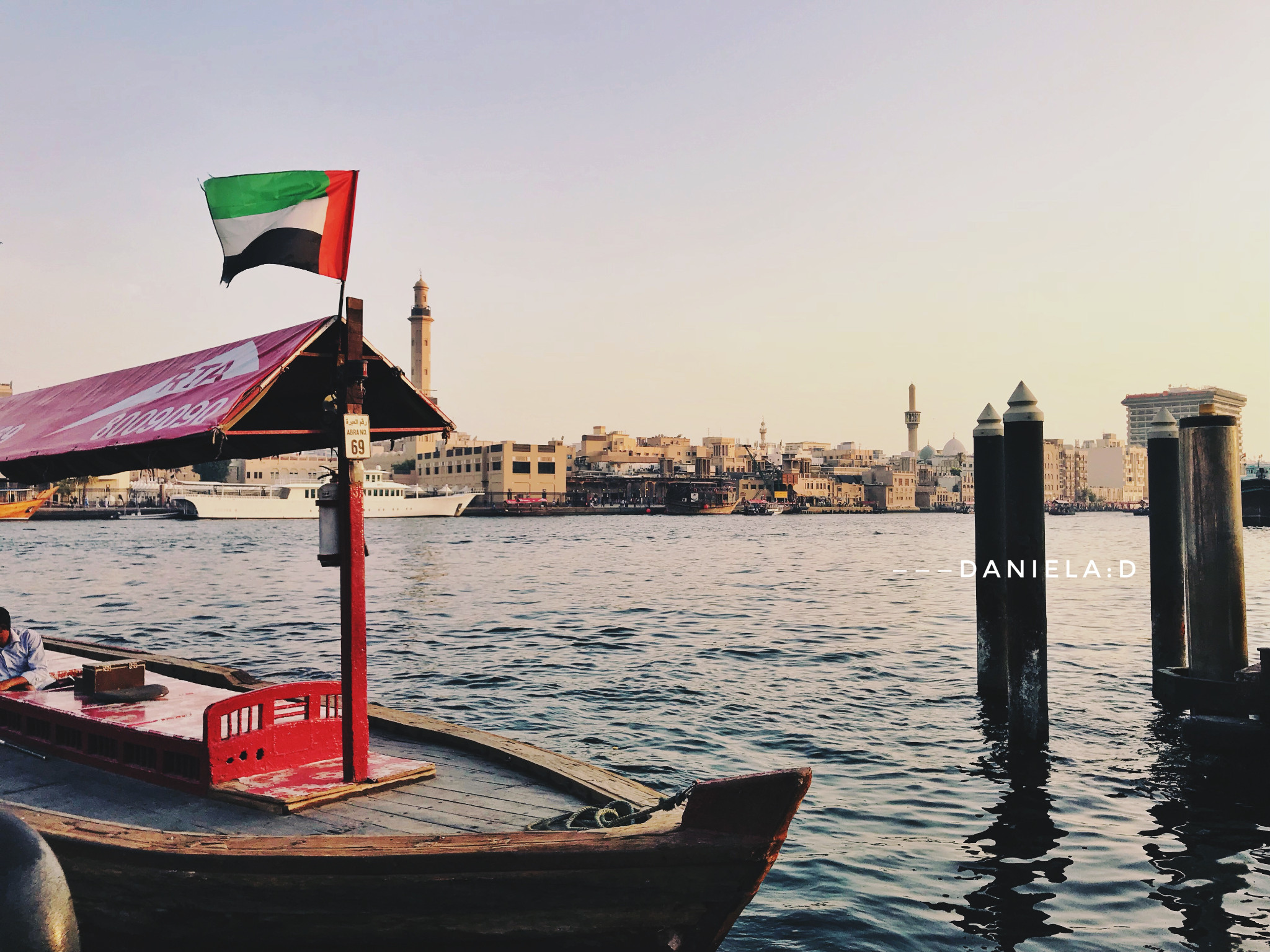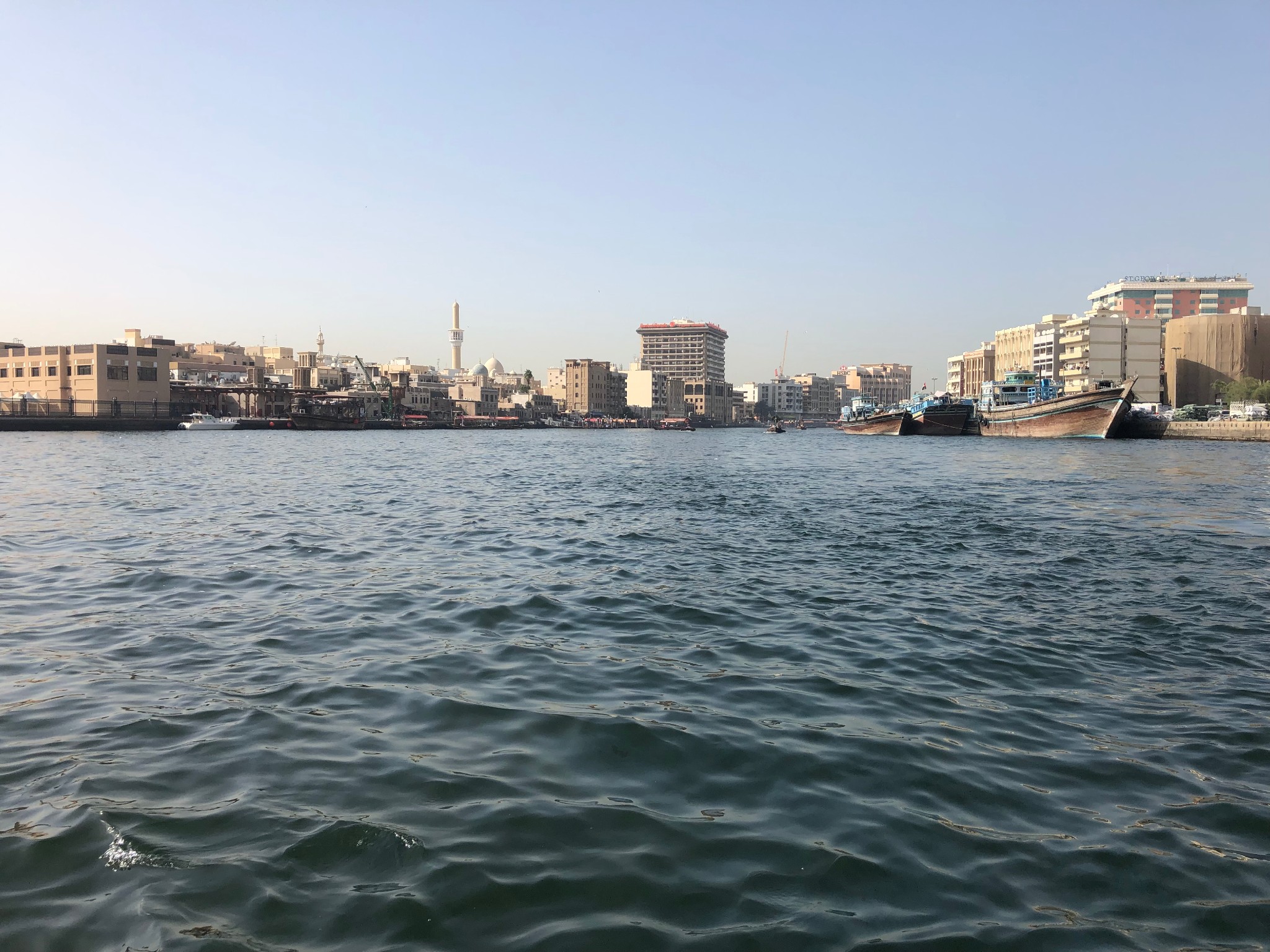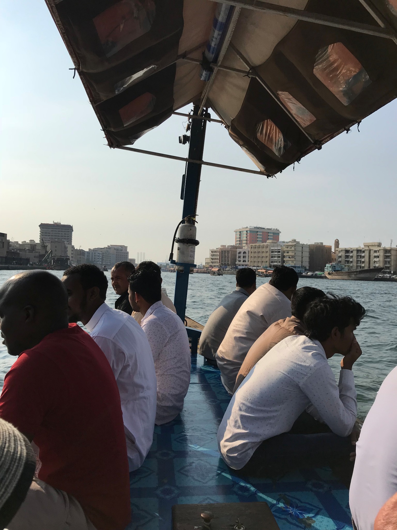 乘坐迪拜湾上的阿布拉船(Abra)穿越迪拜湾,其实就是当地人的轮渡,船费1AED/人,孩子们免费,记得准备好零钱。迪拜河的水非常之清,还有海鸟在河上飞。