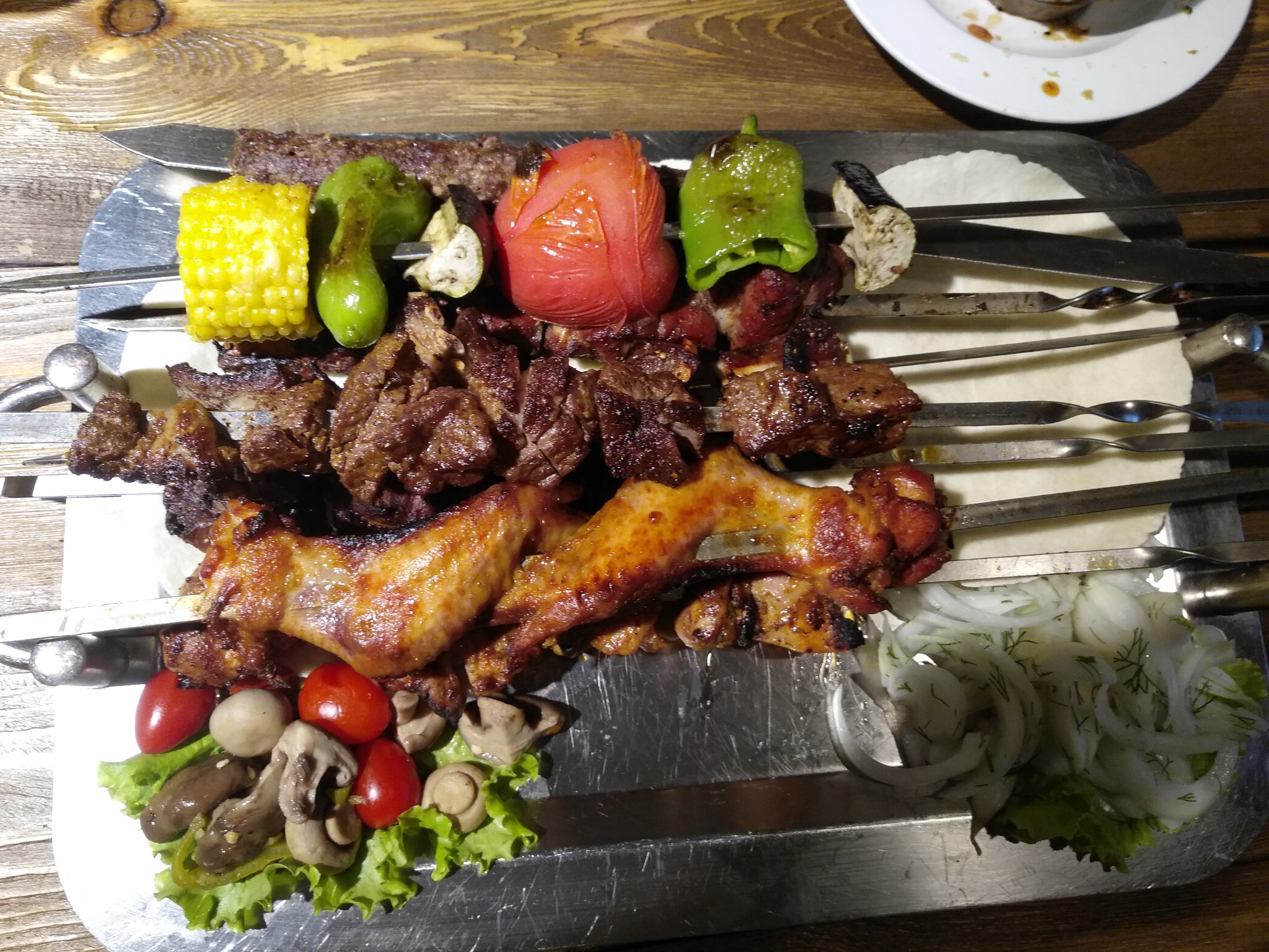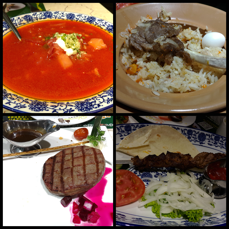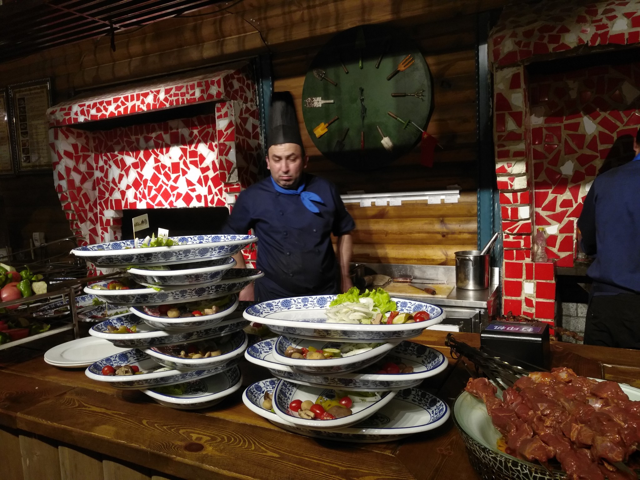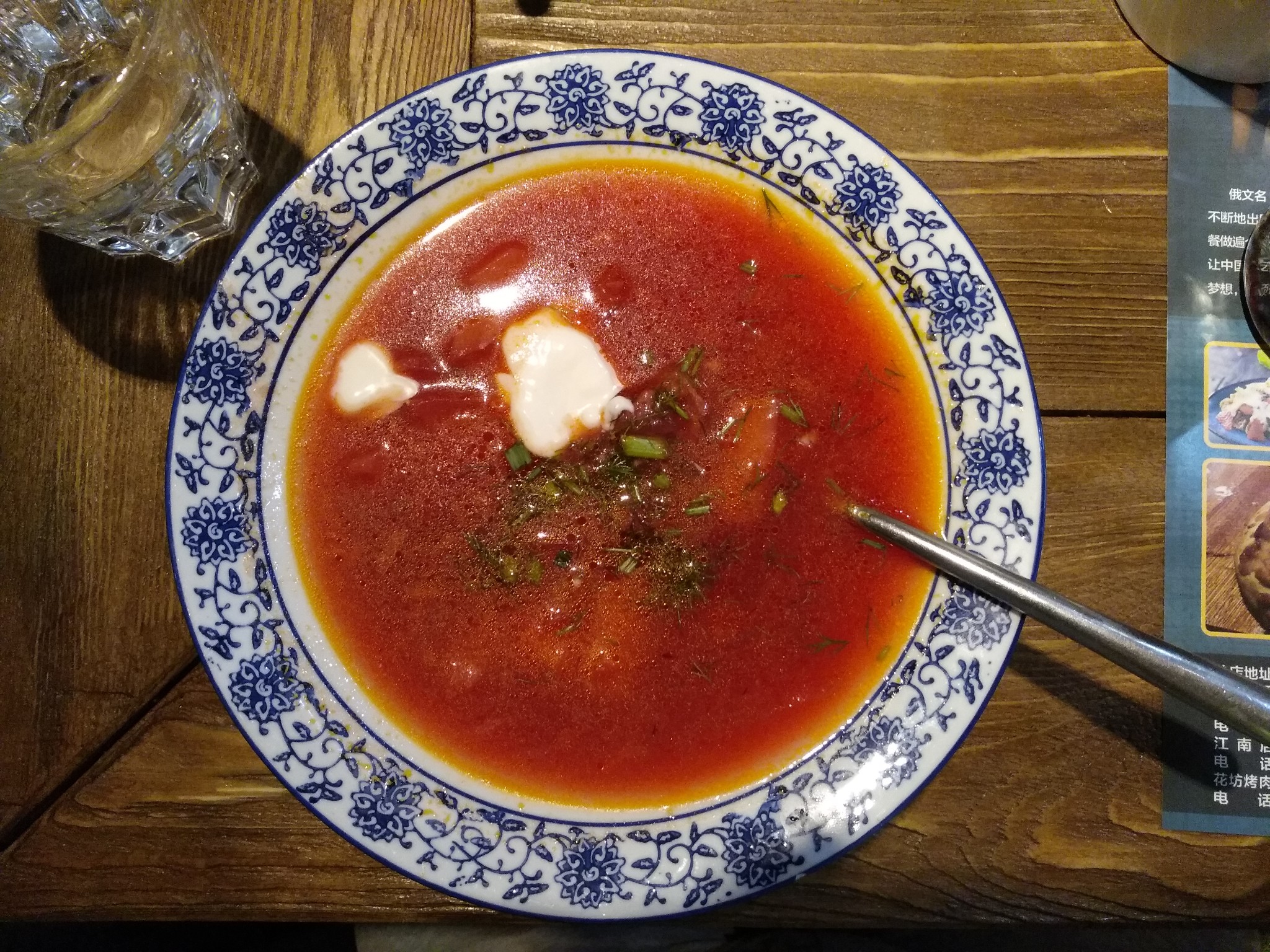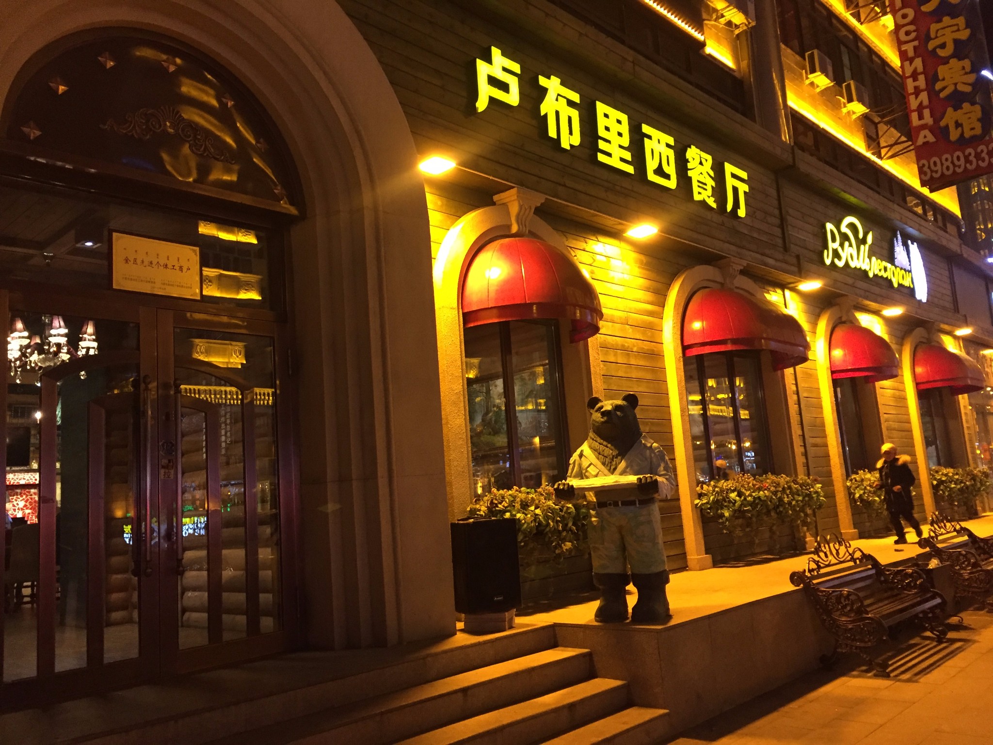当地美食排行榜第一名的正宗西餐厅。一进店,感觉自己身处异国,服务员大部分是俄罗斯的帅哥美女,店内装饰也是俄罗斯风情,厨师也都是清一水的俄罗斯人。我们的菜单:乌克兰红菜汤,俄式碳烤香肠,卢布里奶酪包,水果沙拉,牛排,鸡排,卢布里烤大串。菜量很大,价格人均差不多80左右。红菜汤比较清爽,番茄汤底,加了茴香,香味浓郁。奶酪饼奶酪充足,跟红菜汤绝配。牛排点了七分熟,刚刚好,不会太老。烤大串里的玉米烤得太好吃了,我一个没抢到。饭后还免费赠送了一个列巴,用小布袋包着,当时吃太撑没尝,在回去的飞机上吃的,结果一吃就后悔,如果当时尝过,肯定会多买点带走。