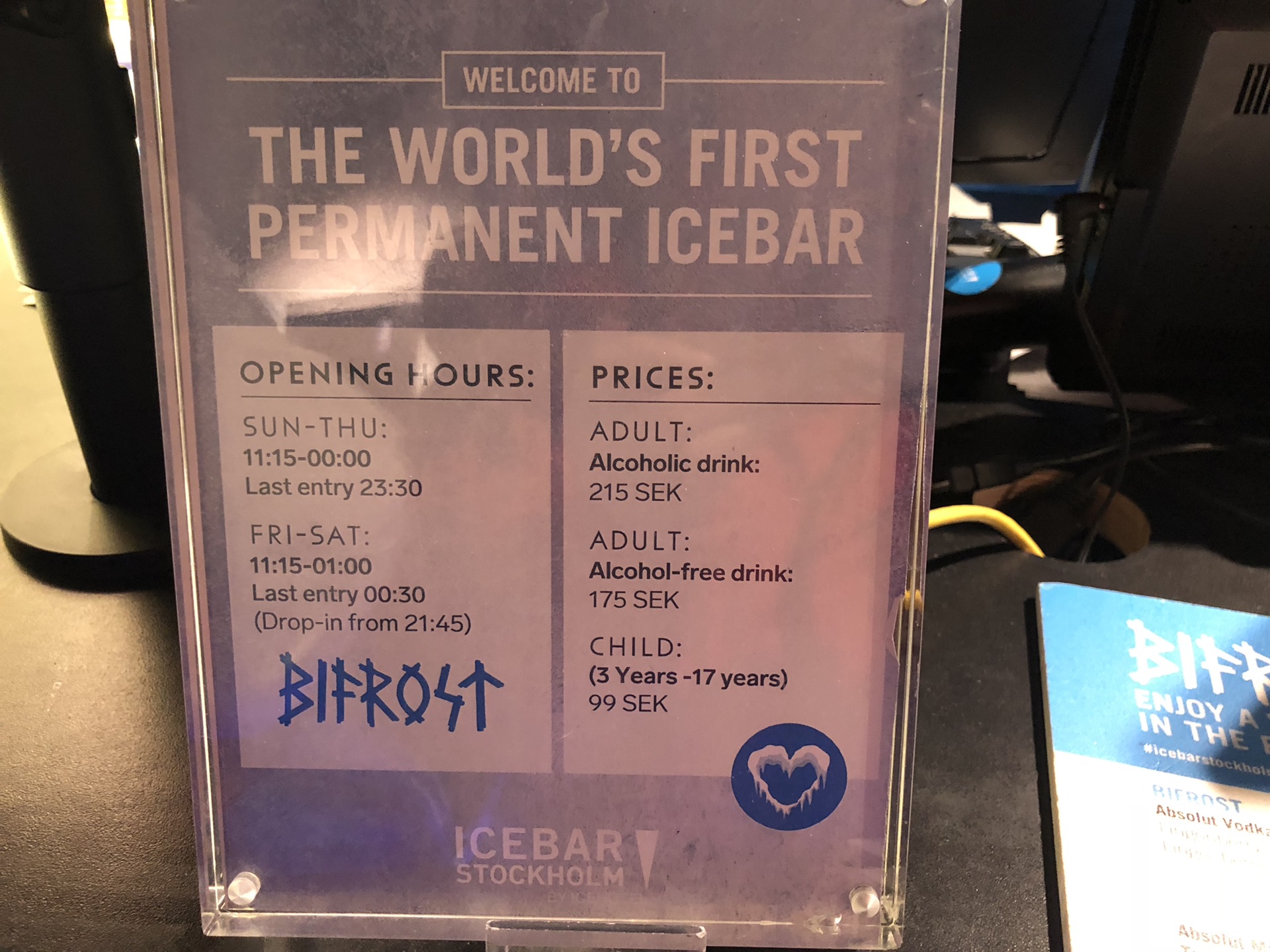 成人是每人175瑞典克朗(包含一杯无酒精的饮料)进入前会给你提供免费的棉衣手套~绝对冰吧,世界上第一个永久性的冰吧,也是斯德哥尔摩最“cool”的酒吧,室内所有东西都是冰做的,从酒柜到整个房间,杯子也是冰做的哟~