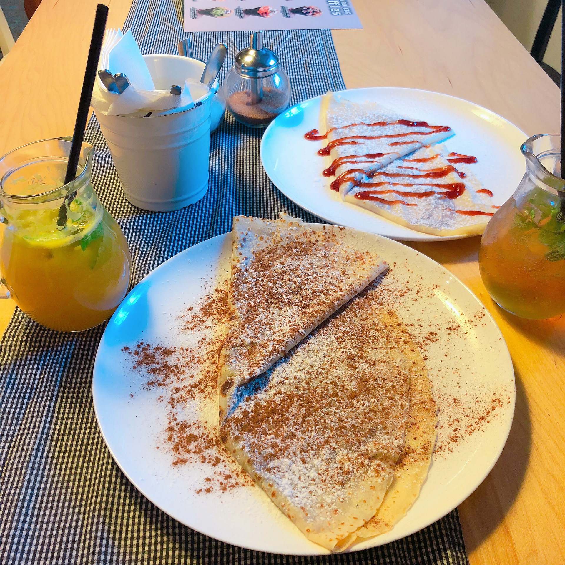 当地特色的一种饼?面皮?我也不知道叫什么,我和朋友都是吃了两口就不吃了,因为太太太甜,而且吃不惯,但是这一家生意特别好,人很多。1星给我点的鲜榨的橙汁苏打水,很好喝,里面有苏打水、鲜榨橙汁、还有薄荷叶和柠檬,我朋友点的好像是红茶,结果她一直喝我的!!推荐指数一星