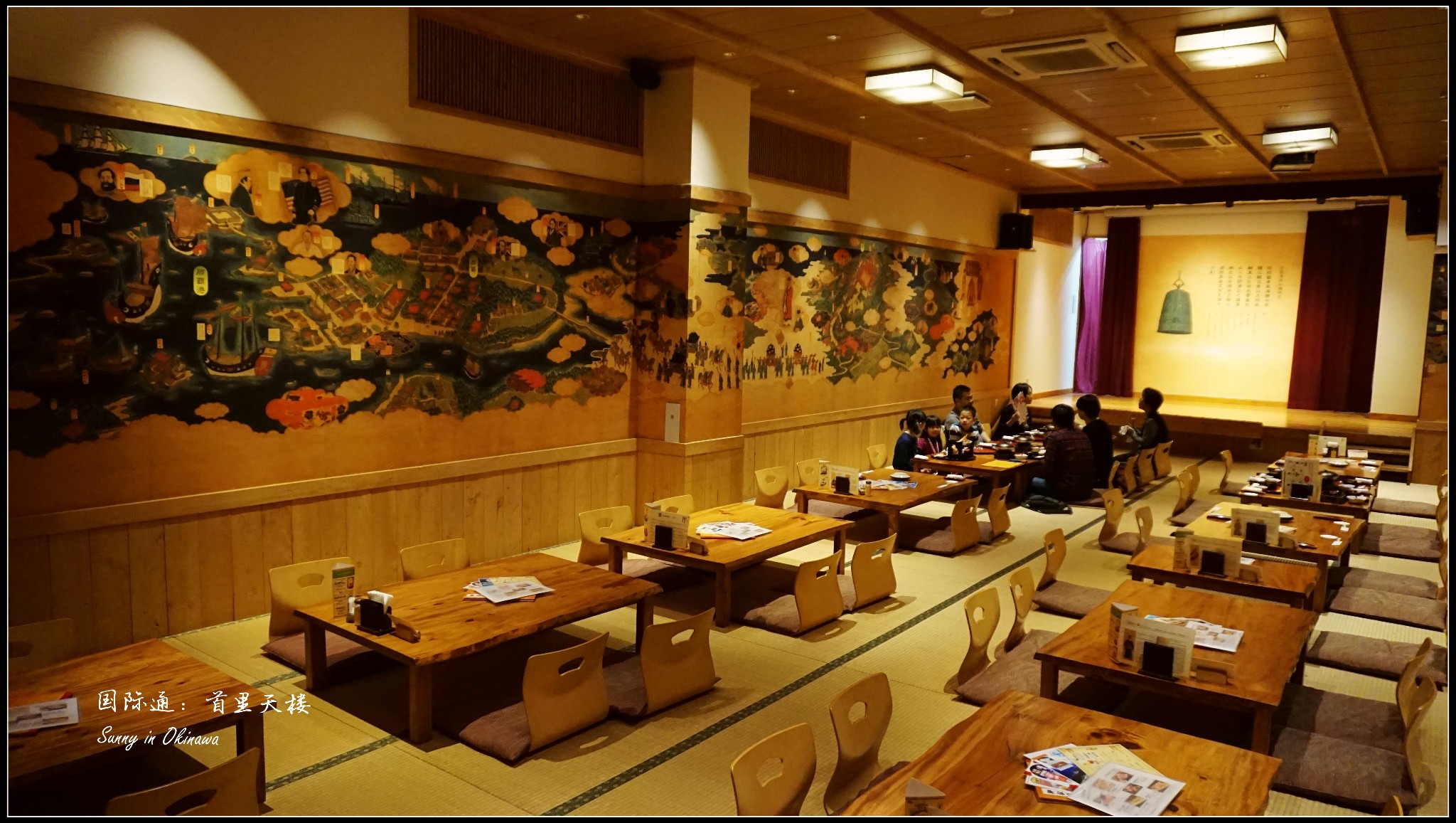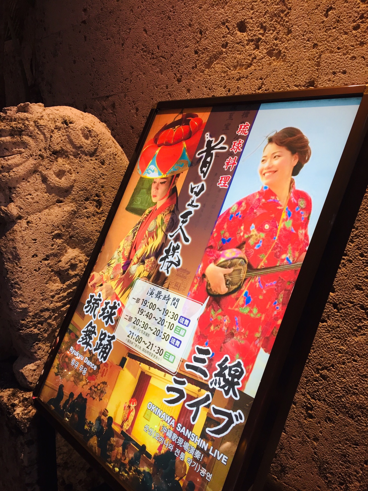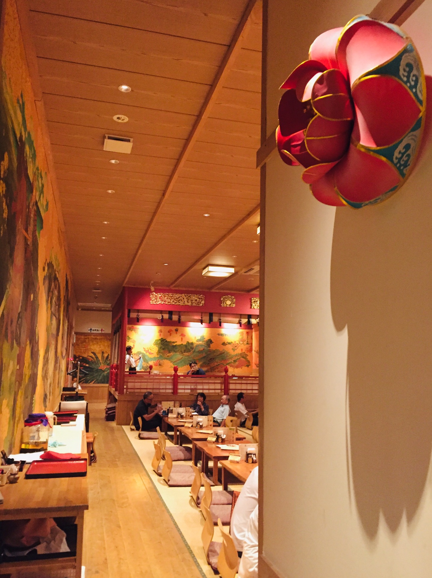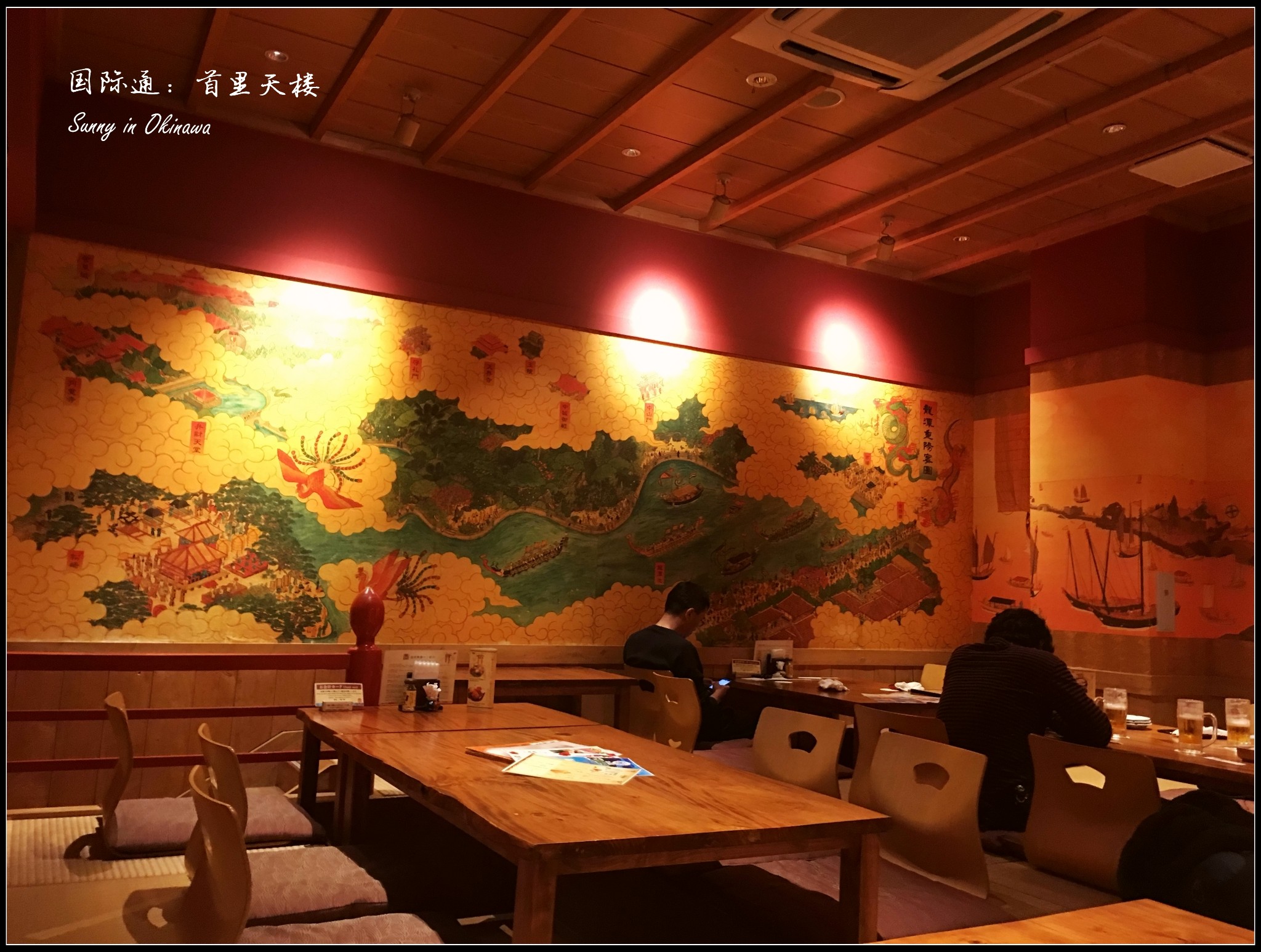 为了不排队,我们直接去了三楼(加收800円服务费)。首里天楼主打冲绳特色,进入就餐区都需要脱鞋。三楼满墙色彩丰裕的装饰画,有中国有琉球。点菜时,指着有中文有图示的菜单与服务员沟通还算顺畅,但是上菜很慢,而且服务员漏记了菜品。餐前的纳豆意外的好吃;刺身中章鱼口感最好;海葡萄难以形容不过不是难以接受;特色的炙肉寿司中规中矩,猪肉的比牛肉强;冲绳红烧肉有点东坡肉的味道;牛排炙烤后味道中平,但是只有四块,完全不够吃。七点,舞台上准时开始了琉球俑舞的表演,还好不是琉球村里那种极慢的舞蹈形式,要欢快活泼得多,带着乡土气息,载歌载舞,很有气氛