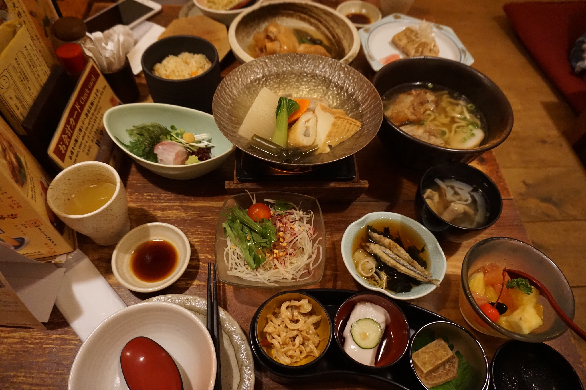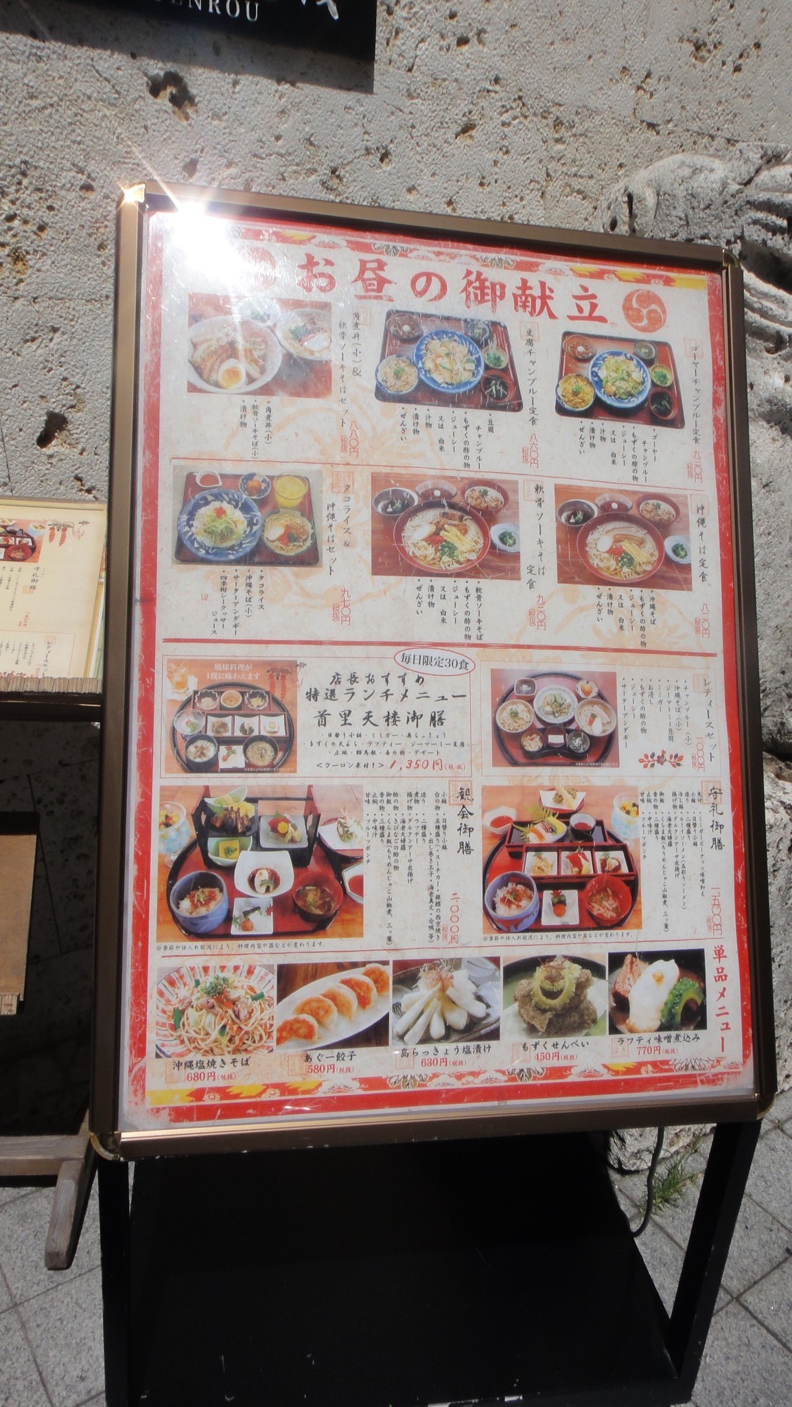 菜色有單點有套餐,套餐最便宜的3000日元到最貴的10000日元都有,裏面還有琉球歌舞表演(我們沒有看)點了個最便宜的套餐,味道其實一般般,這裏是勝在位置優越和名氣,人不算多,所以進店就有坐位。