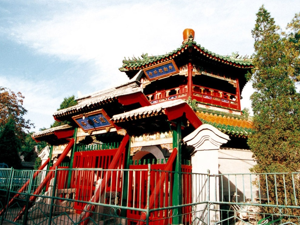 牛街礼拜寺是回族伊斯兰建筑,居北京四大清真寺之首。牛街清真寺的总平面布局很有特点。寺在牛街东侧,大殿必须坐西向东,入口就只能设在殿的后面。寺门以望月楼代替,楼前有木牌楼三间,隔街为照壁,以强调入口。