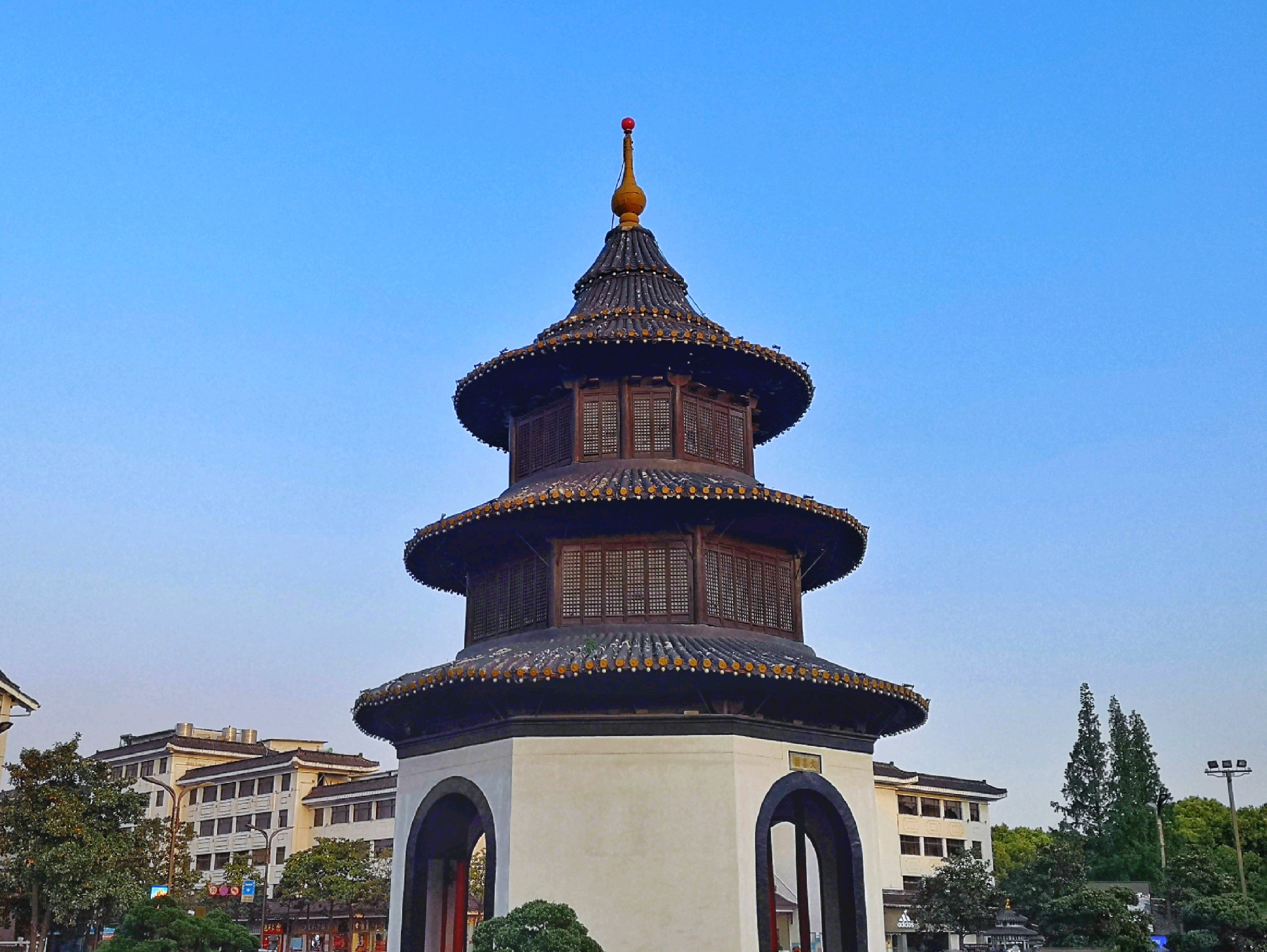 ·文昌阁为八角三级砖木结构建筑,与北京天坛的祈年殿相似;阁的底层,四面辟有拱门,与街道相通,阁的第二三两层,四周虚窗,登楼四眺,远近街景,尽收眼底。