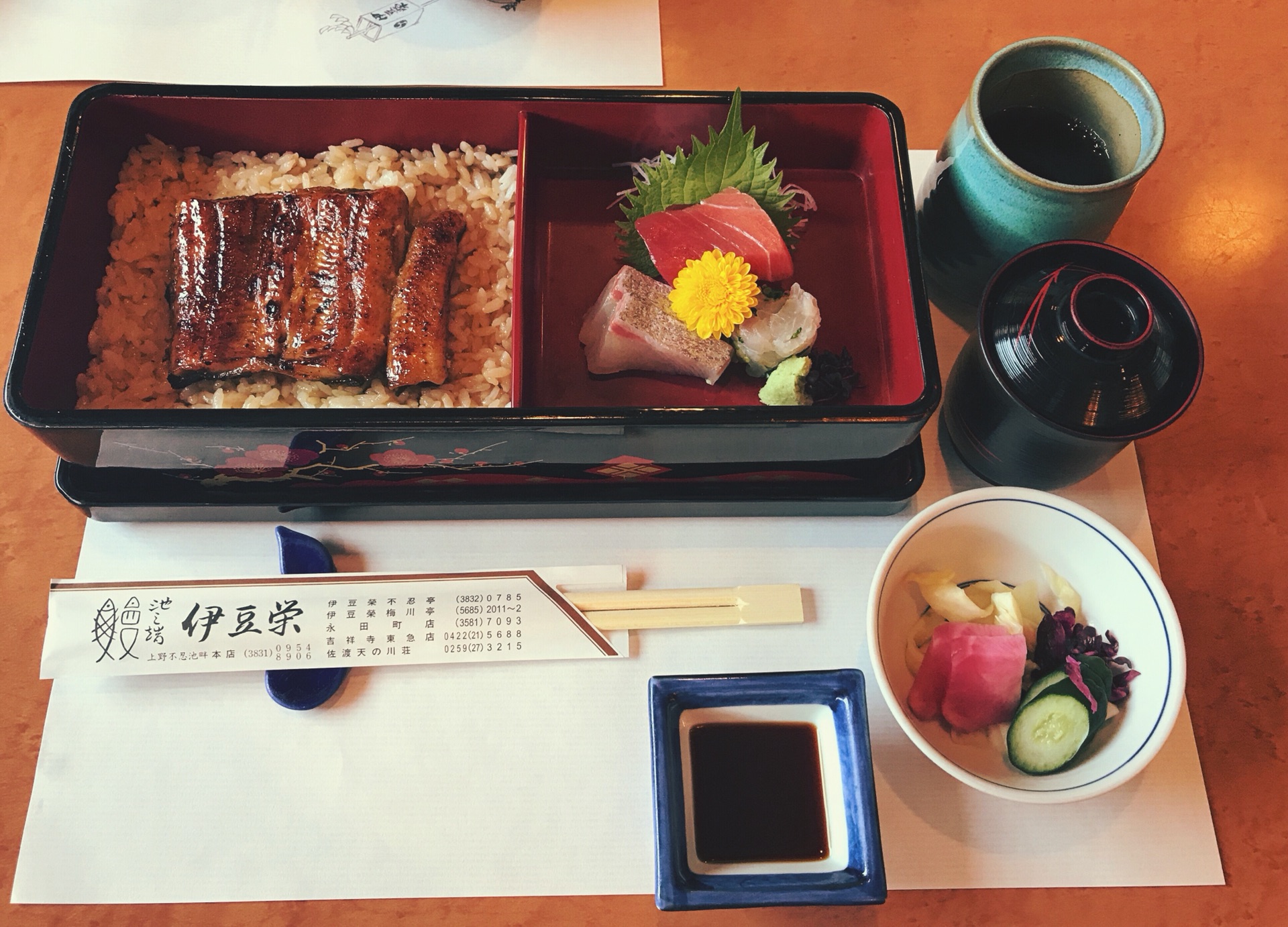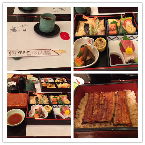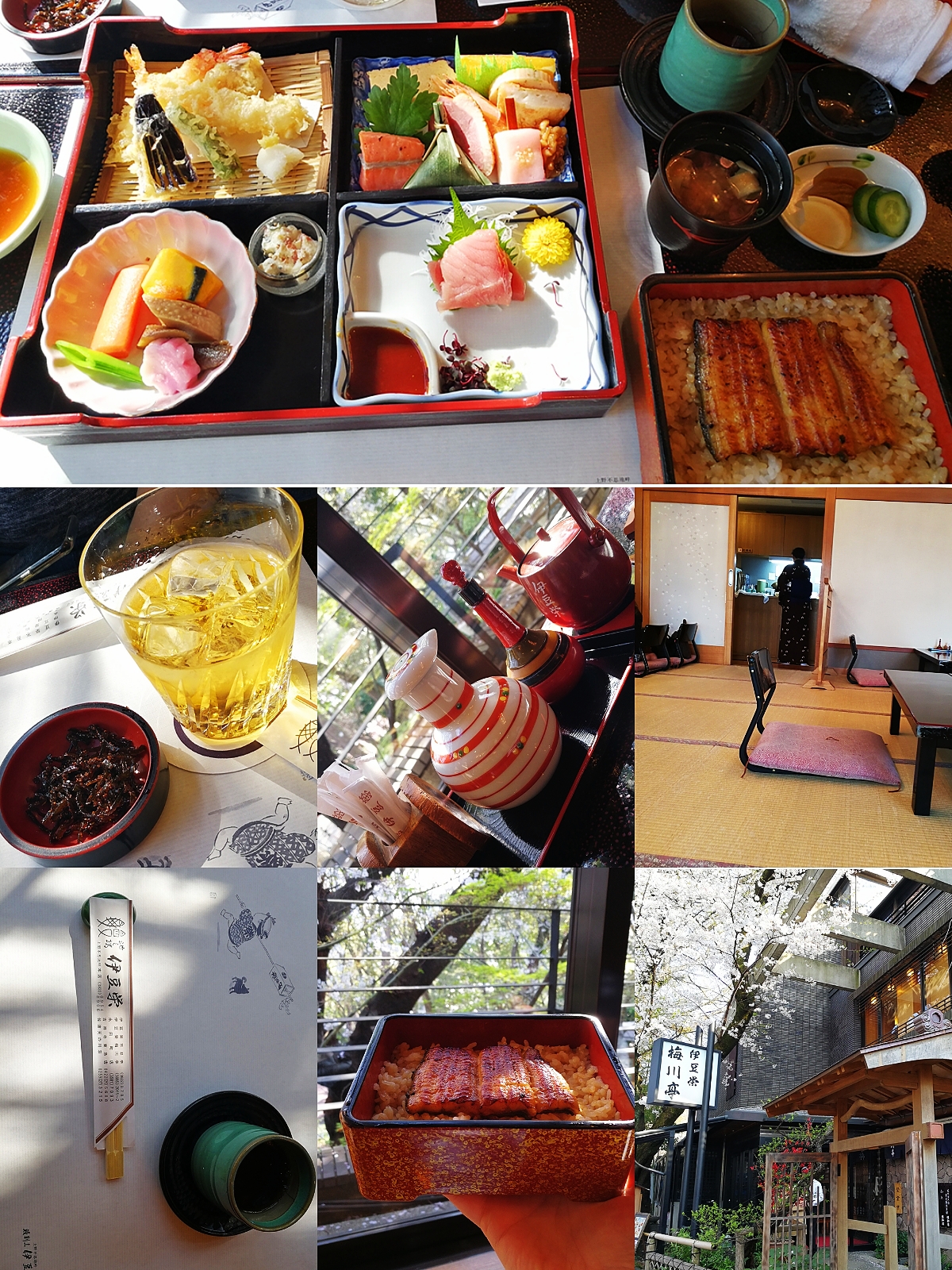 在日本应该算是一家老字号了,想着去日本一定要吃顿鳗鱼饭,逛完上野公园就到了吃中午饭的时间了,上野公园的伊豆荣就隐匿在上野公园的角落,位置很好找,就在路边,中午人不多,没有遇到传说中的排队等位。用餐要脱鞋进去,二楼靠窗的位置可以看到上野公园的美景,店内的摆设精致有趣,里面装潢很有韵味,杯子和餐具都古朴优雅,大家都很安静的用餐,在这种环境中吃完这餐饭,真是视觉与味蕾的双重享受。服务员都是中年妇女,在我们点单的时候是跪到地上听的,为了让顾客不需要抬头看她,这就是典型的日式服务... 。点了4800日元的套餐,盛放鳗鱼饭的都是重器,相当精美。鳗鱼饭做法非常讲究,鳗鱼的油浸入米饭中,好吃!为此专门点了梅子酒,鳗鱼饭配美酒,美哉!