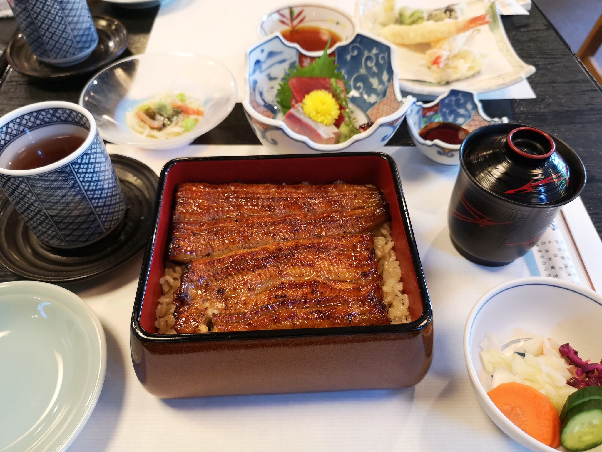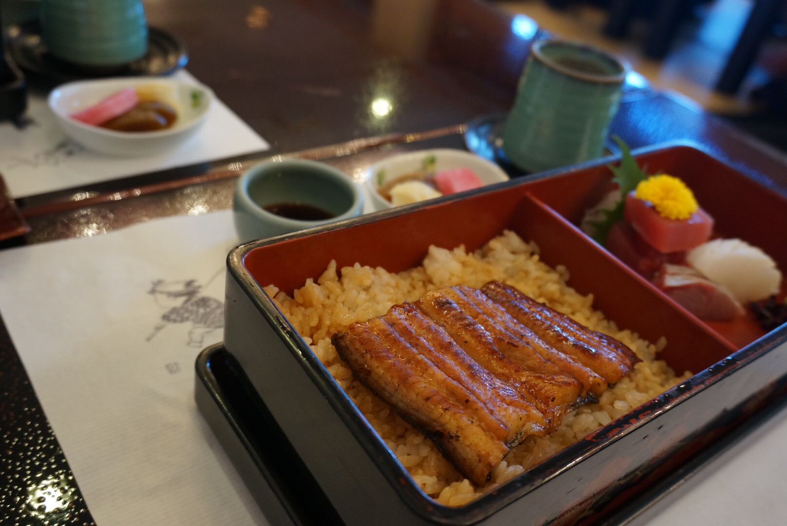 这家有着上百年历史的烤鳗鱼老店,鳗鱼都是活杀现烤,怎能不去试试。同伴要了这个天妇罗套餐,刺身也超好吃的,我的话就选了本店招牌鳗鱼饭啊,鳗鱼大到满足~~店里的服务人员态度超好,有许多年纪稍长的阿姨都是服务员,但都穿了和服,化了精致的妆,举手投足都很优雅。一楼里有许多有趣的摆设,等位的时候可以看看。