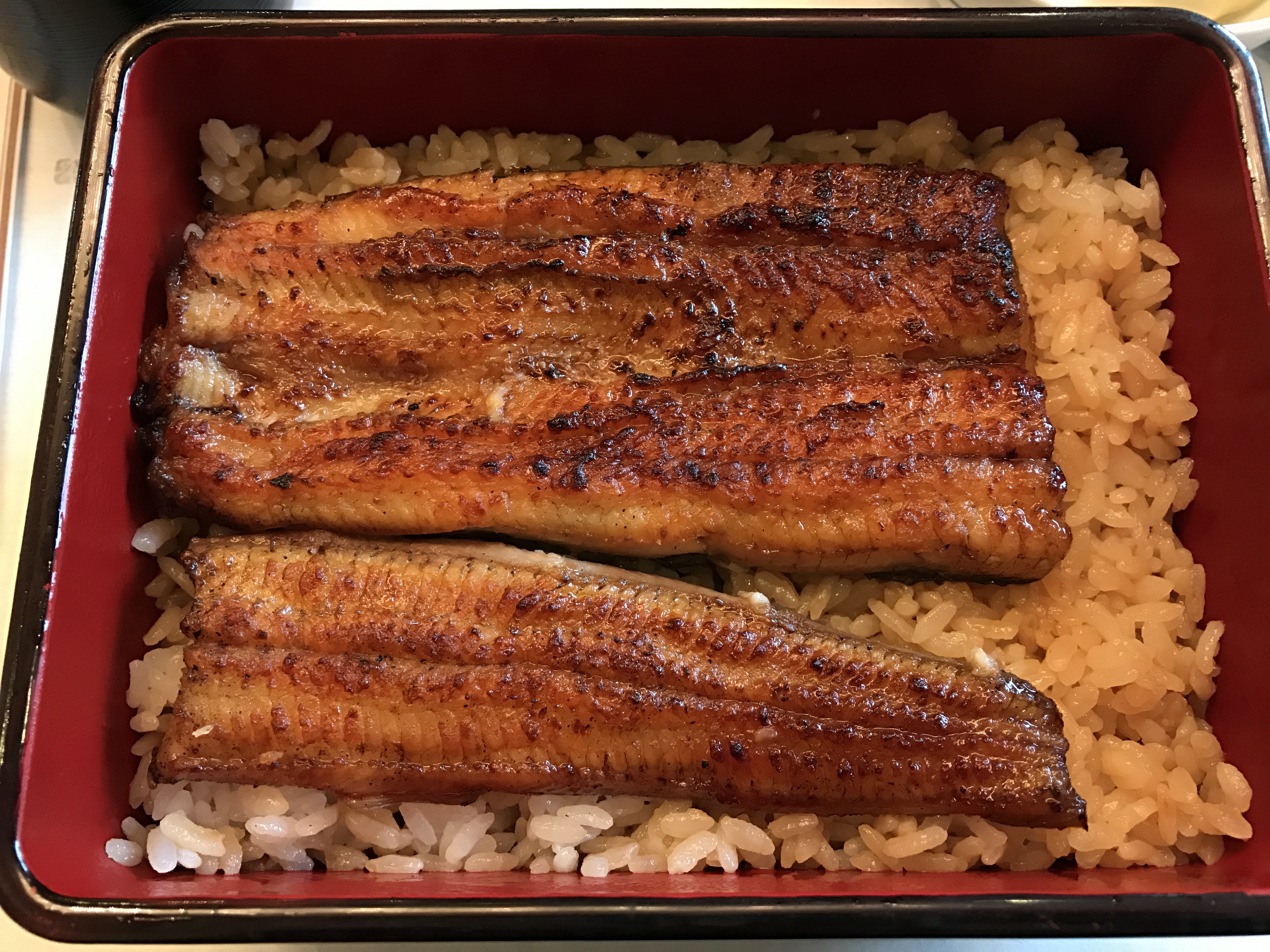 午餐是在伊豆荣梅川亭用的,在上野公园内。不愧是老牌鳗鱼店,我们到的时间不早了,但门口排队的人还有很多。运气很好,我们到了不久后,就不接受排队了。轮到我们,拿到餐单,计算了下鳗鱼克数与价钱,我们点了一份鳗鱼最多的三重鳗鱼饭+一份鳗鱼量最少的饭。这样算下来是最划算的。座位是很传统的日式,需要跪坐的那种。我们肯定选择盘腿而坐,旁边有 日本 客人确实是跪坐吃饭的。这是我吃过的最好吃的鳗鱼饭,确实名不虚传。鳗鱼丰腴多汁,整个本味弥漫齿间,火候也恰到好处。这家店非常推荐,本店在上野公园门口不远处,钢筋水泥林中,环境必然不如梅川亭。