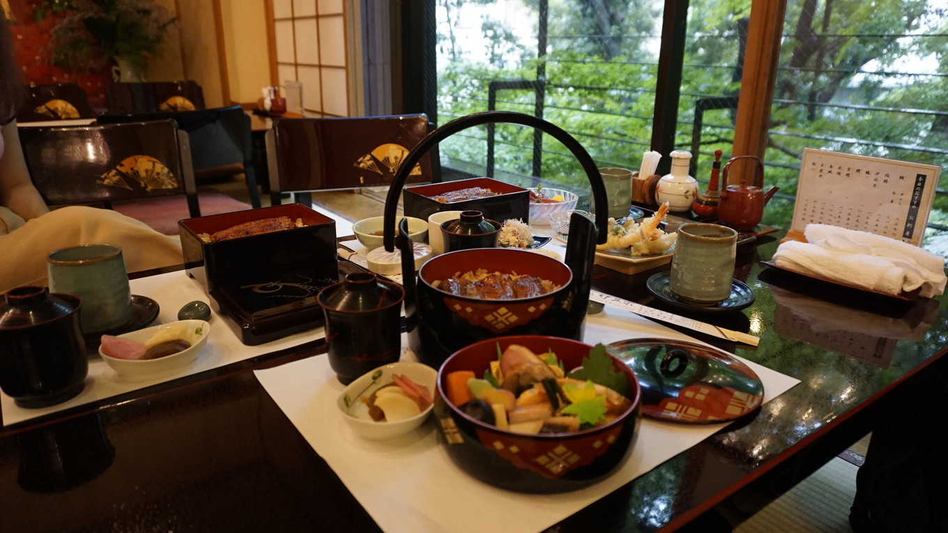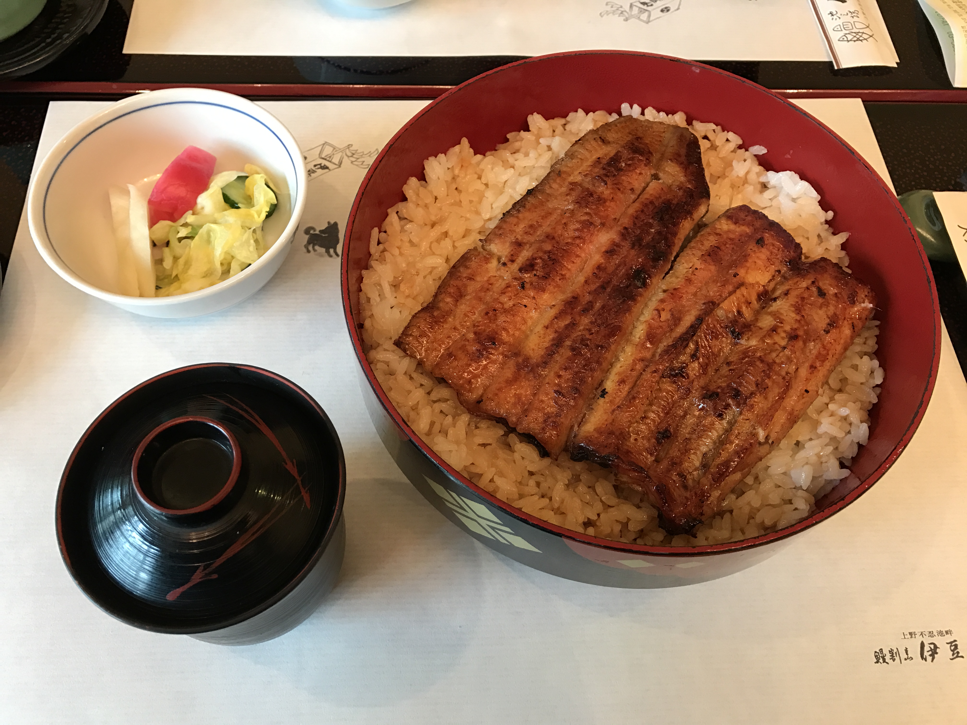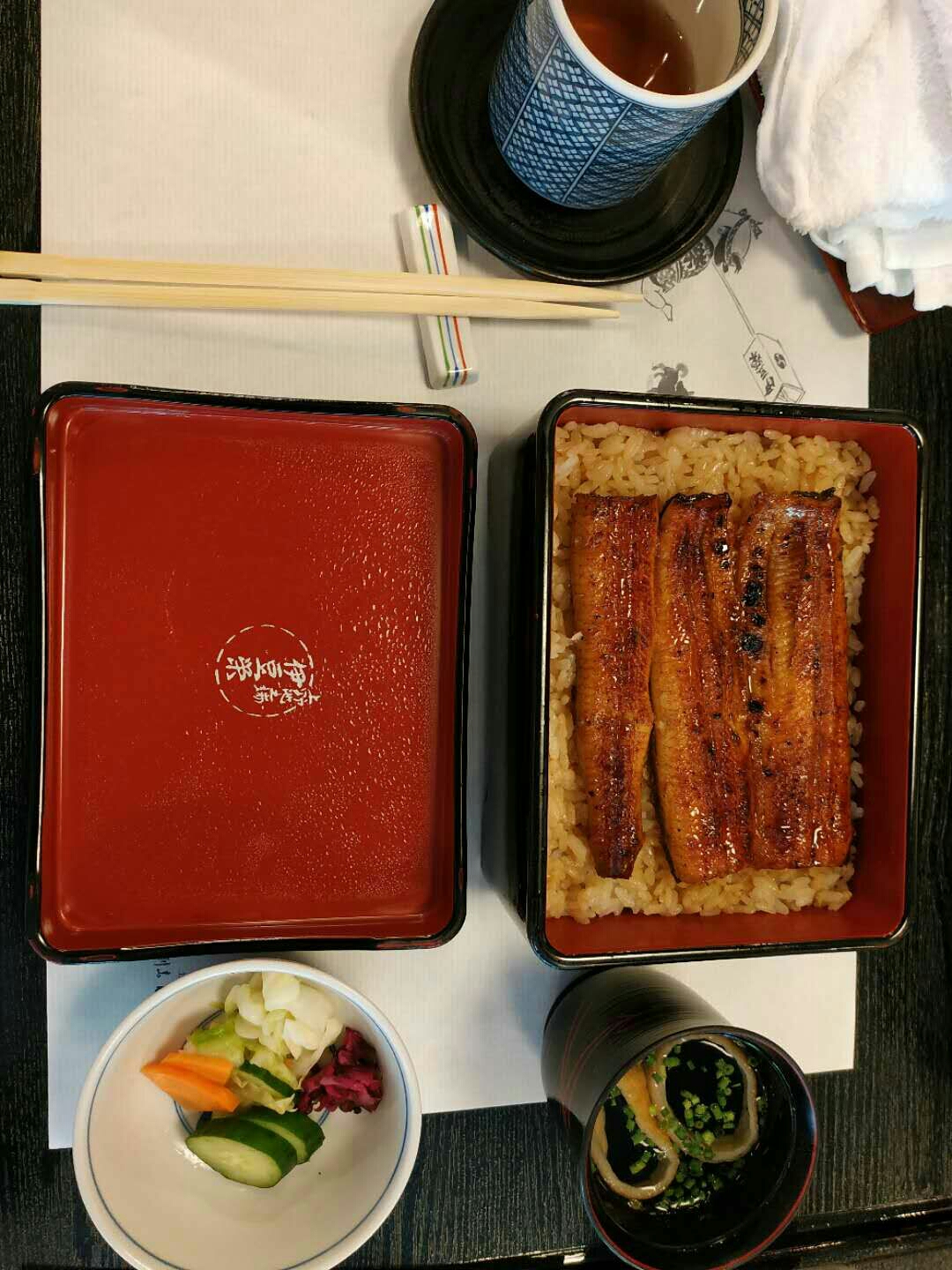 沿着上野公园里的主道走了一小段,就会看到路边立着指示牌,跟着指示牌继续往前走不远,就看到一幢二层日式小楼和周围清幽的环境融为一体,让人不禁心生欢喜。进去后,马上有身穿和服打扮优雅得体的中年大姐迎过来,帮我们换鞋,然后侍应生再领我们入座。我们最终坐在了二层靠窗边的位置,抬眼往窗外望去,一片绿意袭来,窗外的绿色还倒映在餐桌上,让人不由感叹能在此景的陪伴下吃饭是多么幸福的一件事呀我跟朋友都点了鳗鱼饭,套餐的内容有细微的差别,我另单独点了汤,折合人民币一人约莫200多一点。很快,服务生就把香气扑鼻的鳗鱼饭端上了餐桌。鳗鱼的色泽烤的极好,幽香扑鼻,让人食指大动。终于吃到了向往已久的鳗鱼饭,我不忍“狼吞虎咽”,静下心来细细品尝,鳗鱼入口即化,口感细腻,就着汤汁和腌菜,米饭也不会显得单调又或是过于油腻,一顿饭下来,仍让我觉得意犹未尽。