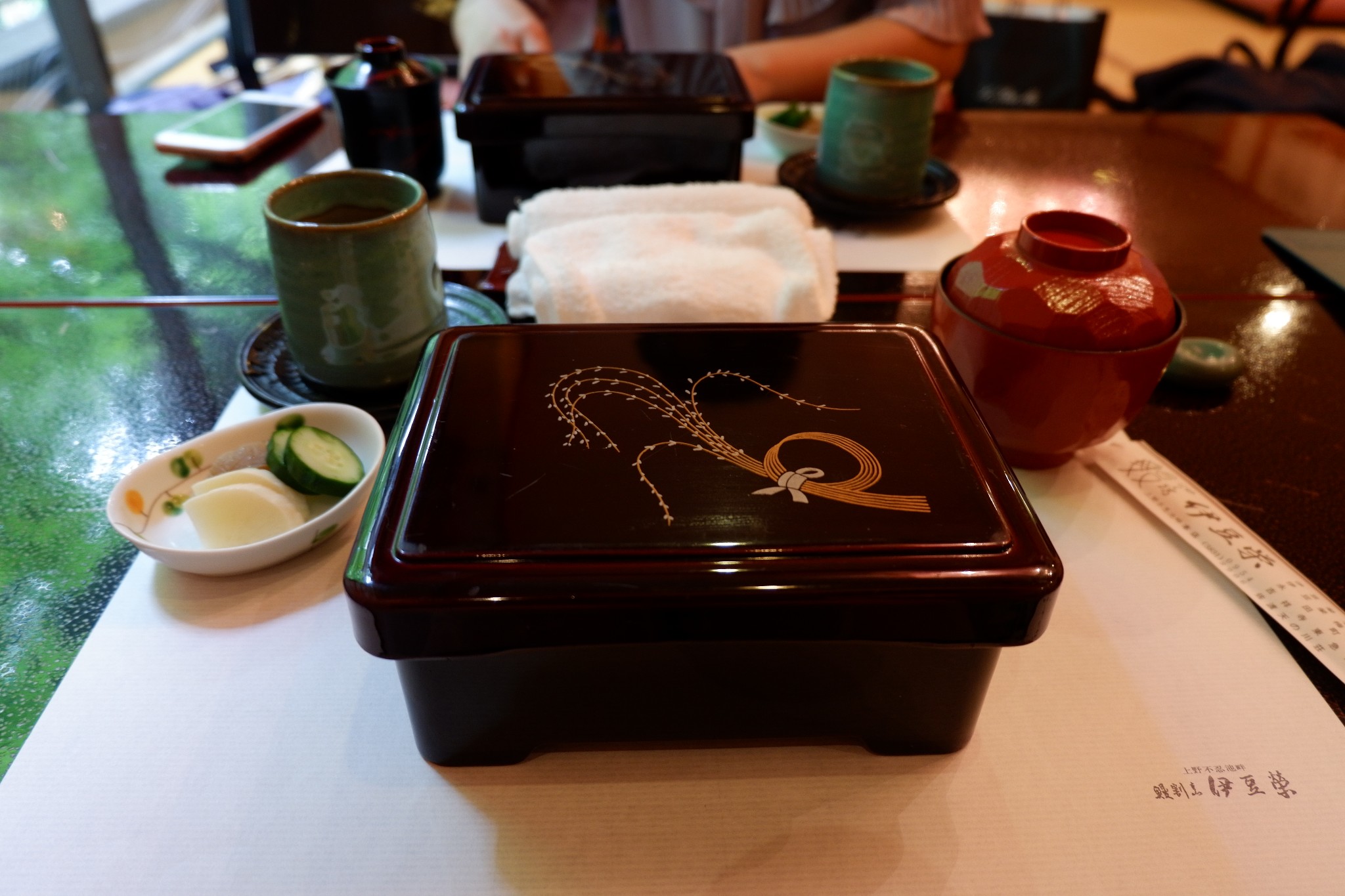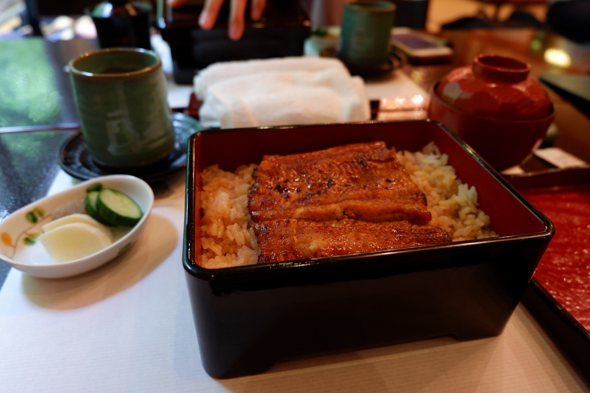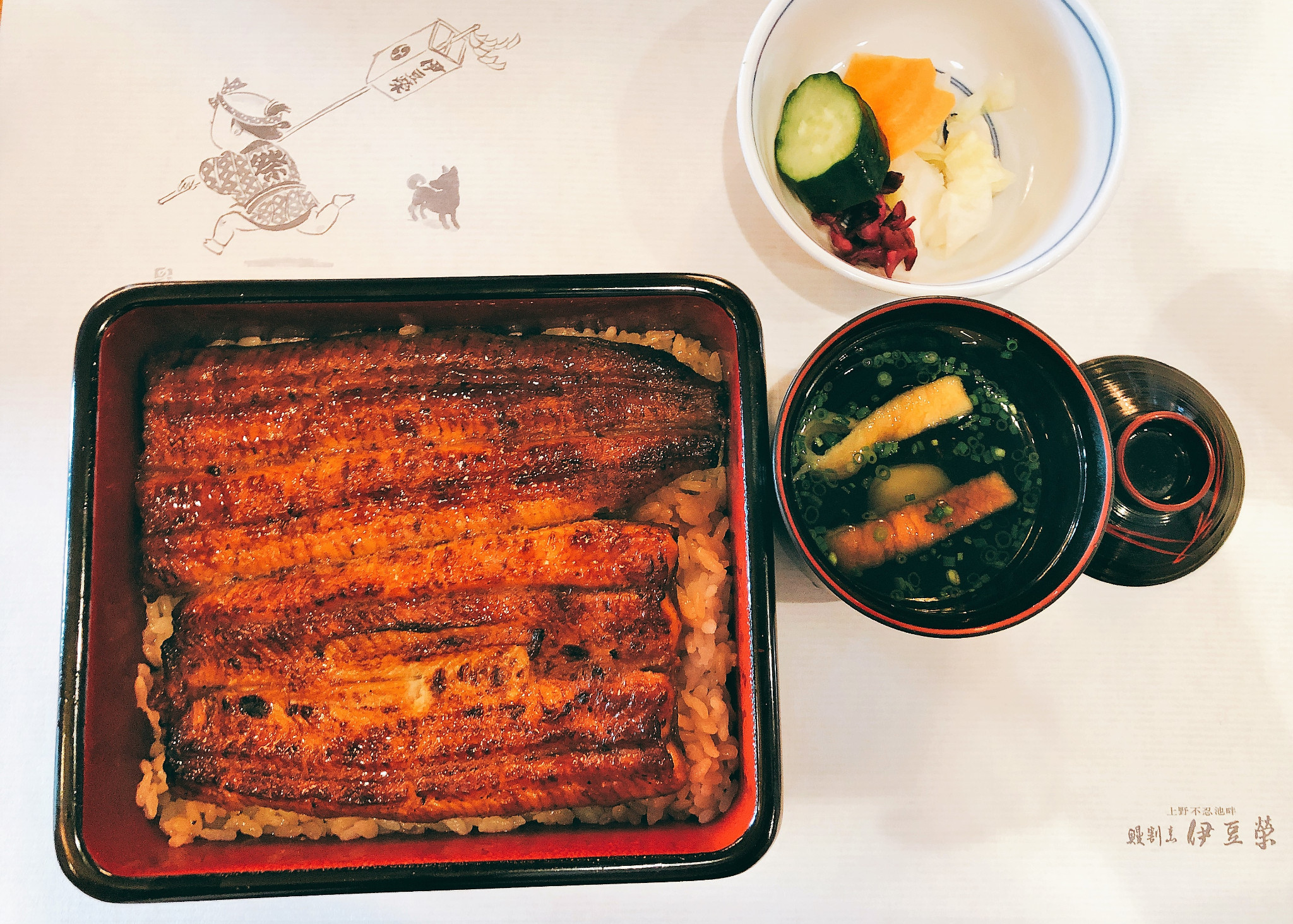 沿着上野公园里的主道走了一小段,就会看到路边立着指示牌,跟着指示牌继续往前走不远,就看到一幢二层日式小楼和周围清幽的环境融为一体,让人不禁心生欢喜。进去后,马上有身穿和服打扮优雅得体的中年大姐迎过来,帮我们换鞋,然后侍应生再领我们入座。我们最终坐在了二层靠窗边的位置,抬眼往窗外望去,一片绿意袭来,窗外的绿色还倒映在餐桌上,让人不由感叹能在此景的陪伴下吃饭是多么幸福的一件事呀我跟朋友都点了鳗鱼饭,套餐的内容有细微的差别,我另单独点了汤,折合人民币一人约莫200多一点。很快,服务生就把香气扑鼻的鳗鱼饭端上了餐桌。鳗鱼的色泽烤的极好,幽香扑鼻,让人食指大动。终于吃到了向往已久的鳗鱼饭,我不忍“狼吞虎咽”,静下心来细细品尝,鳗鱼入口即化,口感细腻,就着汤汁和腌菜,米饭也不会显得单调又或是过于油腻,一顿饭下来,仍让我觉得意犹未尽。
